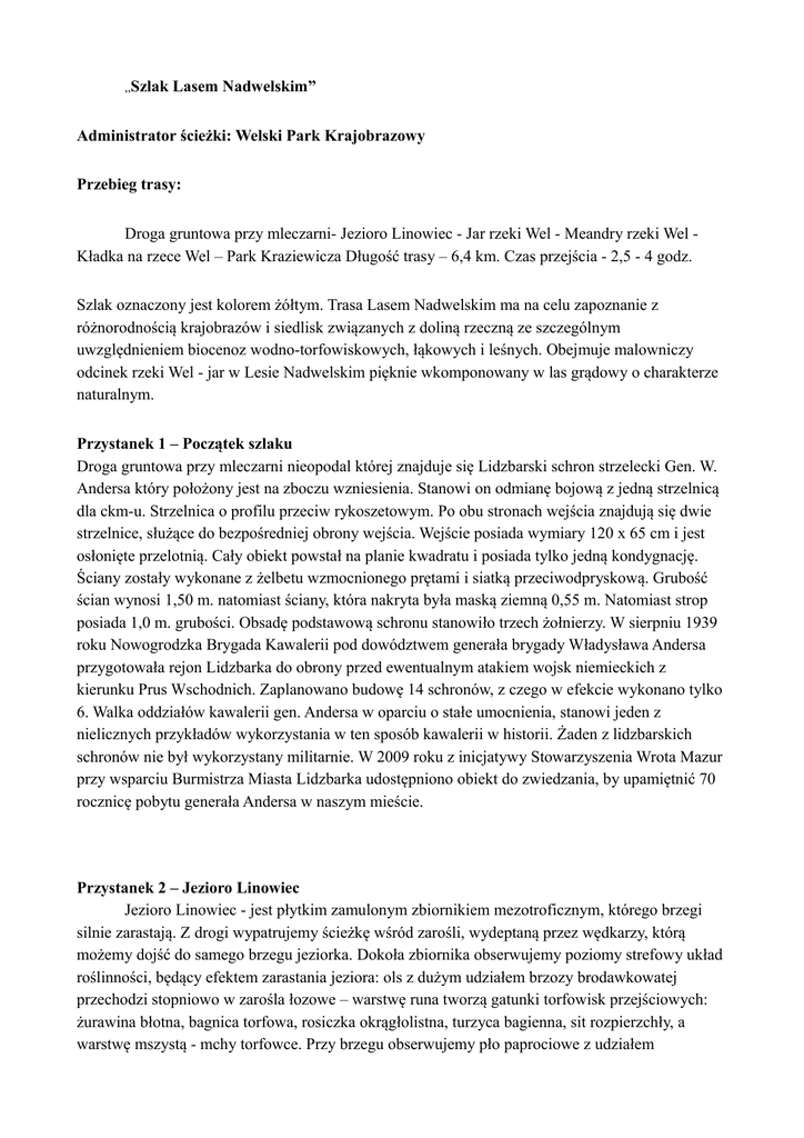 ,,Szlak Lasem Nadwelskim” Administrator ścieżki: Welski Park Krajobrazowy Przebieg trasy: Droga gruntowa przy mleczarni- Jezioro Linowiec - Jar rzeki Wel - Meandry rzeki Wel Kładka na rzece Wel – Park Kraziewicza Długość trasy – 6,4 km. Czas przejścia - 2,5 - 4 godz. Szlak oznaczony jest kolorem żółtym. Trasa Lasem Nadwelskim ma na celu zapoznanie z różnorodnością krajobrazów i siedlisk związanych z doliną rzeczną ze szczególnym uwzględnieniem biocenoz wodno-torfowiskowych, łąkowych i leśnych. Obejmuje malowniczy odcinek rzeki Wel - jar w Lesie Nadwelskim pięknie wkomponowany w las grądowy o charakterze naturalnym. Przystanek 1 – Początek szlaku Droga gruntowa przy mleczarni nieopodal której znajduje się Lidzbarski schron strzelecki Gen. W. Andersa który położony jest na zboczu wzniesienia. Stanowi on odmianę bojową z jedną strzelnicą dla ckm-u. Strzelnica o profilu przeciw rykoszetowym. Po obu stronach wejścia znajdują się dwie strzelnice, służące do bezpośredniej obrony wejścia. Wejście posiada wymiary 120 x 65 cm i jest osłonięte przelotnią. Cały obiekt powstał na planie kwadratu i posiada tylko jedną kondygnację. Ściany zostały wykonane z żelbetu wzmocnionego prętami i siatką przeciwodpryskową. Grubość ścian wynosi 1,50 m. natomiast ściany, która nakryta była maską ziemną 0,55 m. Natomiast strop posiada 1,0 m. grubości. Obsadę podstawową schronu stanowiło trzech żołnierzy. W sierpniu 1939 roku Nowogrodzka Brygada Kawalerii pod dowództwem generała brygady Władysława Andersa przygotowała rejon Lidzbarka do obrony przed ewentualnym atakiem wojsk niemieckich z kierunku Prus Wschodnich. Zaplanowano budowę 14 schronów, z czego w efekcie wykonano tylko 6. Walka oddziałów kawalerii gen. Andersa w oparciu o stałe umocnienia, stanowi jeden z nielicznych przykładów wykorzystania w ten sposób kawalerii w historii. Żaden z lidzbarskich schronów nie był wykorzystany militarnie. W 2009 roku z inicjatywy Stowarzyszenia Wrota Mazur przy wsparciu Burmistrza Miasta Lidzbarka udostępniono obiekt do zwiedzania, by upamiętnić 70 rocznicę pobytu generała Andersa w naszym mieście. Przystanek 2 – Jezioro Linowiec Jezioro Linowiec - jest płytkim zamulonym zbiornikiem mezotroficznym, którego brzegi silnie zarastają. Z drogi wypatrujemy ścieżkę wśród zarośli, wydeptaną przez wędkarzy, którą możemy dojść do samego brzegu jeziorka. Dokoła zbiornika obserwujemy poziomy strefowy układ roślinności, będący efektem zarastania jeziora: ols z dużym udziałem brzozy brodawkowatej przechodzi stopniowo w zarośla łozowe – warstwę runa tworzą gatunki torfowisk przejściowych: żurawina błotna, bagnica torfowa, rosiczka okrągłolistna, turzyca bagienna, sit rozpierzchły, a warstwę mszystą - mchy torfowce. Przy brzegu obserwujemy pło paprociowe z udziałem narecznicy błotnej, trzciny, pałki szerokolistnej, turzycy prosowej i siedmiopalecznika błotnego. Powierzchnia jeziora jest miejscem występowania dużych skupisk grzybieni białych, natomiast dno porastają podwodne łąki ramienic. Dale idziemy wzdłuż północno-zachodniego brzegu jeziora, potem w kierunku północnym ścieżką do lasu. Przystanek 3 – Jar rzeki Wel Ścieżką dochodzimy do jaru rzeki Wel - głęboko wciętego koryta rzeki. Ze ścieżki można zejść w dół do rzeki. Potem wracamy na oznaczony szlak, który stopniowo przybliża się do urwistych krawędzi jaru. Deniwelacje terenu dochodzą tutaj do 15 m. Warto zejść nad samą rzekę: woda płynie szybko, powalone drzewa nadają jej posmak dzikości, stanowią też nie lada przeszkodę podczas spływów kajakowych. Jest to jedno z najurokliwszych miejsc w dolinie Welu. Zbocza jaru porasta las grądowy. W warstwie drzew dominuje lipa drobnolistna, grab zwyczajny, dąb szypułkowy i bezszypułkowy z domieszką sosny, natomiast w roślinności runa obecne są: przylaszczka pospolita, złoć żółta, niecierpek drobnokwiatowy, konwalia majowa, zawilec gajowy, szczawik zajęczy, bluszczyk kurdybanek, kopytnik pospolity. Droga rozgałęzia się, idziemy prosto. (Odnoga w lewo prowadzi do śródleśnego torfowiska wysokiego, na którym rośnie wiele chronionych gatunków roślin). Przystanek 6 – Meandry rzeki Wel Rzeka po pokonaniu odcinka przełomowego stopniowo wytraca swą prędkość, staje się leniwa i kręta. Dolinę rzeki porastają tu wilgotne łąki, miejscami przechodzące w siedliska bardziej suche, gdzie występują ciepłolubne gatunki: goździk kartuzek, goździk kropkowany, macierzanka i inne. Można tu często napotkać liczne buchtowiska dzików. Droga prowadzi nas znów do lasu. Przystanek 7 – Kładka na rzece Wel W tym miejscu przechodzimy na drugi brzeg rzeki, który porasta łąka ostrożniowo-wiązówkowa. Idziemy dalej w górę rzeki szlakiem oznaczonym kolorem żółtym. Wracamy wzdłuż jaru rzeki Wel ścieżką, która biegnie częściowo wysokim urwistym brzegiem, częściowo prowadzi przy samym korycie. Uważnie nasłuchując i obserwując brzeg rzeki, możemy zauważyć mieniącego się kolorami zimorodka. Bliżej Lidzbarka, na skraju lasu występują ciepłolubne okrajki z udziałem m.in. goździka kartuzka, goździka kropkowanego i zawciąga pospolitego. Przystanek 8 – Park Kraziewicza Jesteśmy właśnie na ostatnim przystanku (nieopodal pierwszego) naszej wędrówki, którym jest niewielki znajdujący się nad brzegiem rzeki Wel park im. Juliusza Kraziewicza polskiego działacza oświatowo-gospodarczego i pioniera polskich kółek rolniczych.