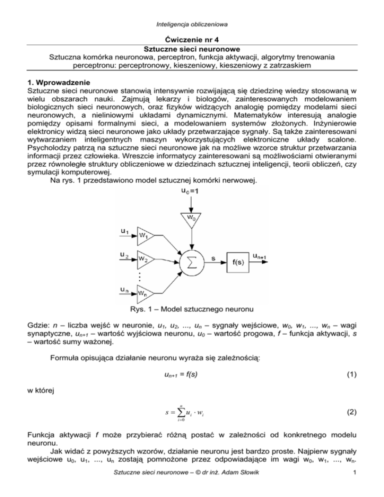Sztuczna komórka neuronowa, perceptron, funkcja aktywacji, algorytmy trenowania