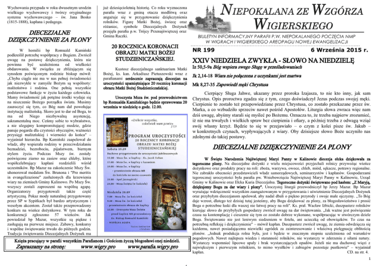 Wychowania przypada w roku dwusetnym urodzin wielkiego wychowawcy i twórcy oryginalnego systemu wychowawczego – św. Jana Bosko (1815-1888), kapłana i pedagoga. DIECEZJALNE DZIĘKCZYNIENIE ZA PLONY W homilii bp Romuald Kamiński podkreślił potrzebę współpracy z Bogiem. Zwrócił uwagę na postawę dziękczynienia, która nie powinna być uzależniona od wielkości obdarowania. W związku ze zbliżającym się synodem poświęconym rodzinie biskup mówił: „Chyba ciągle nie ma w nas pełnej świadomości jak niezwykłe w zamyśle Bożym są wspólnoty: małżeństwo i rodzina. One pełnią wszystkie podstawowe funkcje w życiu każdego człowieka. Mamy świadomość jak potężne środki wydaje się na niszczenie Bożego porządku świata. Musimy zauroczyć się tym, co Bóg nam dał powołując instytucję małżeńską. Skoro jest to dar od Boga, to ma od Niego niezbywalną asystencję, sakramentalną moc. Ceńmy sobie to wybraństwo, a nie ulegajmy kompromitującej modzie, gdzie panuje pogarda dla czystości obyczajów, ważności przysięgi małżeńskiej i wierności do końca" – wyjaśniał hierarcha. Bp Kamiński zaapelował do władz, aby wspierała rodziny w przeciwdziałaniu beznadziei, bezrobociu, pijaństwem, biernym stylem życia. Podczas Mszy św. zostały poświęcone ziarno na zasiew oraz chleby, które współcelebrujący kapłani rozdzielili wśród uczestników. Bp Mazur na zakończenie Mszy Św. uhonorował medalem Św. Brunona i "Pro meritis in evangelizazione" zasłużonych dla krzewienia wiary na ziemiach Gminy Kalinowo. Po Mszy Św. wszyscy zostali zaproszeni na wspólną agapę. Organizatorzy przygotowali także część artystyczną. Pokaz mody naturalnej przygotowany przez SP w Sypitkach był bardzo artystycznym i wesołym akcentem. Został także przeprowadzony konkurs na wieńce dożynkowe. W tym roku do konkurencji zgłoszono 57 wieńców. Jak powiedział bp Mazur, wszystkie są piękne i zasługują na pierwsze miejsce. Zabawy, konkursy i wspólne świętowanie trwało do późnych godzin. Tradycja świętowania Diecezjalnych Dożynek ma już dziesięcioletnią historię. Co roku wyznaczona parafia wraz z gminą otacza modlitwą oraz angażuje się w przygotowanie dziękczynienia rolników. Figurę Matki Bożej, świecę oraz różaniec, symbole Diecezjalnych Dożynek przejęła parafia p.w. Trójcy Przenajświętszej oraz Gmina Raczki. 20 ROCZNICA KORONACJI OBRAZU MATKI BOŻEJ STUDZIENICZAŃSKIEJ. Kustosz diecezjalnego sanktuarium Matki Bożej, ks. kan. Arkadiusz Pietuszewski wraz z parafianami serdecznie zapraszają diecezjan na uroczystości upamiętniające 20 rocznicę koronacji obrazu Matki Bożej Studzieniczańskiej. Uroczysta Msza św. pod przewodnictwem bp Romualda Kamińskiego będzie sprawowana 20 września w niedzielę o godz. 12.00. www.wigry.pro 6 Września 2015 r. XXIV NIEDZIELA ZWYKŁA - SŁOWO NA NIEDZIELĘ Iz 50,5-9a Bóg wspiera swego Sługę w prześladowaniach Jk 2,14-18 Wiara nie połączona z uczynkami jest martwa Mk 8,27-35 Zapowiedź męki Chrystusa Cierpiący Sługa Jahwe, ukazany przez proroka Izajasza, to nie kto inny, jak sam Chrystus. Opis proroctwa zgadza się z tym, czego doświadczył Jezus podczas swojej męki. Cierpienie to zostało też przepowiedziane przez Chrystusa, co zostało przekazane przez św. Marka, a co wzbudziło sprzeciw nawet pośród Apostołów. Liturgia słowa zwraca więc nam dziś uwagę, abyśmy starali się myśleć po Bożemu. Oznacza to, że trzeba najpierw zrozumieć, iż nie ma trwałych i wielkich spraw bez cierpienia i ofiary, a później trzeba z odwagą wziąć swój własny krzyż. Będzie to się w przejawiało – o czym z kolei pisze św. Jakub – w konkretnych czynach, wypływających z wiary. Oby dzisiejsze słowo Boże uczyniło nas zdolnymi do takiej postawy. DIECEZJALNE DZIĘKCZYNIENIE ZA PLONY Księża pracujący w parafii wszystkim Parafianom i Gościom życzą błogosławi onej niedzieli. Zapraszamy na stronę: NR 199 www.parafia.wigry.pro W Święto Narodzenia Najświętszej Maryi Panny w Kalinowie diecezja ełcka dziękowała za tegoroczne plony. Na diecezjalne dożynki z wielu miejscowości przyjechali rolnicy przywożąc wieńce dożynkowe oraz produkty pracy na roli: zboża, warzywa, owoce, chleb, miód, sękacze, potrawy regionalne. Nie zabrakło obecności przedstawicieli władz samorządowych, seminarzystów i kapłanów. Gospodarzami tegorocznej uroczystości była parafia pw. Wniebowzięcia Najświętszej Maryi Panny w Kalinowie, Urząd Gminy w Kalinowie oraz Ełcka Kuria Diecezjalna. Tegoroczne dożynki świętowano pod hasłem: „Z Maryją, dziękujemy Bogu za dar wiary i plony". Uroczystej liturgii przewodniczył bp Jerzy Mazur. Bp Mazur wyrażając wdzięczność wszystkim zaangażowanym w przygotowania i uświetnienie Diecezjalnych Dożynek oraz przybyłym diecezjanom apelował, aby nadal dbali o piękno przyrody i swoje małe ojczyzny. „To Bóg daje wzrost, dlatego też dzisiaj tutaj jesteśmy, aby Bogu dziękować za plony, za błogosławieństwo i prosić Boga o potrzebne łaski dla waszej nie łatwej pracy na roli". Ks. prał. Wacław Iżbicki, duszpasterz rolników kierując słowo do przybyłych gospodarzy zwrócił uwagę na dar świętowania. „Jak ważne jest poświęcenie czasu na kontemplację i cieszenie się tym co zostało dobrze wykonane, współpracując w stwórczym dziele Boga. Świętowanie nie jest leniwym siedzeniem w fotelu, ani ucieczką od obowiązków. To czas na potrzebną refleksję i dziękczynienie" – mówił kapłan. Duszpasterz zwrócił uwagę, że ziemia odwdzięcza się każdemu, nawet posiadającemu niewielki ogródek za zainteresowanie i właściwą pielęgnację obfitością plonów. „Jednak produkcja rolna była, jest i będzie w znacznym stopniu uzależniona od warunków pogodowych. Nawet najlepsza wiedza i staranność rolników, nie wystarczy w zderzeniu z siłami natury. Wystarczy wspomnieć lipcowe upa