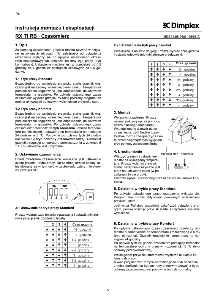 PL Instrukcja montażu i eksploatacji RX TI RB Czasomierz 453321.66.96pl 05/06/A 1. Opis 2.2 Ustawienie na tryb pracy Komfort Za pomocą czasomierza grzejnik można używać w sztywno ustawionych okresach. W zależności od ustawienia urządzenie wyłączy się po upływie ustawionego okresu (tryb standardowy) lub przejdzie na inny tryb pracy (tryb komfortowy). Ustawienie możliwe jest w przedziale od 0,5 godziny do 4 godzin (w odstępach czasowych co 0,5 godziny). Przełacznik 1 ustawić do góry. Proszę wybrać czas grzania i ustawić odpowiednio miniaturowe przełączniki. 1 3 2 4 ½ godziny 1 godzina 1.1 Tryb pracy Standard Bezpośrednio po wciśnięciu przycisku startu grzejnik włączany jest na zadany wcześniej okres czasu. Temperatura pomieszczenia regulowana jest odpowiednio do ustawień termostatu na grzejniku. Po upływie ustawionego czasu czasomierz wyłącza grzejnik. W razie potrzeby program ten można aktywować ponownym wciśnięciem przycisku start. 1½ godziny 2 godziny 2½ godziny 3 godziny 3½ godziny 4 godziny 1.2 Tryb pracy Komfort Bezpośrednio po wciśnięciu przycisku startu grzejnik włączany jest na zadany wcześniej okres czasu. Temperatura pomieszczenia regulowana jest odpowiednio do ustawień termostatu na grzejniku. Po upływie ustawionego czasu czasomierz przechodzi w tryb obniżania i obniża temperaturę pomieszczenia ustawioną na termostacie na następne 24 godziny o 5 °C. Ponownie po upływie tych 24 godzin uaktywnia się tryb ochrony przeciwmrozowej. Termostat grzejnika reguluje temperature pomieszczenia w zakresie 5 °C. To ustawienie jest utrzymane. 3. Montaż Wyłączyć urządzenie. Proszę usunąć pokrywę np. za pomocą ostrza płaskiego śrubokrętu. Wsunąć kasetę w otwór aż do ztrzaśnięcia. Jeśli będzie to potrzebne można zbezpieczyć kasetę przed niepożądanym wyjęciem przy pomocy załączonej śruby. 4. Uruchomienie 2. Ustawienie czasomierza 1 DIP 5. Działanie w trybie pracy Standard Po upływie ustawionego czasu urządzenie wyłącza się. Program ten można aktywować ponownym wciśnięciem przycisku start. Jeśli chcą Państwo wcześniej zakończyć ustawiony program, proszę wcisnąć przycisk startu. Urządzenie zostanie wyłączone. 3 4 2 2.1 Ustawienie na tryb pracy Standard Proszę wybrać czas trwania ogrzewania i ustawić miniaturowe przełączniki zgodnie z tabelą. 1 2 3 4 Przycisk start Kontrolka Włączyć grzejnik i ustawić termostat na wymaganą temperaturę. Proszę wcisnąć przycisk startu. Urządzenie używane jest teraz na ustawiony okres (w pożądanym trybie pracy). Podczas upływu ustawionego czasu świeci sie lampka kontrolna. Przed montażem czasomierza konieczne jest ustawienie czasu grzania i trybu pracy. Na spodniej stronie kasety zainstalowane są w tym celu w zagłębieniu cztery miniaturowe przełączniki. ON Czas grzania 6. Działanie w trybie pracy Komfort Czas grzania Po upływie ustawionego czasu czasomierz przełączy termostat automatycznie na temperaturę zredukowaną o 5 °C (tryb obniżania). Grzejnik reguluje tę temperaturę na następne 24 godziny. Po upływie tych 24 godzin czasomierz przełączy termostat na temperaturę ochrony przeciwmrozowej ok. 5 °C (tryb ochrony przeciwmrozowej). Wciśnięciem przycisku start można wybierać aktualnie kolejny tryb pracy. A więc przykładowo: z trybu normalnego na tryb obniżania, z trybu obniżania na tryb ochrony przeciwmrozowej, z trybu ochrony przeciwmrozowej ponownie na tryb normalny. ½ godziny 1 godzina 1½ godziny 2 godziny 2½ godziny 3 godziny 3½ godziny 4 godziny 5 Wskazówki odnośnie utylizacji Urządzenia nie wolno wyrzucać razem ze zwykłymi odpadami domowymi. Glen Dimplex Polska Sp. z o.o. ul. Strzeszyńska 33 60 – 479 Poznań Tel. : 0 61 8 425 805 Fax. : 0 61 8 425 806 E-mail: [email protected]