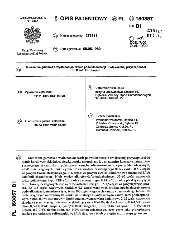 RZECZPOSPOLITA POLSKA (12) OPIS PATENTOWY (19) PL (11) 160857 (13) B1 (21) Numer zgłoszenia: Urząd Patentowy Rzeczypospolitej Polskiej (22) Data zgłoszenia: 279381 09.05.1989 (51) IntCl5: C08L 7/00 C08L 19/00 Mieszanka gumowa o wydłużonym czasie podwulkanizacji i zwiększonej przyczepności do tkanin kordowych (54) (73) (43) Zgłoszenie ogłoszono: 12.11.1990 BUP 23/90 Uprawniony z patentu: Instytut Odlewnictwa, Kraków, PL Dębickie Zakłady Opon Samochodowych ''STOMIL'', Dębica, PL (72) Twórcy wynalazku: (45) PL 160857 B1 (57) O udzieleniu patentu ogłoszono: 30.04.1993 WUP 04/93 Waldemar Wiktorski, Dębica, PL Zdzisław Chabowski, Dębica, PL Zbigniew Górny, Kraków, PL Romuald Boniecki, Kraków, PL M ieszanka gum owa o wydłużonym czasie podwulkanizacji i zwiększonej przyczepności do tkanin kordowych składająca się z kauczuku naturalnego lub mieszaniny kauczuku naturalnego z syntetycznymi kauczukam i poliizoprenowym, butadienowo-styrenowym i polibutadienowym, z 2-8 części wagowych tlenku cynku lub aktywatora zaw ierającego tlenek cynku, 0,5-2 części wagowych kwasu stearynow ego, 0-8 części wagowych żywicy kumaronowo-indenowej i/lub kalafonii ekstrakcyjnej i/lu b żywicy alkilofenyloformaldehydowej, 35-60 części wagowych sadzy półaktywnej typu F E F i/lu b sadzy aktywnej typu H A F i/lu b sadzy półaktywnej typu G P F , 1-4 części wagowych środka przeciwstarzeniowego, 0,7-1,5 części wagowych przyspieszacza, 1,5-3,5 części wagowych siarki, 0-0,5 części wagowych środka opóźniającego proces podw ulkanizacji, znamienna tym, że na 100 części wagowych kauczuku naturalnego lub na 100 części wagowych mieszaniny kauczuku naturalnego z syntetycznymi kauczukam i poliizoprenowym, butadienowo-styrenowym i polibutadienowym zawiera dodatkow o 2-25 części wagowych składnika stanowiącego mieszaninę składającą się z 93-97% tlenku krzemu, 0,9-1,5% tlenku glinu, 0,3-1% tlenku wapnia, 0,4-1,5% tlenku magnezu, 0,1-0,7% tlenku tytanu, 0,7-1% tlenku potasu, 0,2-0,4% tlenku sodu, 0,4-0,9% tlenku żelazowego, przy czym jak o przyspieszacz zawiera przyspieszacz sulfonam idow y i/lub tiazolowy i/lu b przyspieszacz z grupy guanidyn. MIESZANKA GUMOWA O WYDŁUŻON YM CZASIE PODWULKANIZACJI I ZWIĘKSZONEJ PRZYCZEPNOŚCI DO TKANIN KORDOWYCH Z a s t r z e ż e n i e p a t e n t o w e Mieszanka gumowa o wydłużonym czasie podwulkanizacji i zwiększonej ności do tkanin kordowych składająca p rzyczep się z kauczuku naturalnego lub mieszaniny kauczuku naturalnego z syntetycznymi kauczukami pollizoprenowym, butadienowo-sty renowym i polibutadienowym, z 2-8 części wagowych tlenku cynku lub aktywatora zawierającego tlenek cynku, 0,5- 2 części wagowych kwasu stearynowego, 0-8 części wagowych żywicy kumaronowo-indenowej alkilofenyloform aldehydowej, i/lub sadzy aktywnej typu HAP i / l u b wych środka przeciwstarzeniowego, części wagowych s i a r k i , i /l u b k a la f o n ii ekstrakcyjnej i/lub 35-60 części wagowych sadzy półaktywnej sadzy półaktywnej żywicy typu FEF typu GPF , 1-4 części wago 0 , 7 - 1 , 5 części wagowej p rzy sp ie szacza, 1,5- 3, 5 0 - 0 ,5 części wagowej środka opóźniającego proces podwul kanizacji, z n a m i e n n a tym, że na 100 części wagowych kauczuku naturalnego lub na 100 części wagowych mieszaniny kauczuku naturalnego z syntetycznymi kauczukami poliizoprenowym, butadienowo-styrenowym i polibutadienowym zawiera dodatkowo 2-25 części wagowych składnika krzemu, stanowiącego mieszaninę 0 , 9 - 1 , 5 % tlenku g l i n u , 0 , 1 - 0 , 7 % tlenku tytanu, tlenku żelazowego, midowy i / l u b składającą się z 93-97 % tlenku 0,3-1 % tlenku wapnia, 0 , 4 - 1 , 5 % tlenku magnezu, 0,7- 1 % tlenku potasu, 0 , 2 - 0 , 4 % tlenku sodu, 0 , 4 - 0 , 9 % a przy czym jako przyspieszacz zawiera p rzyspieszacz su lf o n a tiazolowy i / l u b przyspieszacz z grupy guanidyn. * * * Przedmiotem wynalazku je st mieszanka gumowa o wydłużonym czasie podwulkanizac j i i zwiększonej p r z y c z epności do tkanin kordowych. Na konstrukcję opony składa się szereg elementów, określoną rolę mającą wpływ na jej wowych elementów z a l i c z a warstw nagumowanej się osnowę opony. tkaniny kordowej z których każdy spe łnia parametry eksploatacyjne, przy czym do podsta Osnowa jest zbudowana zazwyczaj z kilku i tworzy szkielet opony, który powinien odpo wiadać wysokim wymaganiom w zakresie odporności na przenoszone obciążenia, wysokie ciśnienie wewnętrzne w oponie i odkształcenia, a więc a także na temperaturę powstającą podczas toczenia się opony. gumowania zwane także mieszankami nakładowymi, winny się cha tkanin kordowych, Z tych tez względów mieszanki gumowe do rakteryzować niską h is t e r e zą oraz znaczną wytrzymałością zmęczeniową w warunkach ciągłych odkształceń dynamicznych toczącej odznaczać się dużą odpornością na starzenie się opony, a jednocześnie powinny termiczne oraz na ro z d zie ran ie . podczas e ksplo atacji opony na granicy guma -tkanina kordowa d zia łają prężenia śc inają ce , dlatego też mieszanki gumowe do gumowania winny dodatkowo charakteryzować na tkanin kordowych się dużą przyczepnością do tychże tkanin, w warunkach statycznych jak i dynamicznych. Na uzyskanie Ponadto znaczne zarówno dobrych własności m ie sza nek i gotowych wyrobów ma wpływ czas p o dwulkanizacji, im dłuż szy, tym własności lepsze. W znanych mieszankach gumowych w celu przedłużenia suje się dodatek rezorcyny, czasu podw ulkanizacji sześciometylenoczteroaminy lub rezotropiny. sto 160 857 3 Znane mieszanki gumowe w skład których w ch odzi: 0-70 części wagowych kauczuku naturalnego, 0-70 części wagowych kauczuku butadienowo-styrenowego, 0-40 części wagowych kauczuku polibutadienowego, 0 , 5 - 3 części wagowych kwasu stearynowego, 3-7 części wagowych tlenku cynku, 0,5- 6 czę ści wagowych żywicy kumarowej, części wagowych środka przeciwstarzen