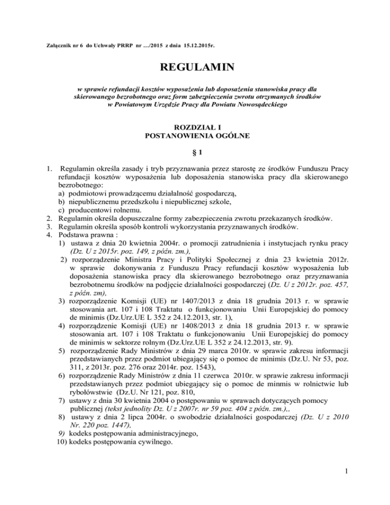 Załącznik nr 6 do Uchwały PRRP nr …/2015 z dnia 15.12.2015r. REGULAMIN w sprawie refundacji kosztów wyposażenia lub doposażenia stanowiska pracy dla skierowanego bezrobotnego oraz form zabezpieczenia zwrotu otrzymanych środków w Powiatowym Urzędzie Pracy dla Powiatu Nowosądeckiego ROZDZIAŁ I POSTANOWIENIA OGÓLNE §1 1. Regulamin określa zasady i tryb przyznawania przez starostę ze środków Funduszu Pracy refundacji kosztów wyposażenia lub doposażenia stanowiska pracy dla skierowanego bezrobotnego: a) podmiotowi prowadzącemu działalność gospodarczą, b) niepublicznemu przedszkolu i niepublicznej szkole, c) producentowi rolnemu. 2. Regulamin określa dopuszczalne formy zabezpieczenia zwrotu przekazanych środków. 3. Regulamin określa sposób kontroli wykorzystania przyznawanych środków. 4. Podstawa prawna : 1) ustawa z dnia 20 kwietnia 2004r. o promocji zatrudnienia i instytucjach rynku pracy (Dz. U z 2015r. poz. 149, z późn. zm.), 2) rozporządzenie Ministra Pracy i Polityki Społecznej z dnia 23 kwietnia 2012r. w sprawie dokonywania z Funduszu Pracy refundacji kosztów wyposażenia lub doposażenia stanowiska pracy dla skierowanego bezrobotnego oraz przyznawania bezrobotnemu środków na podjęcie działalności gospodarczej (Dz. U z 2012r. poz. 457, z późn. zm), 3) rozporządzenie Komisji (UE) nr 1407/2013 z dnia 18 grudnia 2013 r. w sprawie stosowania art. 107 i 108 Traktatu o funkcjonowaniu Unii Europejskiej do pomocy de minimis (Dz.Urz.UE L 352 z 24.12.2013, str. 1), 4) rozporządzenie Komisji (UE) nr 1408/2013 z dnia 18 grudnia 2013 r. w sprawie stosowania art. 107 i 108 Traktatu o funkcjonowaniu Unii Europejskiej do pomocy de minimis w sektorze rolnym (Dz.Urz.UE L 352 z 24.12.2013, str. 9). 5) rozporządzenie Rady Ministrów z dnia 29 marca 2010r. w sprawie zakresu informacji przedstawianych przez podmiot ubiegający się o pomoc de minimis (Dz.U. Nr 53, poz. 311, z 2013r. poz. 276 oraz 2014r. poz. 1543), 6) rozporządzenie Rady Ministrów z dnia 11 czerwca 2010r. w sprawie zakresu informacji przedstawianych przez podmiot ubiegający się o pomoc de minmis w rolnictwie lub rybołówstwie (Dz.U. Nr 121, poz. 810, 7) ustawy z dnia 30 kwietnia 2004 o postępowaniu w sprawach dotyczących pomocy publicznej (tekst jednolity Dz. U z 2007r. nr 59 poz. 404 z późn. zm.),, 8) ustawy z dnia 2 lipca 2004r. o swobodzie działalności gospodarczej (Dz. U z 2010 Nr. 220 poz. 1447), 9) kodeks postępowania administracyjnego, 10) kodeks postępowania cywilnego. 1 §2 1. Ilekroć w niniejszym Regulaminie mowa jest o: 1) staroście - oznacza to, Starostę Nowosądeckiego, 2) urzędzie - oznacza to, Powiatowy Urząd Pracy dla Powiatu Nowosądeckiego, 3) ustawie - oznacza to, ustawę z dnia 20 kwietnia 2004r. o promocji zatrudnienia instytucjach rynku pracy (Dz. U z 2015r. poz. 149, z późn. zm.), 4) rozporządzeniu - oznacza to, rozporządzenie Ministra Pracy i Polityki Społecznej z dnia 23 kwietnia 2012r. w sprawie dokonywania z Funduszu Pracy refundacji kosztów wyposażenia lub doposażenia stanowiska pracy dla skierowanego bezrobotnego oraz przyznawania bezrobotnemu środków na podjęcie działalności gospodarczej (Dz. U z 2012r. poz. 457, z późn. zm), 5) przeciętnym wynagrodzeniu – oznacza to, przeciętne wynagrodzenie w poprzednim kwartale, począwszy od pierwszego dnia następnego miesiąca po ogłoszeniu przez Prezesa Głównego Urzędu Statystycznego w Dzienniku Urzędowym Rzeczypospolitej Polskiej „Monitor Polski”, na podstawie art. 20 pkt 2 ustawy z 17 grudnia 1998 r. o emeryturach i rentach z Funduszu Ubezpieczeń Społecznych (Dz.U. z 2004 r. Nr 39, poz. 353, z późn. zm.), 6) podmiocie – oznacza to, podmiot prowadzący działalność gospodarczą, czyli osobę fizyczną, osobę prawną i jednostkę organizacyjną niebędącą osobą prawną, której odrębna ustawa przyznaje zdolność prawną - wykonującą we własnym imieniu działalność gospodarczą. 7) działalności gospodarczej – oznacza to, zarobkową działalność wytwórczą, budowlaną, handlową, usługową oraz poszukiwanie, rozpoznawanie i wydobywanie kopalin ze złóż, a także działalność zawodową, wykonywaną w sposób zorganizowany i ciągły. Działalnością gospodarczą nie jest działalność wytwórcza w rolnictwie z zakresie upraw rolnych oraz chowu i hodowli zwierząt, ogrodnictwa, warzywnictwa, leśnictwa i rybactwa śródlądowego, a także wynajmowania przez rolników pokoi, sprzedaży posiłków domowych i świadczenia w gospodarstwach rolnych innych usług związanych z pobytem turystów. 8) niepublicznym przedszkolu i niepublicznej szkole – oznacza to, osobę fizyczną lub osobę prawną prowadzącą działalność w niepublicznym przedszkolu, niepublicznej szkole w myśl ustawy z dnia 7 września 1991r. o systemie oświaty ( Dz. U z 2004r Nr. 256, poz. 2572, z póżn. zm.), 9) producencie rolnym – oznacza to, osobę fizyczną, osobę prawną lub jednostkę organizacyjną nieposiadającej osobowości prawnej, zamieszkującej lub mającej siedzibę na terytorium Rzeczypospolitej Polskiej posiadającej gospodarstwa rolnego o łącznej powierzchni przekraczającej 1 ha lub 1 ha przeliczeniowy w rozumieniu przepisów ustawy z dnia 15 listopada 1984r. o podatku rolnym (Dz. U z 2006r. Nr 136, poz. 969, z późn. zm.) lub prowadzącej dział specjalny produkcji rolnej, o których mowa w ustawie z dnia 26 lipca 1991r. o podatku dochodowym od osób fizycznych (Dz. U z 2012r., poz. 361 z późn. zm.) lub przepisów o podatku dochodowym od osób prawnych (Dz. U z 2011r. Nr 74, poz. 397 z późn. zm.), 10) bezrobotnym – oznacza to, osobę, o której mowa w art. 2 ust. 1 pkt 2 ustawy z dnia 20 kwietnia 2004 r. o promocji zatrudnienia i instytucjach rynku pracy (tekst jednolity Dz. U z 2015r. poz. 149, z późn. zm.), 2 11) bezrobotnym w szczególnej sytuacji na rynku pracy – oznacza to osoby wymienione w art. 49 ust. ustawy z dnia 20 kwietnia 2004 r. o 
