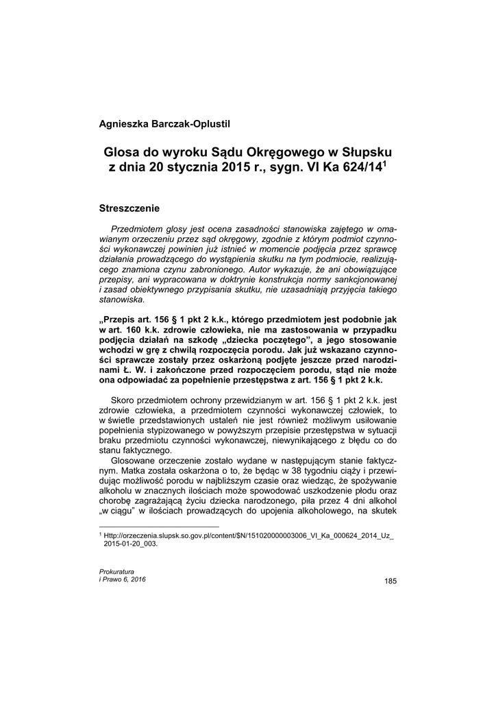 Glosa do wyroku SO w Słupsku z dnia 20.I.2015 r. Agnieszka Barczak-Oplustil Glosa do wyroku Sądu Okręgowego w Słupsku z dnia 20 stycznia 2015 r., sygn. VI Ka 624/141 Streszczenie Przedmiotem glosy jest ocena zasadności stanowiska zajętego w omawianym orzeczeniu przez sąd okręgowy, zgodnie z którym podmiot czynności wykonawczej powinien już istnieć w momencie podjęcia przez sprawcę działania prowadzącego do wystąpienia skutku na tym podmiocie, realizującego znamiona czynu zabronionego. Autor wykazuje, że ani obowiązujące przepisy, ani wypracowana w doktrynie konstrukcja normy sankcjonowanej i zasad obiektywnego przypisania skutku, nie uzasadniają przyjęcia takiego stanowiska. „Przepis art. 156 § 1 pkt 2 k.k., którego przedmiotem jest podobnie jak w art. 160 k.k. zdrowie człowieka, nie ma zastosowania w przypadku podjęcia działań na szkodę „dziecka poczętego”, a jego stosowanie wchodzi w grę z chwilą rozpoczęcia porodu. Jak już wskazano czynności sprawcze zostały przez oskarżoną podjęte jeszcze przed narodzinami Ł. W. i zakończone przed rozpoczęciem porodu, stąd nie może ona odpowiadać za popełnienie przestępstwa z art. 156 § 1 pkt 2 k.k. Skoro przedmiotem ochrony przewidzianym w art. 156 § 1 pkt 2 k.k. jest zdrowie człowieka, a przedmiotem czynności wykonawczej człowiek, to w świetle przedstawionych ustaleń nie jest również możliwym usiłowanie popełnienia stypizowanego w powyższym przepisie przestępstwa w sytuacji braku przedmiotu czynności wykonawczej, niewynikającego z błędu co do stanu faktycznego. Glosowane orzeczenie zostało wydane w następującym stanie faktycznym. Matka została oskarżona o to, że będąc w 38 tygodniu ciąży i przewidując możliwość porodu w najbliższym czasie oraz wiedząc, że spożywanie alkoholu w znacznych ilościach może spowodować uszkodzenie płodu oraz chorobę zagrażającą życiu dziecka narodzonego, piła przez 4 dni alkohol „w ciągu” w ilościach prowadzących do upojenia alkoholowego, na skutek 1 Http://orzeczenia.slupsk.so.gov.pl/content/$N/151020000003006_VI_Ka_000624_2014_Uz_ 2015-01-20_003. Prokuratura i Prawo 6, 2016 185 A. Barczak-Oplustil czego wystąpił po porodzie u małoletniego syna ciężki uszczerbek na zdrowiu w postaci choroby realnie zagrażającej życiu w postaci ciężkiego zespołu abstynencyjnego z bezdechem i drgawkami, to jest o czyn z art. 156 § 1 pkt 2 k.k. Orzekające w sprawie sądy uniewinniły kobietę od zarzucanego jej czynu wskazując w uzasadnieniu na brak podmiotu czynności wykonawczej w czasie czynu. Problem konieczności istnienia przedmiotu (podmiotu) czynności wykonawczej w chwili podejmowania zachowań, które stwarzają wysokie prawdopodobieństwo wystąpienia skutku stanowiącego znamię typu czynu zabronionego, nie był przedmiotem szerszych rozważań ani orzecznictwa ani doktryny. Co nie oznacza, że pozostał on niezauważony2. W doktrynie od wielu lat głoszone jest stanowisko, zgodnie z którym – w uproszczeniu – podmiot czynności wykonawczej powinien istnieć nie w momencie, w którym sprawca podjął czynność, z którą wiąże się skutek w postaci uszczerbku na życiu lub zdrowiu dziecka, ale w momencie, w którym dochodzi do bezpośredniego oddziaływania na ten podmiot. Tytułem przykładu wskazuje się na sytuację, w której sprawca nasączył trucizną pieluszki w okresie, w którym dziecko znajdowało się jeszcze w prenatalnej fazie życia, zaś pieluszki zostały użyte już po narodzeniu dziecka; do oddziaływania sporządzonego przez sprawcę środka na dziecko doszło zatem w momencie, w którym dziecko spełniało nawet najbardziej surowe kryteria człowieczeństwa3. Nawet biorąc pod uwagę tylko powyższy pogląd za niezasadną należy uznać wyrażoną w glosowanym orzeczeniu tezę, zgodnie z którą „przepis art. 156 § 1 pkt 2 k.k., którego przedmiotem jest podobnie jak w art. 160 k.k. zdrowie człowieka, nie ma zastosowania w przypadku podjęcia działań na szkodę «dziecka poczętego», a jego stosowanie wchodzi w grę z chwilą rozpoczęcia porodu. Jak już wskazano czynności sprawcze zostały przez oskarżoną podjęte jeszcze przed narodzinami Ł. W. i zakończone przed rozpoczęciem porodu, stąd nie może ona odpowiadać za popełnienie przestępstwa z art. 156 § 1 pkt 2 k.k.”. Niezależnie jednak od niezgodności cytowanej tezy z przytoczonym powyżej stanowiskiem, stwierdzić należy ponadto, że nie znajduje ona uzasadnienia także w brzmieniu obowiązujących przepisów; trudno też znaleźć dla niej „poparcie” w sformułowanych przez doktrynę i orzecznictwo przesłankach obiektywnego przypisania skutku. 2 A. Z o l l, (w:) A. Z o l l (red.), Kodeks karny. Część szczególna. Komentarz, t. II, Warszawa 2013, s. 262–263; A. B a r c z a k - O p l u s t i l, Kilka uwag na temat konieczności istnienia przedmiotu czynności wykonawczej w czasie czynu, (w:) P. K a r d a s, T. S r o k a, W. W r ó b e l (red.), Państwo prawa i prawo karne. Księga Jubileuszowa Profesora Andrzeja Zolla, t. II, Warszawa 2012 r., s. 487 i n.; T. S r o k a, Odpowiedzialność karna za niewłaściwe leczenie. Problematyka obiektywnego przypisania skutku, Warszawa 2013, s. 77–76. 3 A. Z o l l, (w:) Kodeks..., s. 263. 186 Prokuratura i Prawo 6, 2016 Glosa do wyroku SO w Słupsku z dnia 20.I.2015 r. W pierwszej kolejności zwrócić należy uwagę, że obowiązek istnienia przedmiotu czynności wykonawczej w czasie czynu nie został wyrażony wprost w przepisach prawa4; także analiza normatywna wskazanych w akcie oskarżenia przepisów nie daje podstawy do przyjęcia, że statuują one taki wymóg. Nie budzi oczywiście wątpliwości, że aby skutek w postaci ciężkiego uszczerbku nastąpił musi – w chwili wystąpienia skutku – istnieć desygnat podmiotu czynności wykonawczej typu opisanego w art. 156 § 1 k.k., czyli człowiek. Innymi słowy, skutek w postaci ciężkiego uszc