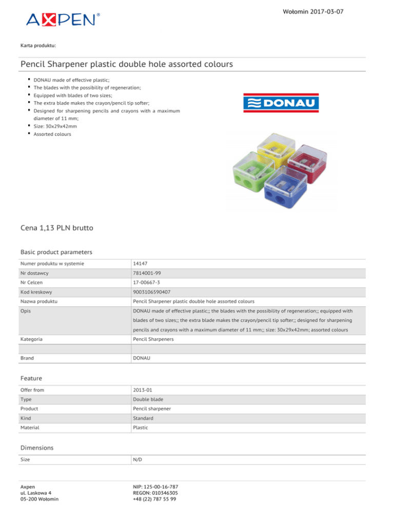 Wołomin 2017-03-07 Karta produktu: Pencil Sharpener plastic double hole assorted colours DONAU made of effective plastic; The blades with the possibility of regeneration; Equipped with blades of two sizes; The extra blade makes the crayon/pencil tip softer; Designed for sharpening pencils and crayons with a maximum diameter of 11 mm; Size: 30x29x42mm Assorted colours Cena 1,13 PLN brutto Basic product parameters Numer produktu w systemie 14147 Nr dostawcy 7814001-99 Nr Celcen 17-00667-3 Kod kreskowy 9003106590407 Nazwa produktu Pencil Sharpener plastic double hole assorted colours Opis DONAU made of effective plastic;; the blades with the possibility of regeneration;; equipped with blades of two sizes;; the extra blade makes the crayon/pencil tip softer;; designed for sharpening pencils and crayons with a maximum diameter of 11 mm;; size: 30x29x42mm; assorted colours Kategoria Pencil Sharpeners Brand DONAU Feature Offer from 2013-01 Type Double blade Product Pencil sharpener Kind Standard Material Plastic Dimensions Size N/D Axpen ul. Laskowa 4 05-200 Wołomin NIP: 125-00-16-787 REGON: 010346305 +48 (22) 787 55 99 Wołomin 2017-03-07 Karta katalogowa produktu cd. Pencil Sharpener plastic double hole assorted colours Dimensions (mm) 30x29x42 Procurement vocabulary CPV 30192133-2 Temperówki do ołówków Certifications New product Standard Hit Standard Colour Colour Assorted colours Pozostałe zdjęcia produktu Serdecznie zapraszamy do współpracy Axpen zespół. Axpen ul. Laskowa 4 05-200 Wołomin NIP: 125-00-16-787 REGON: 010346305 +48 (22) 787 55 99