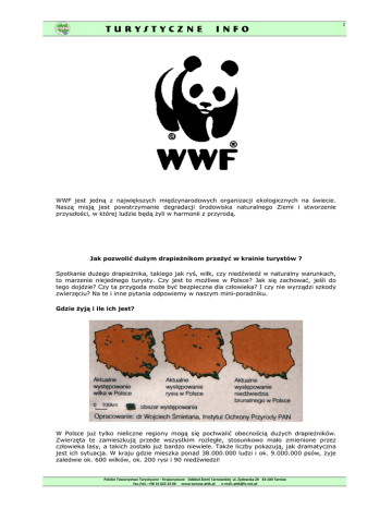 TURYSTYCZNE INFO WWF jest jedną z największych międzynarodowych organizacji ekologicznych na świecie. Naszą misją jest powstrzymanie degradacji środowiska naturalnego Ziemi i stworzenie przyszłości, w której ludzie będą żyli w harmonii z przyrodą. Jak pozwolić dużym drapieżnikom przeżyć w krainie turystów ? Spotkanie dużego drapieżnika, takiego jak ryś, wilk, czy niedźwiedź w naturalny warunkach, to marzenie niejednego turysty. Czy jest to możliwe w Polsce? Jak się zachować, jeśli do tego dojdzie? Czy ta przygoda może być bezpieczna dla człowieka? I czy nie wyrządzi szkody zwierzęciu? Na te i inne pytania odpowiemy w naszym mini-poradniku. Gdzie żyją i ile ich jest? W Polsce już tylko nieliczne regiony mogą się pochwalić obecnością dużych drapieżników. Zwierzęta te zamieszkują przede wszystkim rozległe, stosunkowo mało zmienione przez człowieka lasy, a takich zostało już bardzo niewiele. Także liczby pokazują, jak dramatyczna jest ich sytuacja. W kraju gdzie mieszka ponad 38.000.000 ludzi i ok. 9.000.000 psów, żyje zaledwie ok. 600 wilków, ok. 200 rysi i 90 niedźwiedzi! Polskie Towarzystwo Turystyczno – Krajoznawcze Oddział Ziemi Tarnowskiej ul. Żydowska 20 33-100 Tarnów fax./tel.: +48 14 622 22 00 www.tarnow.pttk.pl e-mail: [email protected] 1 TURYSTYCZNE INFO 2 Co jedzą duże drapieżniki? Jak przystało na zwierzęta drapieżne - odżywiają się z reguły mięsem. Rysie i wilki polują głównie na samy i jelenie. Wilk nie gardzi też padliną. Niedźwiedź w okresie lata i jesieni żywi się głównie leśnymi owocami (borówka, malina, jeżyna, jarzębina). Zimą najczęściej śpi, korzystając z zapasów tłuszczu jednak wczesną wiosną, dopóki nie pojawią się pierwsze nowalijki, zmuszony jest jeść mięso. Jaki jest ich status prawny? Zarówno wilk, ryś jak i niedźwiedź należą w Polsce do gatunków ściśle chronionych. Objęte są również ochroną prawem międzynarodowym m.in. ratyfikowaną przez Polskę Konwencją Berneńską oraz prawem UE, dzięki tzw. "Dyrektywie Siedliskowej", która traktuje wilka i niedźwiedzia jako gatunki priorytetowe. Co im zagraża? Mimo ścisłej ochrony wilków, rysi i niedźwiedzi, zwierzęta te są w Polsce zagrożone. Coraz częściej dochodzi do konfliktów między działalnością człowieka, a ich potrzebami życiowymi. Rozwój inwestycji drogowych, budowlanych, turystycznych i rosnący ruch samochodowy na terenach ostoi tych zwierząt, stanowi dla nich śmiertelne niebezpieczeństwo. Drapieżniki cierpią również głód. Nadmierny odstrzał saren i jeleni (naturalnego pokarmu rysi i wilków) oraz przemysłowy zbiór owoców leśnych w miejscach występowania niedźwiedzi, znacznie zmniejsza ilość dostępnego pożywienia. Wilki poszukując pokarmu atakują zwierzęta hodowlane, a niedźwiedzie odwiedzają pasieki narażając się na konflikt z ludźmi. Bezpośrednie, duże zagrożenie powoduje także kłusownictwo oraz kolizje drogowe. Jak można im pomóc? Każdy z nas może pomóc w ocaleniu wilka, rysia, czy niedźwiedzia. Jak? To proste! 1. Zachowaj ciszę Jeśli znajdziemy się na obszarze, gdzie potencjalnie mogą występować duże drapieżniki, bardzo ważne jest zachowanie ciszy i spokoju. Może to wydawać się banalnym stwierdzeniem, ale głośne słuchanie muzyki i powodowanie hałasu, przepłasza przyzwyczajone do ciszy zwierzęta. Jeśli takie sytuacje powtarzają się zbyt często, doprowadza to do okresowego lub całkowitego opuszczenia terenu przez drapieżniki. Sytuacje te są szczególnie niebezpieczne dla samic mających młode. W skrajnych wypadkach ich niepokojenie może doprowadzić do porzucenia potomstwa, które skazane jest wówczas na śmierć. 2. Powiedz NIE kłusownikom Rysie i wilki polując na sarny i jelenie często wpadają we wnyki zastawione przez kłusowników na zwierzęta kopytne. Są to różnego typu pułapki druciane albo ze stalowej linki; mogą też przypominać metalowe szczęki zatrzaskujące się na kończynie. Drapieżniki złapane we wnyki konają w męczarniach, czasem przez wiele godzin lub dni. Nie pozwól na to! Jeśli znajdziesz tego rodzaju pułapki zniszcz je, uszkodź, usuń z ziemi. Warto również, abyś zgłosił to odpowiednim służbom - Państwowej Straży Łowieckiej, Straży Leśnej (Lasy Państwowe) albo Policji - kontakty znajdziesz w internecie. Polskie Towarzystwo Turystyczno – Krajoznawcze Oddział Ziemi Tarnowskiej ul. Żydowska 20 33-100 Tarnów fax./tel.: +48 14 622 22 00 www.tarnow.pttk.pl e-mail: [email protected] TURYSTYCZNE INFO 3 3. Psom do lasu wstęp wzbroniony Nasi pupile lubią biegać i powinniśmy stwarzać im takie możliwości. Ale w lasach, gdzie żyją drapieżniki taka swoboda może stanowić wielkie niebezpieczeństwo zarówno dla drapieżników, jak i psów. Warto zastanowić się jak się zachowuje się nasz ulubieniec w lesie i w kontakcie z innymi stworzeniami. Dzikie zwierzęta nie będą traktować Twojego czworonoga jak turystę, tylko jak rywala w konkurencji o teren i pożywienie. Pamiętaj też, że puszczanie psa luzem w lesie jest w Polsce prawnie zakazane, a czasem może nawet grozić odstrzeleniem naszego pupila przez myśliwych. Być może tym razem lepiej zostawić go w domu dla jego własnego dobra. 4. Uwaga na drodze! Jeżeli przez leśne okolice przemieszczasz się samochodem, zwolnij. Dla zwierzęcia, które chce pokonać drogę, pędzący samochód to wyrok śmierci. Możesz temu zapobiec. Wystarczy jechać wolniej. 5. Tylko po szlaku Specjalne zasady zachowania dotyczą obszarów występowania niedźwiedzi, ponieważ zwierzęta te są najmniej płochliwe z całej "wielkiej trójki" i mamy największą szanse by je spotkać. Więc tam, gdzie żyją niedźwiedzie... Nie schodź z wyznaczonych ścieżek. W ten sposób bardzo łatwo naruszyć przestrzeń, w której żyją drapieżniki i narazić się na spotkanie oko w oko z niedźwiedziem stresujące dla 