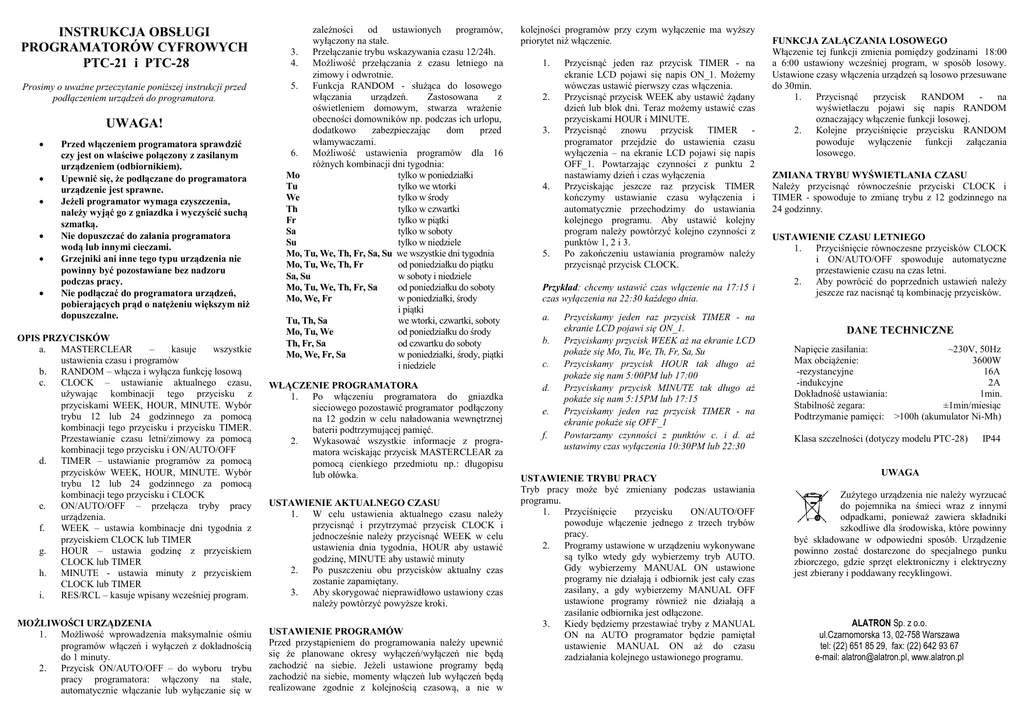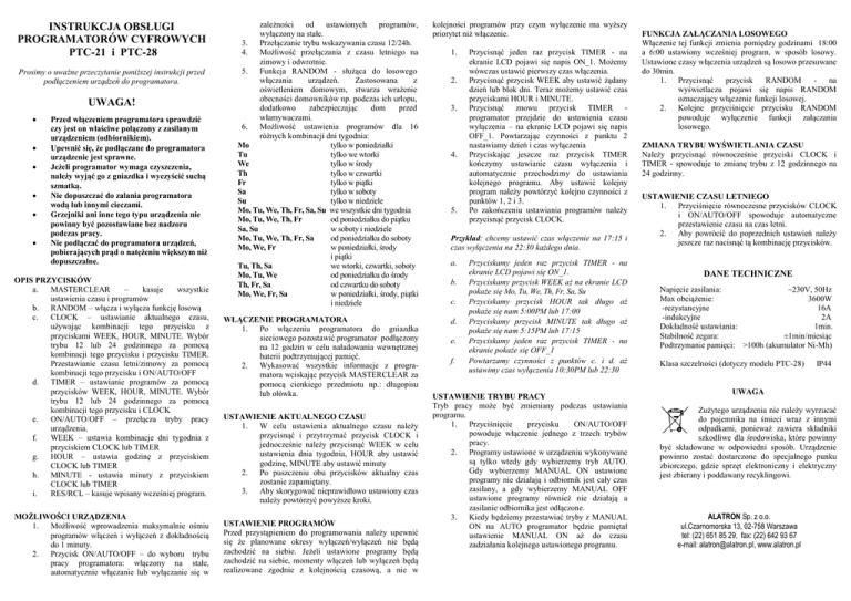 INSTRUKCJA OBSŁUGI PROGRAMATORÓW CYFROWYCH PTC-21 i PTC-28 Prosimy o uważne przeczytanie poniższej instrukcji przed podłączeniem urządzeń do programatora. UWAGA! Przed włączeniem programatora sprawdzić czy jest on właściwe połączony z zasilanym urządzeniem (odbiornikiem). Upewnić się, że podłączane do programatora urządzenie jest sprawne. Jeżeli programator wymaga czyszczenia, należy wyjąć go z gniazdka i wyczyścić suchą szmatką. Nie dopuszczać do zalania programatora wodą lub innymi cieczami. Grzejniki ani inne tego typu urządzenia nie powinny być pozostawiane bez nadzoru podczas pracy. Nie podłączać do programatora urządzeń, pobierających prąd o natężeniu większym niż dopuszczalne. OPIS PRZYCISKÓW a. MASTERCLEAR – kasuje wszystkie ustawienia czasu i programów b. RANDOM – włącza i wyłącza funkcję losową c. CLOCK – ustawianie aktualnego czasu, używając kombinacji tego przycisku z przyciskami WEEK, HOUR, MINUTE. Wybór trybu 12 lub 24 godzinnego za pomocą kombinacji tego przycisku i przycisku TIMER. Przestawianie czasu letni/zimowy za pomocą kombinacji tego przycisku i ON/AUTO/OFF d. TIMER – ustawianie programów za pomocą przycisków WEEK, HOUR, MINUTE. Wybór trybu 12 lub 24 godzinnego za pomocą kombinacji tego przycisku i CLOCK e. ON/AUTO/OFF – przełącza tryby pracy urządzenia. f. WEEK – ustawia kombinacje dni tygodnia z przyciskiem CLOCK lub TIMER g. HOUR – ustawia godzinę z przyciskiem CLOCK lub TIMER h. MINUTE - ustawia minuty z przyciskiem CLOCK lub TIMER i. RES/RCL – kasuje wpisany wcześniej program. MOŻLIWOŚCI URZĄDZENIA 1. Możliwość wprowadzenia maksymalnie ośmiu programów włączeń i wyłączeń z dokładnością do 1 minuty. 2. Przycisk ON/AUTO/OFF – do wyboru trybu pracy programatora: włączony na stałe, automatycznie włączanie lub wyłączanie się w zależności od ustawionych programów, wyłączony na stałe. 3. Przełączanie trybu wskazywania czasu 12/24h. 4. Możliwość przełączania z czasu letniego na zimowy i odwrotnie. 5. Funkcja RANDOM - służąca do losowego włączania urządzeń. Zastosowana z oświetleniem domowym, stwarza wrażenie obecności domowników np. podczas ich urlopu, dodatkowo zabezpieczając dom przed włamywaczami. 6. Możliwość ustawienia programów dla 16 różnych kombinacji dni tygodnia: Mo tylko w poniedziałki Tu tylko we wtorki We tylko w środy Th tylko w czwartki Fr tylko w piątki Sa tylko w soboty Su tylko w niedziele Mo, Tu, We, Th, Fr, Sa, Su we wszystkie dni tygodnia Mo, Tu, We, Th, Fr od poniedziałku do piątku Sa, Su w soboty i niedziele Mo, Tu, We, Th, Fr, Sa od poniedziałku do soboty Mo, We, Fr w poniedziałki, środy i piątki Tu, Th, Sa we wtorki, czwartki, soboty Mo, Tu, We od poniedziałku do środy Th, Fr, Sa od czwartku do soboty Mo, We, Fr, Sa w poniedziałki, środy, piątki i niedziele WŁĄCZENIE PROGRAMATORA 1. Po włączeniu programatora do gniazdka sieciowego pozostawić programator podłączony na 12 godzin w celu naładowania wewnętrznej baterii podtrzymującej pamięć. 2. Wykasować wszystkie informacje z programatora wciskając przycisk MASTERCLEAR za pomocą cienkiego przedmiotu np.: długopisu lub ołówka. USTAWIENIE AKTUALNEGO CZASU 1. W celu ustawienia aktualnego czasu należy przycisnąć i przytrzymać przycisk CLOCK i jednocześnie należy przycisnąć WEEK w celu ustawienia dnia tygodnia, HOUR aby ustawić godzinę, MINUTE aby ustawić minuty 2. Po puszczeniu obu przycisków aktualny czas zostanie zapamiętany. 3. Aby skorygować nieprawidłowo ustawiony czas należy powtórzyć powyższe kroki. USTAWIENIE PROGRAMÓW Przed przystąpieniem do programowania należy upewnić się że planowane okresy wyłączeń/wyłączeń nie będą zachodzić na siebie. Jeżeli ustawione programy będą zachodzić na siebie, momenty włączeń lub wyłączeń będą realizowane zgodnie z kolejnością czasową, a nie w kolejności programów przy czym wyłączenie ma wyższy priorytet niż włączenie. 1. 2. 3. 4. 5. Przycisnąć jeden raz przycisk TIMER - na ekranie LCD pojawi się napis ON_1. Możemy wówczas ustawić pierwszy czas włączenia. Przycisnąć przycisk WEEK aby ustawić żądany dzień lub blok dni. Teraz możemy ustawić czas przyciskami HOUR i MINUTE. Przycisnąć znowu przycisk TIMER programator przejdzie do ustawienia czasu wyłączenia – na ekranie LCD pojawi się napis OFF_1. Powtarzając czynności z punktu 2 nastawiamy dzień i czas wyłączenia Przyciskając jeszcze raz przycisk TIMER kończymy ustawianie czasu wyłączenia i automatycznie przechodzimy do ustawiania kolejnego programu. Aby ustawić kolejny program należy powtórzyć kolejno czynności z punktów 1, 2 i 3. Po zakończeniu ustawiania programów należy przycisnąć przycisk CLOCK. Przykład: chcemy ustawić czas włączenie na 17:15 i czas wyłączenia na 22:30 każdego dnia. a. b. c. d. e. f. Przyciskamy jeden raz przycisk TIMER - na ekranie LCD pojawi się ON_1. Przyciskamy przycisk WEEK aż na ekranie LCD pokaże się Mo, Tu, We, Th, Fr, Sa, Su Przyciskamy przycisk HOUR tak długo aż pokaże się nam 5:00PM lub 17:00 Przyciskamy przycisk MINUTE tak długo aż pokaże się nam 5:15PM lub 17:15 Przyciskamy jeden raz przycisk TIMER - na ekranie pokaże się OFF_1 Powtarzamy czynności z punktów c. i d. aż ustawimy czas wyłączenia 10:30PM lub 22:30 USTAWIENIE TRYBU PRACY Tryb pracy może być zmieniany podczas ustawiania programu. 1. Przyciśnięcie przycisku ON/AUTO/OFF powoduje włączenie jednego z trzech trybów pracy. 2. Programy ustawione w urządzeniu wykonywane są tylko wtedy gdy wybierzemy tryb AUTO. Gdy wybierzemy MANUAL ON ustawione programy nie działają i odbiornik jest cały czas zasilany, a gdy wybierzemy MANUAL OFF ustawione programy również nie działają a zasilanie odbiornika jest odłączone. 3. Kiedy będziemy przestawiać tryby z MANUAL ON na AUTO programator będzie pamiętał ustawienie MANUAL 