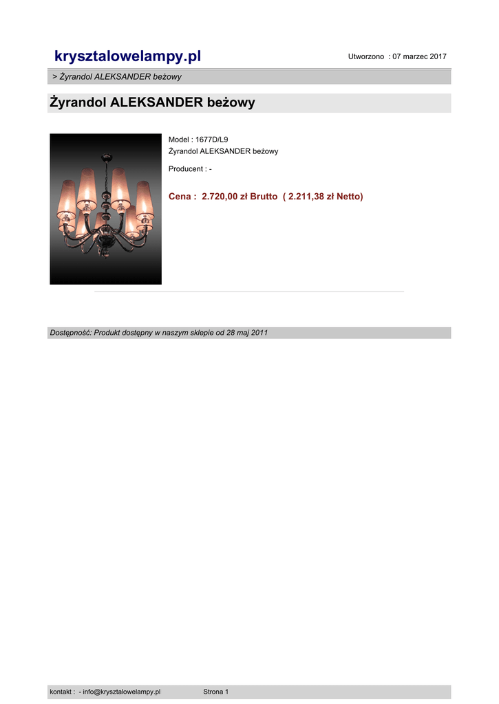 krysztalowelampy.pl Utworzono : 07 marzec 2017 > Żyrandol ALEKSANDER beżowy Żyrandol ALEKSANDER beżowy Model : 1677D/L9 Żyrandol ALEKSANDER beżowy Producent : - Cena : 2.720,00 zł Brutto ( 2.211,38 zł Netto) Dostępność: Produkt dostępny w naszym sklepie od 28 maj 2011 kontakt : - [email protected] Strona 1