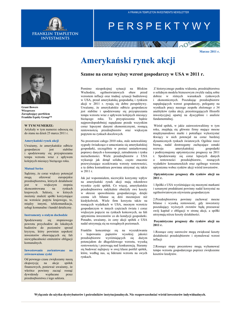 A FRANKLIN TEMPLETON INVESTMENTS NEWSLETTER PERSPEKTYWY Marzec 2011 r. Amerykański rynek akcji Szanse na coraz wyższy wzrost gospodarczy w USA w 2011 r. Grant Bowers Wiceprezes Zarządzający portfelem Franklin Equity Group™ W TYM NUMERZE: Artykuły w tym numerze odnoszą się do stanu na dzień 25 marca 2011 r. Amerykański rynek akcji Uważamy, że amerykańskie odbicie gospodarcze jest stabilne i spodziewamy się przyspieszania tempa wzrostu wraz z upływem kolejnych miesięcy bieżącego roku. Mutual Series Sądzimy, że coraz większy potencjał mogą oferować europejskie przedsiębiorstwa, których działalność jest w większym stopniu skoncentrowana na rynkach krajowych. Sektory, w których możemy znaleźć spółki korzystające na wzroście popytu krajowego, to, między innymi, telekomunikacja, usługi komunalne i handel detaliczny. Instrumenty o stałym dochodzie Spodziewamy się stopniowego powrotu przychodów do lokalnych budżetów do poziomów sprzed kryzysu, który powinien uspokoić inwestorów obawiających się fali niewypłacalności emitentów obligacji komunalnych. Inwestowanie zorientowane zrównoważone zyski na Od pewnego czasu zwiększamy naszą ekspozycję na akcje spółek finansowych, ponieważ uważamy, że wkrótce powinny zacząć rosnąć dywidendy wypłacane przez przedsiębiorstwa z tego sektora. Pomimo niespokojnej sytuacji na Bliskim Wschodzie, ogólnoświatowych obaw przed wzrostem inflacji oraz trudnej sytuacji budżetowej w USA, przed amerykańską gospodarką i rynkiem akcji w 2011 r. rysują się dobre perspektywy. Uważamy, że amerykańskie odbicie gospodarcze jest stabilne i spodziewamy się przyspieszania tempa wzrostu wraz z upływem kolejnych miesięcy bieżącego roku. To przyspieszenie będzie najprawdopodobniej napędzane przede wszystkim coraz lepszymi danymi ekonomicznymi, rosnącą rentownością przedsiębiorstw oraz większym popytem na rynkach docelowych. Na przestrzeni całego 2010 roku, stale notowaliśmy sygnały świadczące o umacnianiu się amerykańskiej gospodarki, szczególnie w postaci umiarkowanej poprawy danych o konsumpcji, zatrudnieniu i rynku nieruchomości. Wiele przedsiębiorstw z USA wykazuje jak dotąd solidne, często znacznie przewyższające oczekiwania wzrosty rentowności, a ta dobra koniunktura powinna utrzymać się także w 2011 r. Jak już wspomniałem, niezwykle korzystny wpływ na amerykański rynek akcji mają rekordowo wysokie zyski spółek. Co więcej, amerykańskie przedsiębiorstwa radykalnie obniżyły swe koszty w okresie spowolnienia gospodarczego, dzięki czemu ich bilanse są dziś mocniejsze niż kiedykolwiek. Wiele firm korzysta także na rosnących wydatkach w USA, mocnym wzroście gospodarczym w innych częściach świata i coraz większym popycie na rynkach końcowych, na fali optymizmu inwestorów co do kondycji gospodarki. Ponadto, uważamy, że ceny akcji spółek z USA nadal utrzymują się na rozsądnych poziomach. Franklin koncentruje się na wyszukiwaniu i kupowaniu papierów wysokiej jakości przedsiębiorstw wyróżniających się dużym potencjałem do długofalowego wzrostu, wysoką rentownością i przewagą nad konkurencją. Staramy się budować najlepszy w swej klasie portfel spółek, które, według nas, są liderami wzrostu na swych rynkach. Z historycznego punktu widzenia, przedsiębiorstwa o solidnym modelu biznesowym zwykle radzą sobie dobrze w różnych warunkach rynkowych i ekonomicznych. Poszukując przedsiębiorstw napędzających wzrost gospodarczy, polegamy na wynikach pracy naszego zespołu złożonego z 34 analityków rynku akcji, przestrzegających filozofii inwestycyjnej opartej na dyscyplinie i analizie fundamentalnej. Wśród spółek, w jakie zainwestowaliśmy w tym roku, znajdują się głównie firmy mające mocne międzynarodowe marki i potrafiące wykorzystać tkwiący w nich potencjał na coraz bardziej dynamicznych rynkach światowych. Ogólnie rzecz biorąc, nadal dostrzegamy zachęcające oznaki rozwoju amerykańskiej gospodarki i podtrzymujemy optymistyczne prognozy na 2011 r. Spodziewamy się coraz lepszych danych o rentowności przedsiębiorstw, rosnących wydatków konsumenckich oraz ogólnego wzrostu optymizmu wobec rynków akcji wśród inwestorów. Optymistyczne prognozy dla rynków akcji na 2011 r. 1.Spółki z USA wyróżniające się mocnymi markami i uznanymi produktami powinny nadal korzystać na ogólnoświatowym ożywieniu gospodarczym 2.Przedsiębiorstwa powinny zachować mocne bilanse i wysoką rentowność, gdy inwestorzy poszukujący wyższych zwrotów będą przesuwać swój kapitał z obligacji w stronę akcji, a spółki utrzymają niższe koszty działalności. Pesymistyczne prognozy dla rynków akcji na 2011 r. 1.Rosnące ceny surowców mogą zwiększać koszty działalności przedsiębiorstw i stymulować wzrost inflacji 2.Rosnące stopy procentowe mogą wyhamować tempo wzrostu gospodarczego poprzez zwiększenie kosztów kredytów. Wyłącznie do użytku dystrybutorów i pośredników instytucjonalnych. Nie rozpowszechniać wśród inwestorów indywidualnych. Marzec 2011 r. PERSPEKTYWY Mutual Series Europejskie rynki akcji: Poszukiwanie wartości wśród spółek skoncentrowanych na rynkach krajowych Philippe Brugere-Trelat Wiceprezes wykonawczy i zarządzający portfelem Mutual Series Cały 2010 r. upłynął pod znakiem wahań na rynkach; inwestorzy na europejskich rynkach akcji byli z jednej strony kuszeni dobrymi danymi napływającymi z sektora przemysłu oraz poprawą nastrojów konsumentów, a z drugiej strony zniechęcani potężnymi deficytami w budżetach państwowych. Europejscy liderzy zdołali zapobiec najgorszym możliwym skutkom kryzysu zadłużenia budżetowego w kilku krajach Europy, choć sytuacja nadal jest napięta, szczególnie w obliczu wdrażanych przez rządy programów oszczędnościowych. Choć kryzys zadłużenia budżetowego bez wątpienia musi być uważnie monitorowany, jesteśmy prz