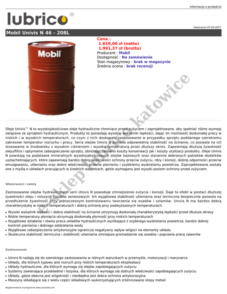 Informacje o produkcie Utworzono 07-03-2017 Mobil Univis N 46 - 208L Cena : 1.619,00 zł (netto) 1.991,37 zł (brutto) ka to w ic e Producent : Mobil Dostępność : Na zamówienie Stan magazynowy : brak w magazynie Średnia ocena : brak recenzji ep lu br ic o Oleje Univis™ N to wysokojakościowe oleje hydrauliczne chroniące przed zużyciem i zaprojektowane, aby spełniać różne wymogi związane ze sprzętem hydraulicznym. Produkty te posiadają wysokie wskaźniki lepkości, dając im możliwość doskonałej pracy w niskich i w wysokich temperaturach, co czyni z nich doskonałe zastosowanie w przypadku sprzętu poddanego szerokiemu zakresowi temperatur rozruchu i pracy. Seria olejów Univis N posiada odpowiednią stabilność na ścinanie, co pozwala na ich stosowanie w środowisku z wysokim ciśnieniem i wysoką temperaturą przez dłuższy okres. Zapewniają dłuższą żywotność oleju/filtra i optymalne zabezpieczenie sprzętu, obniżając zarówno koszty konserwacji jak i koszty utylizacji produktu. Oleje Univis N powstają na podstawie mineralnych wysokojakościowych olejów bazowych oraz starannie dobranych pakietów dodatków uszlachetniających, które zapewniają bardzo dobre właściwości ochrony przeciw zużyciu, rdzy i korozji, dobrej odporności przeciw emulgowaniu, utlenianiu oraz dobre właściwości przeciw pienieniu i szybkiemu wydzielaniu powietrza. Zaprojektowane zostały one z myślą o układach pracujących w średnich warunkach, gdzie wymagany jest wysoki poziom ochrony przed zużyciem. kl Właściwości i zalety ● ● ● ● ● es Zastosowanie olejów hydraulicznych serii Univis N powoduje zmniejszenie zużycia i korozji. Daje to efekt w postaci dłuższej żywotności oleju i niższych kosztów serwisowych. Ich wyjątkowa stabilność utleniania oraz termiczna bezpiecznie pozwala na przedłużenie żywotność przy jednoczesnym kontrolowaniu tworzenia się osadów i szlamów. Univis N ma bardzo dobrą charakterystykę w niskich temperaturach i dobrą ochronę przy podwyższonych temperaturach. Wysoki wskaźnik lepkości i dobra stabilność na ścinanie utrzymują doskonałą charakterystykę lepkości przed dłuższe okresy Niskie temperatury płynięcia utrzymują doskonałą płynność przy niskich temperaturach Wyjątkowe działanie i równa praca układów hydraulicznych wynikające z szybkiego wydzielania powietrza, bardzo dobrej kontroli pienienia i dobrego oddzielania wody Wyjątkowe zabezpieczenie antykorozyjne ogranicza negatywny wpływ wilgoci na elementy układu Skuteczna stabilność termiczna i stabilność utleniania zmniejsza gromadzenie się osadów i poprawia pracę zaworów Zastosowanie ● ● ● ● ● ● Univis N nadają się do szerokiego zastosowania w różnych warunkach w przemyśle, motoryzacji i marynarce Układy, dla których typowy jest rozruch przy niskich temperaturach eksploatacji Układy hydrauliczne, dla których wymaga się olejów zapobiegających zużyciu Systemy zawierające przekładnie i łożyska, dla których wymaga się dobrych właściwości zapobiegających zużyciu Układy, gdzie obecna jest wilgotność i niezbędna jest dobra ochrona antykorozyjna Maszyny składające się z wielu części składowych wykorzystujących zróżnicowane stopy metali Wygenerowano w programie www.oscGold.com Specyfikacje i dopuszczenia (*) Univis N Series spełnia lub przewyższa następujące wymagania: 15 22 32 46 68 X X X ISO L-HV (ISO 11158, 1997) X X X 22 Denison HF-0 Eaton I-286-S o Dostępne opcje Mobil Univis N 46 - 208L ic lu br ep kl es 46 68 X X X X X X X X X ka Eaton M-2950-S » Rodzaj: Olej hydrauliczny. 32 ic 15 to w Seria Univis N jest rekomendowana przez ExxonMobil do stosowania w aplikacjach wymagających: e DIN 51524-3 2006-9
