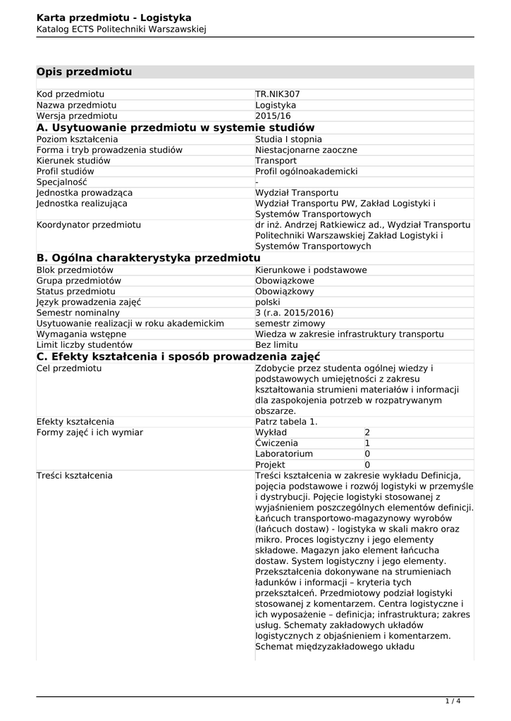 Karta przedmiotu - Logistyka Katalog ECTS Politechniki Warszawskiej Opis przedmiotu Kod przedmiotu Nazwa przedmiotu Wersja przedmiotu TR.NIK307 Logistyka 2015/16 A. Usytuowanie przedmiotu w systemie studiów Poziom kształcenia Forma i tryb prowadzenia studiów Kierunek studiów Profil studiów Specjalność Jednostka prowadząca Jednostka realizująca Koordynator przedmiotu Studia I stopnia Niestacjonarne zaoczne Transport Profil ogólnoakademicki Wydział Transportu Wydział Transportu PW, Zakład Logistyki i Systemów Transportowych dr inż. Andrzej Ratkiewicz ad., Wydział Transportu Politechniki Warszawskiej Zakład Logistyki i Systemów Transportowych B. Ogólna charakterystyka przedmiotu Blok przedmiotów Grupa przedmiotów Status przedmiotu Język prowadzenia zajęć Semestr nominalny Usytuowanie realizacji w roku akademickim Wymagania wstępne Limit liczby studentów Kierunkowe i podstawowe Obowiązkowe Obowiązkowy polski 3 (r.a. 2015/2016) semestr zimowy Wiedza w zakresie infrastruktury transportu Bez limitu C. Efekty kształcenia i sposób prowadzenia zajęć Cel przedmiotu Efekty kształcenia Formy zajęć i ich wymiar Treści kształcenia Zdobycie przez studenta ogólnej wiedzy i podstawowych umiejętności z zakresu kształtowania strumieni materiałów i informacji dla zaspokojenia potrzeb w rozpatrywanym obszarze. Patrz tabela 1. Wykład 2 Ćwiczenia 1 Laboratorium 0 Projekt 0 Treści kształcenia w zakresie wykładu Definicja, pojęcia podstawowe i rozwój logistyki w przemyśle i dystrybucji. Pojęcie logistyki stosowanej z wyjaśnieniem poszczególnych elementów definicji. Łańcuch transportowo-magazynowy wyrobów (łańcuch dostaw) - logistyka w skali makro oraz mikro. Proces logistyczny i jego elementy składowe. Magazyn jako element łańcucha dostaw. System logistyczny i jego elementy. Przekształcenia dokonywane na strumieniach ładunków i informacji – kryteria tych przekształceń. Przedmiotowy podział logistyki stosowanej z komentarzem. Centra logistyczne i ich wyposażenie – definicja; infrastruktura; zakres usług. Schematy zakładowych układów logistycznych z objaśnieniem i komentarzem. Schemat międzyzakładowego układu 1/4 Karta przedmiotu - Logistyka Katalog ECTS Politechniki Warszawskiej Opis przedmiotu Metody oceny Metody sprawdzania efektów kształcenia Egzamin Literatura Witryna www przedmiotu logistycznego z opisem elementów. Schemat blokowy układu logistycznego w skali makro z krótkim opisem bloków. Zadanie logistyczne – dla przedsiębiorstwa produkcyjnego i dystrybucyjnego (schemat i opis). Organizacja struktury logistycznej w przedsiębiorstwie - istota i zadania systemu logistycznego w przedsiębiorstwie. Układy transportowe w przepływach ładunków. Metody prezentacji i zapisu przepływu ładunków wykres Sankey’a, wykres synoptyczny; karta procesu przepływu. Podstawy wymiarowania procesów i systemów logistycznych. Nakłady i koszty w logistyce. Nowoczesne koncepcje logistyki. Treści kształcenia w zakresie ćwiczeń projektowych Ćwiczenie obejmuje sporządzenie wykresu przepływu materiałów i procesu przepływu materiałów w zakładzie, obliczenie potrzebnej do realizacji procesu transportowego liczby środków transportu i ludzi, sporządzenie uproszczonego schematu procesu przepływu informacji związanego z przepływem materiałów i jego zwymiarowanie oraz obliczenie przybliżonych kosztów systemu logistycznego. Wykład: 2 kolokwia (kolokwium nr 1 - rozwiązanie zadania rachunkowego, kolokwium nr 2 - pytania otwarte. Ćwiczenia: realizacja zadań i ich zaliczenie Patrz tabela 1. nie Podręczniki: 1. Fijałkowski J.: Transport wewnętrzny w systemach logistycznych. Oficyna Wydawnicza Politechniki Warszawskiej, Warszawa 2000 2. Fijałkowski J.: Technologia magazynowania. Wybrane zagadnienia. Oficyna Wydawnicza Politechniki Warszawskiej, Warszawa 1995 Literatura uzupełniająca: 4. Taylor G.D.: Logistics Engineering Handbook. CRC Press, Boca Raton 2008 5. Skowronek Cz., Sarjusz-Wolski Z.: Logistyka w przedsiębiorstwie. PWE, Warszawa 2008 6. Bowersox D. J., Closs D. J.: Logistical Management: The Integrated Supply Chain Process. McGraw – Hill, 1996 Brak D. Nakład pracy studenta Liczba punktów ECTS Liczba godzin pracy studenta związanych z osiągnięciem efektów kształcenia 3 Wykłady: 18 Ćwiczenia: 9 Zapoznanie się z literaturą: 28 Przygotowanie do zaliczenia kolokwiów: 15 Przygotowanie do zaliczenia ćwiczeń: 15 Konsultacje: 5 Razem: 90 ECTS: 3 Liczba punktów ECTS na zajęciach wymagających Wykłady: 18 Ćwiczenia: 9 Konsultacje: 1 Razem bezpośredniego udziału nauczycieli akademickich: 28 ECTS: 1,0 Liczba punktów ECTS, którą student uzyskuje w 0 ramach zajęć o charakterze praktycznym 2/4 Karta przedmiotu - Logistyka Katalog ECTS Politechniki Warszawskiej Opis przedmiotu E. Informacje dodatkowe Uwagi Data ostatniej aktualizacji O ile nie powoduje to zmian w zakresie powiązań danego modułu zajęć z kierunkowymi efektami kształcenia w treściach kształcenia mogą być wprowadzane na bieżąco zmiany związane z uwzględnieniem najnowszych osiągnięć naukowych. 2015-06-13 20:08:55 Tabela 1. Efekty przedmiotowe Profil ogólnoakademicki - wiedza Efekt: Kod: Weryfikacja: Powiązane efekty kierunkowe Powiązane efekty obszarowe Efekt: Kod: Weryfikacja: Powiązane efekty kierunkowe Powiązane efekty obszarowe Efekt: Kod: Weryfikacja: Powiązane efekty kierunkowe Powiązane efekty obszarowe Posiada wiedzę o przedmiotowym podziale logistyki stosowanej, zna przesłanki tego podziału W01 wykład: kolokwium nr 2 - pytania otwarte Tr1A_W07, Tr1A_W05 T1A_W02, T1A_W07, T1A_W08, InzA_W02, InzA_W03, T1A_W02, T1A_W07, T1A_W08, T1A_W09, InzA_W02, InzA_W03, InzA_W04 Ma wiedzę na temat podstaw wymiarowania procesów i systemów logistycznych ze względu na liczbę ludzi i urządzeń, nakłady i koszty W02 wykład: kolokwium nr 1 - rozwiązanie zadania rachunkowego, kolokwium nr 2 - pytania otwarte Tr1A