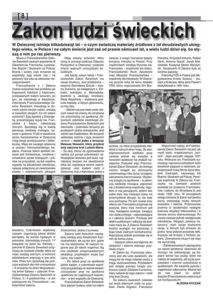 Zakon ludzi świeckich [8] W Osiecznej istnieje kilkadziesiąt lat – o czym świadczą materiały źródłowe z lat dwudziestych ubiegłego wieku, w Polsce i na całym świecie jest zaś od prawie ośmiuset lat, a wielu ludzi dziwi się, bo słyszą o nim po raz pierwszy. Mowa o Franciszkańskim Zakonie Świeckich zwanym popularnie III Zakonem św. Franciszka, a pierwotnie Braćmi i Siostrami od Pokuty. Bracia i siostry czyli tercjarze tej wspólnoty żyją wśród nas i na pierwszy rzut oka są właściwie nierozpoznawalni. Franciszkanów z I Zakonu można rozpoznać bez problemu po brązowych habitach z kapturami, przepasanych białym sznurem, po tym, że mieszkają w klasztorze. Członkowie Franciszkańskiego Zakonu Świeckich mieszkają w domach wśród swoich rodzin, chodzą w świeckich strojach. Co ich zatem wyróżnia? Żyją zgodnie z Ewangelią, przestrzegają reguły św. Franciszka z Asyżu, odwiedzają chorych. Spotykają się w każdą pierwszą niedzielę miesiąca, zawsze o godzinie 14.00 w klasztorze ojców franciszkanów w Osiecznej mają swoje pomieszczenie i biblioteczkę. Mają też swojego opiekuna w postaci franciszkańskiego kapłana. Podczas takich spotkań zawsze jest konferencja, modlitwa i omawianie spraw bieżących i planów na przyszłość, są też wspólne wyjazdy na kilkudniowe rekolekcje, zawsze połączone ze zwiedzaniem miasta i odwiedzinami jakiegoś Mają własny sztandar, który niosą w procesji podczas Odpustu Porcjunkuli w Osiecznej i podczas innych ważnych uroczystości kościelnych. Jak każdy zakon także i Franciszkański Zakon Świeckich ma swoje struktury. Jest przełożona – obecnie Stanisława Schulz – siostra Zuzanna, jej zastępczyni s. Elżbieta, sekretarz s. Bernadetta, skarbnik s. Jadwiga, kronikarz, Rada Wspólnoty – wybierana podczas kapituły, w tajnym głosowaniu, co trzy lata. - Wśród nas jest wiele osób, których nawet nie znamy, bo od dawna nie przychodzą na spotkania. Aktywnych członków osieckiego Zakonu Franciszkanów Świeckich jest dwunastu – jedenastu tercjarzy po profesjach i jedna nowicjuszka. Jest wśród nas małżeństwo. Bo tercjarze zakładają rodziny i żyją świeckim życiem. – mówi jeden z tercjarzy Mateusz Nowacki, który przybrał imię zakonne brat Ludwik-Maria. – Są tacy, którzy do zgromadzenia należą już ponad czterdzieści lat. Rozpiętość wiekowa jest duża, najmłodszy tercjarz ma dwadzieścia kilka lat, najstarsza siostra osiemdziesiąt. Jest siedem osób z Osiecznej, trzy z Kąkolewa, jedna z klasztoru. Członkowie wspólnoty czasem organizują jakieś zbiórki pieniędzy, by pomóc będącym w potrzebie, odwiedzają chorych. 17 listopada na dzień św. Elżbiety – patronki III Zakonu Świeckich przynoszą do kościoła chlebki, które po mszy rozdają wiernym, a siostrom elżbietankom wręczają w tym dniu róże. Poza tym spotykają się podczas ważnych dla nich uroczystości – 9 września na dzień błogosławionej Anieli Salawy – patronki Franciszkańskiego Zakonu Świeckich w Polsce, 3 i 4 października – w dni poświęcone św. Franciszkowi – założycielowi zakonu. Drzeczkowa i jedna z Łoniewa. Zakony ludzi świeckich najczęściej istnieją przy klasztorach franciszkańskich, ale są też tam, gdzie nie ma klasztorów. W naszym regionie jest 29 takich wspólnot. Są one skutkiem przeprowadzonych rekolekcji, przykładem może być Lipno, czy Leszno. - Do takich grup na spotkania jeździ kapłan, a członkowie wspólnoty przyjeżdżają na ważne święta i uroczystości oraz na spotkania opłatkowe do najbliższych klasztorów – w tym wypadku do Osiecznej. Franciszkański Zakon Świeckich liczy pięćset tysięcy osób na całym świecie, z czego trzynaście tysięcy tercjarzy mieszka w Polsce. Przy wspólnotach działają Rycerze św. Franciszka – wspólnota dla dzieci, Franciszkański Ruch Apostolski oraz Młodzież Franciszkańska – wspólnoty dla młodzieży. W Osiecznej jeszcze kilka lat temu działało FRA, które organizowało Dni Bra- Petrarka, Krzysztof Kolumb, Rafael Santi, Antonio Gaudi, Jacek Malczewski, Kardynał Stefan Wyszyński. Tercjarzami III Zakonu było aż siedmiu papieży. Patronką FZŚ w Polsce jest błogosławiona Aniela Salawa – służąca z Krakowa, którą Jana Paweł II beatyfikował w 1991 roku. terstwa, na które przyjeżdżała młodzież z różnych stron kraju. Ze skategoryzowanych wiekowo grup zawsze jednak się wyrasta, a ówcześni działacze nie znaleźli następców. Pozostał więc Franciszkański Zakon Świeckich, do którego można wstąpić po ukończeniu osiemnastego roku życia i przyjęciu sakramentu bierzmowania. Wystarczy przyjść na spotkanie – w pierwszą niedzielę miesiąca, zapoznać się z działalnością wspólnoty, regułami w niej panującymi, potem dać sobie dwa, trzy miesiące czasu na przemyślenie decyzji, by nie była ona pochopna. Po tym czasie przy ołtarzu św. Franciszka przyjmuje się postulat, który trwa minimum pół roku. Następnie nowicjat, trwający rok i dalej profesja – odpowiadająca w I zakonie ślubom. Profesja jest aktem publicznym i odbywa się podczas mszy św. Z Zakonu Świeckich można wystąpić nie ponosząc z tego tytułu żadnych konsekwencji. Najczęściej jednak pozostaje się w nim do końca życia. - Naszym celem jest dążenie do świętości i dawnie dobrego przykładu innym. III Zakon św. Franciszka stworzony jest dla ludzi świeckich, ale mogą też do niego należeć osoby z kręgu duchowieństwa. Przykładem jest świętej pamięci ksiądz proboszcz osiecki Zdzisław Łuniewicz, który należał do tego zakonu i nosił imię brat Onufry. Do zakonu świeckich należało też wiele sławnych osób na przykład: Dante Alighieri, Francesco Wspomnieć należy, że Franciszkański Zakon Świeckich nie jest, jak myśli wielu, współczesnym „tworem”. Jego początki sięgają 1221 roku. Wówczas św. Franciszek wychodząc naprzeciw potrzebom l