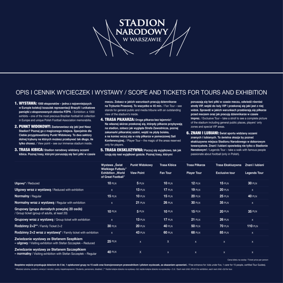 OPIS I CENNIK WYCIECZEK I WYSTAWY / SCOPE AND TICKETS FOR TOURS AND EXHIBITION 1. WYSTAWA: 1000 eksponatów – jedna z najcenniejszych w Europie kolekcji koszulek reprezentacji Brazylii i unikatowe pamiątki z eksponowanych zbiorów PZPN. / Exhibition: a 1000 exhibits – one of the most precious Brazilian football kit collection in Europe and unique Polish Football Association memorabilia. 2. PUNKT WIDOKOWY: Zastanawiasz się jaki jest Nasz Stadion? Poznaj go z magicznego miejsca. Specjalnie dla Ciebie przygotowaliśmy Punkt Widokowy. To dwa sektory dolnej trybuny na których możesz przebywać tak długo, ile tylko chcesz. / View point – see our immense stadium inside. 3. TRASA KIBICA: Stadion narodowy widziany oczami kibica. Poznaj trasy, którymi poruszają się fani piłki w czasie meczu. Zobacz w jakich warunkach pracują dziennikarze na Trybunie Prasowej. To wszystko w 45 min. / Fan Tour – see stands for general public and media tribune with an outstanding view of the stadium’s inside. 4. TRASA PIŁKARZA: Droga piłkarza bez tajemnic! Na własnej skórze przekonaj się, którędy piłkarze przybywają na stadion, zobacz jak wygląda Strefa Zawodnicza, poznaj zakamarki piłkarskiej szatni, wejdź na płytę boiska, a na koniec wczuj się w rolę piłkarza w pomeczowej Sali Konferencyjnej. / Player Tour – the magic of the areas reserved only for players. 5. TRASA EKSKLUZYWNA: Poczuj się wyjątkowo, tak jak czują się nasi wyjątkowi goście. Poznaj trasy, którymi Wystawa „Świat Wielkiego Futbolu” Exhibition „World of Great Football” poruszają się fani piłki w czasie meczu, odwiedź również strefę VIP, wejdź do loży VIP i przekonaj się jaki jest z niej widok. Sprawdź w jakich warunkach przebierają się piłkarze przed meczem oraz jak pracują dziennikarze w czasie imprez. / Exclusive Tour – take a stroll to see a complete picture of the stadium including general public places, players’ only zones and special VIP areas. 6. ZNANI I LUBIANI: Świat sportu widziany oczami znanych i lubianych. To świetna okazja by poznać ekskluzywne miejsca Stadionu Narodowego w doborowym towarzystwie. Znani i lubiani opowiedzą nie tylko o Stadionie Narodowym! / Legends Tour – take a walk with famous people passionate about football (only in Polish). Punkt Widokowy Trasa Kibica Trasa Piłkarza Trasa Ekskluzywna Znani i lubiani View Point Fan Tour Player Tour Exclusive tour Legends Tour 10 PLN 5 PLN 10 PLN 12 PLN 15 PLN 30 PLN x 13 PLN 17 PLN 19 PLN 20 PLN x 15 PLN 10 PLN 15 PLN 20 PLN 25 PLN 40 PLN x 21 PLN 26 PLN 30 PLN 35 PLN x 10 PLN 5 PLN 10 PLN 15 PLN 20 PLN 35 PLN x 13 PLN 17 PLN 21 PLN 26 PLN x 30 PLN 20 PLN 40 PLN 50 PLN 70 PLN 110 PLN x 43 PLN 60 PLN 68 PLN 85 PLN x Zwiedzanie wystawy ze Stefanem Szepłkiem – ulgowy / Visiting exhibition with Stefan Szczepłek – Reduced 25 PLN x X x x x Zwiedzanie wystawy ze Stefanem Szczepłkiem – normalny / Visiting exhibition with Stefan Szczepłek – Regular 40 PLN X x x x x Ulgowy* / Reduced Ulgowy wraz z wystawą / Reduced with exhibition Normalny / Regular Normalny wraz z wystawą / Regular with exhibition Grupowy (grupa dorosłych powyżej 20 osób) / Group ticket (group of adults, at least 20) Grupowy wraz z wystawą / Group ticket with exhibition Rodzinny 2+2** / Family Ticket 2+2 Rodzinny 2+2 wraz z wystawą* / Family ticket with exhibition Cena biletu na osobę / Ticket price per person Bezpłatne wejście przysługuje dzieciom do 5 lat, 1 opiekunowi grupy na 15 osób oraz licencjonowanym przewodnikom i pilotom wycieczek, za okazaniem uprawnień. / Free entrance for: kids under five, 1 carer for 15 people, certified Tour Guides). * Młodzież szkolna, studenci, emeryci i renciści, osoby niepełnosprawne / Students, pensioners, disabled. | ** Każde kolejne dziecko na wystawę +5zł, każde kolejne dziecko na wycieczkę + 2 zł. / Each next child +PLN 5 for exhibition, each next child +2zł for tour.