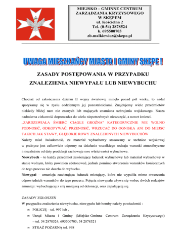 MIEJSKO – GMINNE CENTRUM ZARZĄDZANIA KRYZYSOWEGO W SKĘPEM ul. Kościelna 2 Tel. (0-54) 2878524 k. 695500703 [email protected] _________________________________________________________________________________ ZASADY POSTĘPOWANIA W PRZYPADKU ZNALEZIENIA NIEWYPAŁU LUB NIEWYBUCHU Chociaż od zakończenia działań II wojny światowej minęło ponad pół wieku, to nadal spotykamy się w życiu codziennym jej pozostałościami. Znajdujemy wiele przedmiotów niekiedy bliżej nam nie znanych lub mających znamiona uzbrojenia wojskowego. Nasza nadmierna ciekawość doprowadza do wielu niepotrzebnych nieszczęść, a nawet śmierci. „ZARDZEWIAŁA ŚMIERĆ CIĄGLE GROŹNA" KATEGORYCZNIE NIE WOLNO PODNOSIĆ, ODKOPYWAĆ, PRZENOSIĆ, WRZUCAĆ DO OGNISKA ANI DO MIEJSC TAKICH JAK STAWY, GŁĘBOKIE ROWY ZNALEZIONYCH NIEWYBUCHÓW Należy mieć świadomość, że materiał wybuchowy stosowany w technice wojskowej w praktyce jest całkowicie odporny na działanie wszelkiego rodzaju warunki atmosferyczne i niezależnie od daty produkcji zachowuje swe właściwości wybuchowe. Niewybuch – to każdy przedmiot zawierający ładunek wybuchowy lub materiał wybuchowy w stanie wolnym, który powinien zdetonować, jednak pomimo stworzenia warunków koniecznych do tego procesu nie doszło do wybuchu. Niewypał – amunicja zawierająca ładunek miotający, która nie wypaliła mimo stworzenia odpowiednich warunków do tego procesu. Pojęcia niewypału używa się wobec dwóch rodzajów amunicji: wybuchającej z siłą mniejszą od detonacji, oraz zapalającej się. ZASADY ZGŁOSZEŃ W przypadku znalezienia niewybuchu, niewypału lub bomby należy powiadomić : • POLICJĘ – tel. 997 lub , • Urząd Miasta i Gminy (Miejsko-Gminne Centrum Zarządzania Kryzysowego) – tel. 54 2878524; 695500703; 54 2878521 • STRAŻ POŻARNĄ tel. 998 OSOBY PRZEKAZUJĄC ZGŁOSZENIE / ZAWIADOMIENIE POWINNY PODAĆ DYŻURNEMU POLICJI LUB URZĘDOWI MIASTA I GMINY: - opis przedmiotu (długość, średnica); - dokładne miejsce i data wykrycia; - dane osoby, która wykryła niewybuch i może wskazać dokładne miejsce jego położenia. Również należy powiadomić Policję o każdym wypadku powstałym w skutek działania tych przedmiotów. Za pilne zgłoszenia należy uważać takie, które donoszą o wykryciu przedmiotów wybuchowych i niebezpiecznych, które stanowią szczególne niebezpieczeństwo dla ludzi. Pilne zgłoszenia będą realizowane natychmiast, to znaczy nie później niż w ciągu 24 godzin, pozostałe realizuje się nie później niż w ciągu 72 godzin. Patrol rozminowania odpowiedzialny za oczyszczanie terenu naszego miasta z niewybuchów lub niewypałów znajduje się w JW w Inowrocławiu, ul. Dworcowa 56: 2 p. inż. (realizuje rozminowanie tylko po zgłoszeniu przez Policję, Urząd Miasta i Gminy lub leśnictwo) Po zgłoszeniu należy w miarę możliwości zabezpieczyć teren przed dostępem dzieci i innych osób. Zadania (przedsięwzięcia, czynności) realizowane przez jednostkę Policji: 1. Przyjęcie informacji o zdarzeniu. 2. Wysłanie na miejsce zdarzenia patrolu w celu zebrania dodatkowych, szczegółowych informacji związanych ze zdarzeniem oraz zabezpieczenia miejsca ujawnienia niewypału lub niewybuchu. 3. Powiadomienie patrolu saperskiego oraz, w zależności od zaistniałej sytuacji, innych służb i inspekcji. 4. W razie potrzeby w trybie alarmowym skierowanie na miejsce zdarzenia dodatkowych funkcjonariuszy. 5. W razie potrzeby powołanie i organizacja pracy doraźnego sztabu kryzysowego. 6. Przeprowadzenie czynności wyjaśniających (dochodzeniowo-śledczych). Skępe, dn. 26.09.2014 r. Jednostkom organizacyjnym i podmiotom przekazał INSPEKTOR Zbigniew Małkiewicz