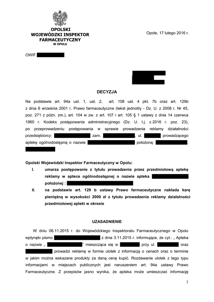 OPOLSKI WOJEWÓDZKI INSPEKTOR FARMACEUTYCZNY Opole, 17 lutego 2016 r. W OPOLU OWIF.8523.1.33.2015 Maciej Piotrowiak ul. Witosa 1 46-200 Kluczbork DECYZJA Na podstawie art. 94a ust. 1, ust. 2, art. 108 ust. 4 pkt. 7b oraz art. 129b z dnia 6 września 2001 r. Prawo farmaceutyczne (tekst jednolity - Dz. U. z 2008 r. Nr 45, poz. 271 z późn. zm.), art. 104 w zw. z art. 107 i art. 105 § 1 ustawy z dnia 14 czerwca 1960 r. Kodeks postępowania administracyjnego (Dz. U. t.j. z 2016 r. poz. 23), po przeprowadzeniu postępowania w sprawie prowadzenia reklamy działalności przedsiębiorcy: Macieja Piotrowiaka zam. 46-200 Kluczbork, ul. Witosa 1 prowadzącego aptekę ogólnodostępną o nazwie Apteka Na dobre i na złe położoną: 46-200 Kluczbork, ul. Wołczyńska 4 Opolski Wojewódzki Inspektor Farmaceutyczny w Opolu: I. umarza postępowanie z tytułu prowadzenia przez przedmiotową aptekę reklamy w aptece ogólnodostępnej o nazwie apteka Na dobre i na złe położonej : 46-200 Kluczbork, ul. Wołczyńska 4 II. na podstawie art. 129 b ustawy Prawo farmaceutyczne nakłada karę pieniężną w wysokości 2000 zł z tytułu prowadzenia reklamy działalności przedmiotowej apteki w okresie UZASADNIENIE W dniu 06.11.2015 r. do Wojewódzkiego Inspektoratu Farmaceutycznego w Opolu wpłynęło pismo Nowej Farmacji Sp. z o.o. z dnia 3.11.2015 r. informujące, że cyt.: „ Apteka o nazwie „ Na Dobre i Na Złe” mieszcząca się w Kluczborku przy ul. Podwale 24 oraz Wołczyńskiej 4 prowadzi reklamę w formie ulotek z informacją o cenach oraz o terminie w jakim można wskazane produkty za daną cenę kupić. Rozdawanie ulotek z tego typu informacjami w miejscach publicznych jest naruszeniem art. 94a ustawy Prawo Farmaceutyczne. Z przepisów jasno wynika, że apteka może umieszczać informację 1 o nazwie apteki, adresie oraz godzinach otwarcia. Według mojej oceny doszło do naruszenia zakazu reklamy poprzez umieszczenie listy cenowej z nazwą apteki, która nie powinna się znajdować na ulotce. Opisane powyżej działania mogą nosić znamiona niedozwolonej reklamy apteki i jej działalności. Zwracam się z prośbą o zajęcie stanowiska przez Wojewódzki Inspektorat Farmaceutyczny w powyższej sprawie.” Z pismem jako załącznik przesłano również cytowaną wyżej ulotkę. W dniu 10.11.2015 r. drogą mailową do Wojewódzkiego Inspektoratu Farmaceutycznego w Opolu wpłynęło pismo od nadawcy: [email protected] , w którym znalazła się informacja, że cyt.: „ Witam, w załączniku przesyłam Cennik leków z apteki „Na dobre i na złe” z Kluczborka, ul. Podwale 24. Chciałem się dowiedzieć jakie jest stanowisko WIF w tej sprawie, czy można zaliczyć taki dumping cenowy do „czynu nieuczciwej konkurencji”? Jak to jest możliwe, że takie sytuacje maja miejsce w Kluczborku?”. Wobec powzięcia powyższych informacji w dniu 21.12.2015 r. Opolski Wojewódzki Inspektor Farmaceutyczny w Opolu wszczął postępowanie administracyjne z urzędu w przedmiocie naruszenia przez przedsiębiorcę – Macieja Piotrowiaka zam. 46-200 Kluczbork, ul. Witosa 1 prowadzącego aptekę ogólnodostępną o nazwie Apteka Na dobre i na złe położoną: 46-200 Kluczbork, ul. Wołczyńska 4 przepisów art. 94a ust. 1 ustawy z dnia 6 września 2001r. Prawo farmaceutyczne (t. j. – Dz. U. z 2008 r. Nr 45, poz. 271 z późn. zm). Zawiadomienie zostało doręczone Stronie w dniu 23.12.2015 r. Pismem z dnia 21.12.2015 r. Opolski Wojewódzki Inspektor Farmaceutyczny w Opolu wezwał Stronę do cyt.: „ (…)złożenia dokładnych wyjaśnień w sprawie okoliczności związanych z rozpowszechnianiem ulotek: a) kto był zleceniodawcą druku przedmiotowych materiałów i jaki podmiot wykonał to zlecenie, b) kto odpowiada za rozpowszechnianie przedmiotowych materiałów oraz wskazanie miejsca/miejsc gzie były lub są rozpowszechniane, c) w jakim okresie czasu dystrybuowane były ulotki, d) czy przedmiotowe ulotki są nadal dystrybuowane.” Wezwanie zostało doręczone Stronie w dniu 23.12.2015 r. W odpowiedzi na wezwanie w dniu 08.01.2016 r. do Wojewódzkiego Inspektoratu Farmaceutycznego w Opolu wpłynęło pismo Strony z dnia 04.01.2016 r., w którym Strona oświadczyła, że cyt.: „ (…) ja, niżej podpisany Maciej Piotrowiak zleciłem druk 50 ulotek informacyjnych przeznaczonych dla personelu aptecznego, materiały te nie były przeznaczone dla pacjentów, a jedynie miały charakter informacyjny i edukacyjny dla personelu apteki aby mógł on przyswoić aktualne ceny preparatów. Nie prowadziłem kolportażu tych materiałów poza terenem apteki, ww. ulotki mogły trafić w posiadanie 2 pacjenta, gdyż znajdowały się przy stanowisku komputerowym. Materiały te znajdowały się przez około 5 dni na terenie apteki w dniach od 10.10.2015 do 15.10.2015. Nie prowadzę żadnej dystrybucji ulotek apteki.” Pismem znak OWIF.8523.1.33.2015.JF z dnia .01.2016 r. Opolski Wojewódzki Inspektor Farmaceutyczny w Opolu zawiadomił Stronę o zamiarze zakończenia postępowania w związku ze zgromadzeniem całego materiału dowodowego oraz pouczył o prawie do zapoznania się z materiałem dowodowym i ustosunkowania do niego w terminie 7 dni od dnia otrzymania zawiadomienia. Zawiadomienie zostało doręczone Stronie w dniu Do dnia wydania decyzji Strona nie skorzystała z prawa do wypowiedzenia się co do zebranych dowodów, materiałów i złożenia wyjaśnień, przysługującego jej na podstawie art. 10 §1 Kpa. Po rozpatrzeniu całego materiału dowodowego w sprawie Opolski Wojewódzki Inspektor Farmaceutyczny stwierdził, co następuje: 1. Stan faktyczny: Strona postępowania – Maciej Piotrowiak zam. 46-200 Kluczbork, ul. Witosa 1 prowadzi na podstawie zezwolenia na prowadzenie apteki znak OWIF.8520.1.12.2013 wydanego przez Opolskiego Wojewódzkiego Inspektora Farmaceutycznego w Opolu z dnia 19.07.2013 r., aptekę ogólnodostępną o nazwie Apteka Na dobre i na złe położoną: 46-200 Kluczbork, ul. Wołczy
