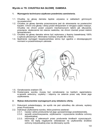 Wyrób nr 79: CHUSTKA NA GŁOWĘ DAMSKA 1. Wymagania techniczno-użytkowe przedmiotu zamówienia. 1.1. Chustka na głowę damska będzie używana w zakładach górniczych na powierzchni. 1.2. Chustka na głowę damska przeznaczona jest do stosowania na powierzchni kopalni. Chroni ona głowę i włosy przed wkręceniem w wirujące części maszyn. Chustka nie chroni przed urazami mechanicznymi takimi jak stłuczenie, przecięcie, skaleczenie lub otarcie naskórka, nie chroni również przed niskimi temperaturami. 1.3. Chustka na głowę damska winna być wykonana z tkaniny bawełnianej 100% o splocie płóciennym. Minimalne rozmiary chustki 80 x 80cm. 1.4. Spełnienie wymagań bezpieczeństwa winno być zgodne z obowiązującymi normami w przedmiotowym zakresie. 1.5. Oznakowanie znakiem CE. 1.6. Dostarczane wyroby muszą być oznakowane na każdym egzemplarzu w sposób widoczny, czytelny i odporny na zatarcie przez cały okres jego użytkowania. 2. Wykaz dokumentów wymaganych przy składaniu oferty. 2.1. Dokument potwierdzający, że wyrób nie jest szkodliwy dla zdrowia, wydany przez Producenta. 2.2. Instrukcja użytkowania wyrobu, która powinna zawierać: 2.3.1. nazwę i adres producenta lub jego upoważnionego przedstawiciela, 2.3.2. sposób przechowywania, użytkowania i czyszczenia środków ochrony indywidualnej, 2.3.3. informację o zalecanych przez producenta środkach czyszczących, które nie będą negatywnie oddziaływać na użytkownika środków ochrony indywidualnej oraz na oferowany wyrób. 1/2 3. Wykaz dokumentów wymaganych przy pierwszej i kolejnych dostawach. 3.1. Wraz z pierwszą dostawą wyrobu na kopalnie Dostawca winien dołączyć: instrukcję użytkowania, przechowywania i konserwacji, dokument potwierdzający, że wyrób nie jest szkodliwy dla zdrowia, wydany przez Producenta, a przy każdej dostawie deklarację zgodności WE i świadectwo jakości. 2/2