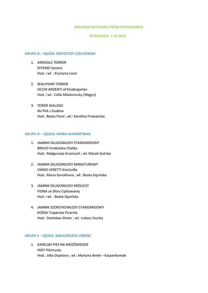KRAJOWA WYSTAWA PSÓW MYŚLIWSKICH BYDGOSZCZ 7.10.2012 GRUPA III – SĘDZIA: KRZYSZTOF CZECHOWSKI 1. AIREDALE TERRIER EFFENDI Sonora Hod. i wł. : Krystyna Lizoo 2. SEALYHAM TERRIER OCCHI ARDENTI of Kindergarten Hod. i wł.: Csilla Mladoniczky (Węgry) 3. TERIER WALIJSKI NUTKA z Szubina Hod.: Beata Parol ; wł.: Karolina Prowancka GRUPA IV – SĘDZIA: MARIA WAWRZYNIAK 1. JAMNIK DŁUGOWŁOSY STANDARDOWY BRAVO Fordooska Chatka Hod.: Małgorzata Krumrych ; wł. Marek Gehrke 2. JAMNIK DŁUGOWŁOSY MINIATUROWY VINNO VERETTI Kinchville Hod.: Maria Gorokhova ; wł.: Beata Gęsioska 3. JAMNIK DŁUGOWŁOSY KRÓLICZY FIONA ze Sfory Cętkowanej Hod. i wł. : Beata Gęsioska 4. JAMNIK SZORSTKOWŁOSY STANDARDOWY KORSA Traperska Psiarnia Hod.: Stanisław Ginter ; wł.: Łukasz Szurlej GRUPA V – SĘDZIA: MAŁGORZATA LORENC 1. KARELSKI PIES NA NIEDŹWIEDZIE INDY Pikimusta Hod.: Jitka Dopitova ; wł.: Martyna Binek – Kasperkowiak 2. ŁAJKA ZACHODNIOSYBERYJSKA SIENGA z Mroźnej Doliny Hod.: Bogdan Loręcki ; wł.: Antoni Świstowski GRUPA VI – SĘDZIA: MAŁGORZATA LORENC 1. GOOCZY POLSKI PETRA El-halem Hod. i wł.: Maria Minakowska 2. BEAGLE UPS’E DAISY z Krainy Szczęścia Hod.: Lilianna Bachurzewska ; wł.: Igor Semenov (Rosja) 3. GOOCZY SCHILLERA FAUNA z Ostowej Ostoi Hod.: J.T.Oset ; wł.: Anna i Janusz Jedlioscy 4. POSOKOWIEC BAWARSKI ŁOSIA znad Wełny Hod.: Włodzimierz Kosmecki ; wł.: Antoni Szurlej GRUPA VII – SĘDZIA: MAŁGORZATA LORENC 1. WYŻEŁ NIEMIECKI SZORSTKOWŁOSY IKAR Spokojne Łowisko Hod. i wł.: Henryk Tomaszewski 2. MAŁY MUNSTERLANDER CIRIUS z Niziny Mławskiej Hod.: Halina Rudnicka ; wł.: Zbigniew Fesser 3. SETER IRLANDZKI GAJA UNO z Oraoskiego Wzgórza Hod. i wł.: Elżbieta Klimaszewska 4. WYŻEŁ WĘGIERSKI KRÓTKOWŁOSY IVO Rudy Nos Hod.: Tomasz Gottel ; wł.: Dominika Pora GRUPA VIII – SĘDZIA: KRZYSZTOF CZECHOWSKI 1. FLAT COATED RETRIEVER WONDER VALLEY CHANEL Hod.: Dementeva E. ; wł.: Tatiana Kislitzina (Rosja) 2. LABRADOR RETRIEVER VERONA STYLE Bella Mare Hod.: Sonia Czajor ; wł.: Monika Dowgiałło, Sonia Czajor 3. GOLDEN RETRIEVER Catch de Wind ACY Hod. i wł.: Jutta Wolf (Niemcy) 4. COCKER SPANIEL ANGIELSKI Bunia z Polany Kłapouchego Hod.: Piotr Leszczyoski : wł.: Elżbieta Pejka GRUPA X – SĘDZIA: MAŁGORZATA LORENC 1. CHART POLSKI NEKTARYNKA Acalantis Hod.: Tomasz Stasiukiewicz ; wł.: Dariusz Drozdowski 2. CHART AFGAOSKI INDISTINGUISHABLE IDEA Varius Avis Hod.: Agnieszka Bonk ; wł.: Eliza Adamowska 3. CHART ROSYJSKI BORZOJ RACHMANINOFF Magnus Borzij Hod.: Monika Jaraczyoska ; wł.: Danuta Leśniczak 4. WHIPPET LEESAH Vincit Omnia Hod.: Maria Banasiak ; wł.: Maria Banasiak, Anna Szynkiewicz KONKURS „MŁODY PREZENTEKR” GRUPA MŁODSZA 1. ALEKSANDRA GUSOWSKA 2. JULIA FOKSIOSKA 3. MAŁGORZATA SUPRYN GRUPA STARSZA 1.ELŻBIETA JEDLIOSKA ZWYCIĘZCA DNIA: ALEKSANDRA GUSOWSKA NAJPIĘKNIEJSZE BABY – SĘDZIA: MAŁGORZATA LORENC 1. JAMNIK SZORSTKOWŁOSY MINIATUROWY FINA Zwycięski Bór Hod.: Bolesław Kozłowski ; wł.: Anna Rybarczyk 2. WEST HIGHLAND WHITE TERRIER CARLOS SNOW STAR West Terrier White Hod. i wł.: Paulina Gorzyoska 3. BASSET HOUND TRIOLA Galopująca Fufla Hod. i wł.: Dorota Gąsiorowska 4. AIREDALE TERRIER ZANETTI Ruviido Hod.: Marta Kuligowska ; wł.: Jolanta I Ryszard Lomber NAJPIĘKNIEJSZE SZCZENIĘ – SĘDZIA: KRZYSZTOF CZECHOWSKI 1. TERIER SZKOCKI Terra Alite LITTLE MISS LOVER Hod. i wł. Joanna Śmidoda 2. COCKER SPANIEL ANGIELSKI ROCKET OF MAGIC Xilander Hod.: Anita Sędzicka ; wł.: Renata Waczyoska 3. CHART ROSYJSKI BORZOJ RUSAŁKA MICHAJŁOWNA od Matrioszki Hod.: Joanna Zielonka ; wł.: Małgorzata Hebel 4. WEST HIGHLAND WHITE TERRIER I’M ALWEYS IN YOUR MIND od Bobika Hod. i wł.: Ewa Iłczyk NAJPIĘKNIEJSZY JUNIOR – SĘDZIA: MAŁGORZATA LORENC 1. BEAGLE UPS’E DAISY z Krainy Szczęścia Hod.: Lilianna Bachurzewska ; wł.: Igor Semenov (Rosja) 2. WYŻEŁ NIEMIECKI SZORSTKOWŁOSY IKAR Spokojne Łowisko Hod. i wł.: Henryk Tomaszewski 3. GOOCZY POLSKI GRYF Cicha Sfora Hod.: Jan Cichy ; wł.: Ryszard Kotyś 4. WYŻEŁ CZESKI SZORSTKOWŁOSY – FOUSEK ARDI Biała Struga Hod. i wł.: Andrzej Jarmolioski NAJPIĘKNIEJSZY WETERAN – SĘDZIA: KRZYSZTOF CZECHOWSKI 1. WEST HIGHLAND WHITE TERRIER NUTSHELL Fanbellina ( ur. 5.5.2004 r.) Hod. i wł.: Izabela Sobczyoska 2. AIREDALE TERRIER Prima FILOZOFIA (ur.29.11.2003 r.) Hod.: Joanna Szczepaoska – Korpetta ; wł.: Krystyna Lizoo 3. COCKER SPANIEL ANGIELSKI COBEA Cockeret ( ur. 13.11.2003 r.) Hod. i wł.: Renata Waczyoska 4. WHIPPET TEKILA Ja-Cze-Ka (ur.15.01.2004 r.) Hod.: C.J.Kamioscy ; wł.: Michał Kowalkioski Najstarszym psem zgłoszonym na Krajową Wystawę Psów Myśliwskich jest CHART AFGAOSKI (ur. 21.01.2000r .) – CO BĘDZIE TO BĘDZIE Zikkurat (hod. Ewa Antczak ; wł. Marta Pacanowska), który również bardzo pięknie prezentował się na Ringu Honorowym. NAJPIĘKNIEJSZY PIES RAS POLSKICH – SĘDZIA: MAŁGORZATA LORENC 1. GOOCZY POLSKI KEISER Garncarskie Uroczysko Hod. i wł.: Paweł Koschany 2. CHART POLSKI NEKTARYNKA Acalantis Hod.: Tomasz Stasiukiewicz ; wł.: Dariusz Drozdowski NAJPIĘKNIEJSZY PIES UŻYTKOWY – SĘDZIA: LESZEK SIEJKOWSKI 1. LABRADOR RETRIEVER Escudo EXTREME RAIN FOR DOLBIA Hod.: Michał Tuliszewski ; wł.: Irmina Dudkowiak, Paulina Korpal 2. PETIT BASSET GRIFFON VANDEEN Vilauddens MARDOL Hod.: Marie Mard ; wł.: Ewa Pruszewicz 3. COCKER SPANIEL ANGIELSKI BU BELLA Liebeskind Hod. i wł.: Elżbieta Pejka 4. GOLDEN RETRIEVER STUNNING SURPRISE Złota Nadzieja Hod.: Marta Michalus ; wł. Marta Michalus, Katarzyna Długa NAJPIĘKNIEJSZY PIES KRAJOWEJ WYSTAWY PSÓW MYŚLIWSKICH – BYDGOSZCZ 2012 SĘDZIA: LESZEK SIEJKOWSKI 1. KARELSKI PIES NA NIEDŹWIEDZIE INDY Pikimusta Hod.: Jitka Dopitova ; wł.: Martyna Binek – Kasperkowiak 2. JAMNIK DŁUGOWŁOSY STANDARDOWY BRAVO Fordooska Chatka Hod.: Małgorzata Krumrych ; wł. Marek Gehrke 3. FLAT COATED RETRIEVER WONDER VALLEY CHANEL Hod.: Dementeva E. ; wł.: Tatiana Kislitzina (Rosja) 4. GOOCZY POLSKI PET