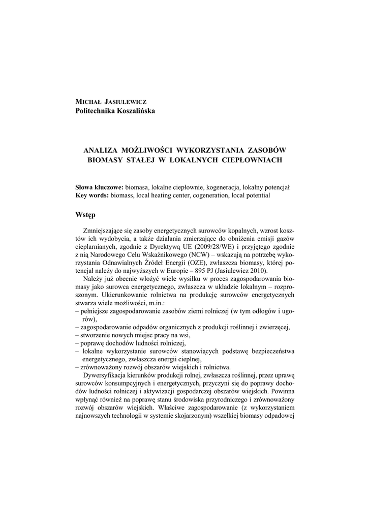 MICHAŁ JASIULEWICZ Politechnika Koszalińska ANALIZA MOśLIWOŚCI WYKORZYSTANIA ZASOBÓW BIOMASY STAŁEJ W LOKALNYCH CIEPŁOWNIACH Słowa kluczowe: biomasa, lokalne ciepłownie, kogeneracja, lokalny potencjał Key words: biomass, local heating center, cogeneration, local potential Wstęp Zmniejszające się zasoby energetycznych surowców kopalnych, wzrost kosztów ich wydobycia, a takŜe działania zmierzające do obniŜenia emisji gazów cieplarnianych, zgodnie z Dyrektywą UE (2009/28/WE) i przyjętego zgodnie z nią Narodowego Celu Wskaźnikowego (NCW) – wskazują na potrzebę wykorzystania Odnawialnych Źródeł Energii (OZE), zwłaszcza biomasy, której potencjał naleŜy do najwyŜszych w Europie – 895 PJ (Jasiulewicz 2010). NaleŜy juŜ obecnie włoŜyć wiele wysiłku w proces zagospodarowania biomasy jako surowca energetycznego, zwłaszcza w układzie lokalnym – rozproszonym. Ukierunkowanie rolnictwa na produkcję surowców energetycznych stwarza wiele moŜliwości, m.in.: – pełniejsze zagospodarowanie zasobów ziemi rolniczej (w tym odłogów i ugorów), – zagospodarowanie odpadów organicznych z produkcji roślinnej i zwierzęcej, – stworzenie nowych miejsc pracy na wsi, – poprawę dochodów ludności rolniczej, – lokalne wykorzystanie surowców stanowiących podstawę bezpieczeństwa energetycznego, zwłaszcza energii cieplnej, – zrównowaŜony rozwój obszarów wiejskich i rolnictwa. Dywersyfikacja kierunków produkcji rolnej, zwłaszcza roślinnej, przez uprawę surowców konsumpcyjnych i energetycznych, przyczyni się do poprawy dochodów ludności rolniczej i aktywizacji gospodarczej obszarów wiejskich. Powinna wpłynąć równieŜ na poprawę stanu środowiska przyrodniczego i zrównowaŜony rozwój obszarów wiejskich. Właściwe zagospodarowanie (z wykorzystaniem najnowszych technologii w systemie skojarzonym) wszelkiej biomasy odpadowej 108 Michał Jasiulewicz __________________________________________________________ z rolnictwa, przemysłu, gospodarki komunalnej, leśnictwa, a takŜe z produkcji rolnej ukierunkowanej na wykorzystanie energetyczne w lokalnych ciepłowniach – stwarza najbardziej efektywne rozwiązanie zarówno dla producentów energii cieplnej, jak i dostawców surowców energetycznych. UŜycie do celów energetycznych róŜnych odpadów biomasy oraz celowej produkcji surowców energetycznych to nie tylko moŜliwość, lecz takŜe konieczność ekologiczna, uwarunkowana gospodarczo (Grzybek 2008). Zgodnie z polskim prawem energetycznym lokalne władze podstawowych jednostek administracyjnych (gmin) są zobowiązane do opracowania planów zaopatrzenia w energię elektryczną i cieplną. W opracowanych planach powinny być uwzględnione lokalnie dostępne odnawialne źródła energii (Ustawa – Prawo energetyczne 1997). Aby ocenić ekonomiczną konkurencyjność wybranego nośnika energii lub systemu energii odnawialnej, naleŜy zdefiniować poszczególne obszary ich zastosowania i wewnątrz tych obszarów konkurujące z nimi inne systemy dostarczania energii. Potencjał ekonomiczny jest silnie uzaleŜniony od konwencjonalnych systemów, wysokości podatków, dofinansowania i cen energetycznych surowców kopalnych. Potencjał dostępny (uŜytkowany) określa, jaki strumień energii z biomasy moŜe być ostatecznie wykorzystany na cele energetyczne (jest on z reguły mniejszy od potencjału ekonomicznego) (red. Jasiulewicz 2009, 2010). Ograniczone moŜliwości produkcji instalacji wykorzystujących oferowaną energię odnawialną, określone zdolności funkcjonowania istniejących instalacji oraz inne bariery (w zakresie informacji, ograniczeń prawnych, administracyjnych) stanowią przeszkodę ekonomicznego uzasadnienia stosowania róŜnych nośników energii odnawialnej, uniemoŜliwiającą całkowitą eksploatację biomasy. Potencjał teoretyczny obejmuje całą ilość energii, potencjał techniczny – moŜliwą do wykorzystania część energii z technicznego punktu widzenia, potencjał ekonomiczny – to część energii, której wykorzystanie jest ekonomicznie uzasadnione, potencjał dostępny (uŜytkowany) stanowi realny udział w wytwarzaniu – jest zazwyczaj kilkakrotnie mniejszy od potencjału teoretycznego. W niniejszym opracowaniu przyjęto określać potencjał dostępny w zasięgu do 30 km od siedziby ciepłowni miejskiej. Za miarodajny naleŜy uznać takŜe potencjał techniczny, który określa korzystanie z biomasy w dłuŜszym horyzoncie czasowym, uwzględniając istniejące moŜliwości upraw energetycznych na potrzeby lokalnych ciepłowni. Stanowi on istniejący, dostępny potencjał, niewykorzystany energetycznie oraz uwzględnia zakładanie celowych plantacji upraw energetycznych (Jasiulewicz 2007). Zatem potencjał techniczny naleŜy traktować jako całą ilość energii, którą moŜna teoretycznie pozyskać za pomocą aktualnie dostępnych technologii. Prowadzone badania w zakresie potencjału biomasy, zarówno w kraju jak i za Analiza moŜliwości wykorzystania zasobów biomasy stałej w lokalnych ciepłowniach 109 __________________________________________________________ granicą, wskazują, Ŝe rozwój energetyki bazującej na biomasie jako paliwie stałym naleŜy ukierunkować głównie na produkcję energii cieplnej i elektrycznej w układzie skojarzonym (CHP – Combinet Heat and Power). WiąŜe się to z decentralizacją systemów i rozpowszechnieniem produkcji energii cieplnej i elektrycznej (CHP), a jednocześnie przyczynia się do wzrostu efektywności ekonomicznej i energetycznej. Ze względu na niską wartość kaloryczną biomasy świeŜej, uzaleŜnioną od wilgotności (od 6 MJ/kg przy wilgotności powyŜej 50% do ponad 19 MJ/kg przy wilgotności poniŜej 10%), a takŜe niewielki cięŜar (m3) biomasy zrębkowanej, najbardziej wskazane jest wykorzystywanie biomasy w układzie lokalnym (w promieniu do 30 km) (Jordan, Pieńkowski 2010, Jasiulewicz 2005). Wysoką sprawnością wyróŜnia s
