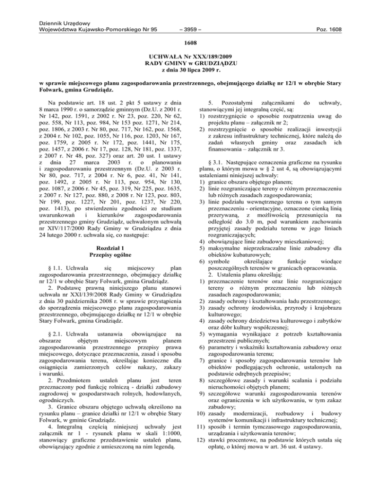 Dziennik Urzędowy Województwa Kujawsko-Pomorskiego Nr 95 – 3959 – Poz. 1608 1608 UCHWAŁA Nr XXX/189/2009 RADY GMINY w GRUDZI DZU z dnia 30 lipca 2009 r. 1608 w sprawie miejscowego planu zagospodarowania przestrzennego, obejmuj cego działk nr 12/1 w obr bie Stary Folwark, gmina Grudzi dz. Na podstawie art. 18 ust. 2 pkt 5 ustawy z dnia 8 marca 1990 r. o samorz dzie gminnym (Dz.U. z 2001 r. Nr 142, poz. 1591, z 2002 r. Nr 23, poz. 220, Nr 62, poz. 558, Nr 113, poz. 984, Nr 153 poz. 1271, Nr 214, poz. 1806, z 2003 r. Nr 80, poz. 717, Nr 162, poz. 1568, z 2004 r. Nr 102, poz. 1055, Nr 116, poz. 1203, Nr 167, poz. 1759, z 2005 r. Nr 172, poz. 1441, Nr 175, poz. 1457, z 2006 r. Nr 17, poz. 128, Nr 181, poz. 1337, z 2007 r. Nr 48, poz. 327) oraz art. 20 ust. 1 ustawy z dnia 27 marca 2003 r. o planowaniu i zagospodarowaniu przestrzennym (Dz.U. z 2003 r. Nr 80, poz. 717, z 2004 r. Nr 6, poz. 41, Nr 141, poz. 1492, z 2005 r. Nr 113, poz. 954, Nr 130, poz. 1087, z 2006 r. Nr 45, poz. 319, Nr 225, poz. 1635, z 2007 r. Nr 127, poz. 880, z 2008 r. Nr 123, poz. 803, Nr 199, poz. 1227, Nr 201, poz. 1237, Nr 220, poz. 1413), po stwierdzeniu zgodno ci ze studium uwarunkowa i kierunków zagospodarowania przestrzennego gminy Grudzi dz, uchwalonym uchwał nr XIV/117/2000 Rady Gminy w Grudzi dzu z dnia 24 lutego 2000 r. uchwala si , co nast pujeŚ Rozdział 1 Przepisy ogólne § 1.1. Uchwala si miejscowy plan zagospodarowania przestrzennego, obejmuj cy działk nr 12/1 w obr bie Stary Folwark, gmina Grudzi dz. 2. Podstaw prawn niniejszego planu stanowi uchwała nr XXI/139/2008 Rady Gminy w Grudzi dzu z dnia 30 pa dziernika 2008 r. w sprawie przyst pienia do sporz dzenia miejscowego planu zagospodarowania przestrzennego, obejmuj cego działk nr 12/1 w obr bie Stary Folwark, gmina Grudzi dz. § 2.1. Uchwała ustanawia obowi zuj ce na obszarze obj tym miejscowym planem zagospodarowania przestrzennego przepisy prawa miejscowego, dotycz ce przeznaczenia, zasad i sposobu zagospodarowania terenu, okre laj c konieczne dla osi gni cia zamierzonych celów nakazy, zakazy i warunki. 2. Przedmiotem ustale planu jest teren przeznaczony pod funkcj rolnicz - działki zabudowy zagrodowej w gospodarstwach rolnych, hodowlanych, ogrodniczych. 3. Granice obszaru obj tego uchwał okre lono na rysunku planu – granice działki nr 12/1 w obr bie Stary Folwark, w gminie Grudzi dz. 4. Integraln cz ci niniejszej uchwały jest zał cznik nr 1 - rysunek planu w skali 1:1000, stanowi cy graficzne przedstawienie ustale planu, obowi zuj cy zgodnie z umieszczon na nim legend . 5. Pozostałymi zał cznikami do uchwały, stanowi cymi jej integraln cz ć, s Ś 1) rozstrzygni cie o sposobie rozpatrzenia uwag do projektu planu – zał cznik nr 2ś 2) rozstrzygni cie o sposobie realizacji inwestycji z zakresu infrastruktury technicznej, które nale do zada własnych gminy oraz zasadach ich finansowania – zał cznik nr 3. § 3.1. Nast puj ce oznaczenia graficzne na rysunku planu, o którym mowa w § 2 ust 4, s obowi zuj cymi ustaleniami niniejszej uchwałyŚ 1) granice obszaru obj tego planemś 2) linie rozgraniczaj ce tereny o ró nym przeznaczeniu lub ró nych zasadach zagospodarowaniaś 3) linie podziału wewn trznego terenu o tym samym przeznaczeniu - orientacyjne, oznaczone cienk lini przerywan , z mo liwo ci przesuni cia na odległo ć do 3.0 m, pod warunkiem zachowania przyj tej zasady podziału terenu w jego liniach rozgraniczaj cychś 4) obowi zuj ce linie zabudowy mieszkaniowej; 5) maksymalne nieprzekraczalne linie zabudowy dla obiektów kubaturowychś 6) symbole okre laj ce funkcje wiod ce poszczególnych terenów w granicach opracowania. 2. Ustalenia planu okre laj Ś 1) przeznaczenie terenów oraz linie rozgraniczaj ce tereny o ró nym przeznaczeniu lub ró nych zasadach zagospodarowania; 2) zasady ochrony i kształtowania ładu przestrzennegoś 3) zasady ochrony rodowiska, przyrody i krajobrazu kulturowego; 4) zasady ochrony dziedzictwa kulturowego i zabytków oraz dóbr kultury współczesnejś 5) wymagania wynikaj ce z potrzeb kształtowania przestrzeni publicznych; 6) parametry i wska niki kształtowania zabudowy oraz zagospodarowania terenu; 7) granice i sposoby zagospodarowania terenów lub obiektów podlegaj cych ochronie, ustalonych na podstawie odr bnych przepisówś 8) szczegółowe zasady i warunki scalania i podziału nieruchomo ci obj tych planemś 9) szczegółowe warunki zagospodarowania terenów oraz ograniczenia w ich u ytkowaniu, w tym zakaz zabudowy; 10) zasady modernizacji, rozbudowy i budowy systemów komunikacji i infrastruktury technicznejś 11) sposób i termin tymczasowego zagospodarowania, urz dzania i u ytkowania terenówś 12) stawki procentowe, na podstawie których ustala si opłat , o której mowa w art. 36 ust. 4 ustawy. Dziennik Urzędowy Województwa Kujawsko-Pomorskiego Nr 95 – 3960 – 3. Ilekroć w uchwale jest mowa oŚ 1) planie - nale y przez to rozumieć miejscowy plan zagospodarowania przestrzennego, wymieniony w § 1 ust. 1ś 2) rysunku planu – nale y przez to rozumieć zał cznik graficzny nr 1, wykonany na aktualnej mapie katastralnej w skali 1Ś 1000, zawieraj cy graficzne przedstawienie ustale zawartych w tek cie uchwałyś 3) terenie - nale y przez to rozumieć cz ć obszaru obj tego planem o okre lonym przeznaczeniu i zasadach zagospodarowania, który zastał wyznaczony na rysunku planu liniami rozgraniczaj cymiś 4) obszarze planu - nale y przez to rozumieć obszar znajduj cy si w granicach planu, b d cy przedmiotem ustale niniejszej uchwałyś 5) liniach rozgraniczaj cych - nale y przez to rozumieć linie rozdzielaj ce tereny o ró nym przeznaczeniu lub ró nych zasadach zagospodarowaniaś 6) obowi zuj cej linii zabudowy – nale y przez to rozumieć lini wyznaczon na rysunku planu, do której powinna przylegać podstawowa cz ć frontowej ciany projektowanego budynkuś 7) maksymalnej nieprzekraczalnej linii zabudowy – nale y przez to rozumieć lini wyznaczon na rysunku 