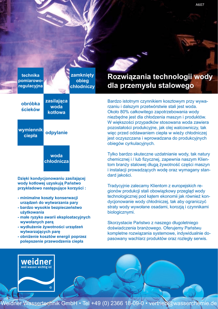 A607 zamknięty obieg chłodniczy technika pomiaroworegulacyjna obróbka ścieków zasilająca woda kotłowa wymiennik odpylanie ciepła woda chłodnicza Dzięki kondycjonowaniu zasilającej wody kotłowej uzyskują Państwo przykładowo następujące korzyści : - minimalne koszty konserwacji urządzeń do wytwarzania pary - bardzo wysokie bezpieczeństwo użytkowania - małe ryzyko awarii eksploatacyjnych wywołanych parą - wydłużenie żywotności urządzeń wytwarzających parę - obniżenie kosztów energii poprzez polepszenie przewodzenia ciepła Rozwiązania technologii wody dla przemysłu stalowego Bardzo istotnym czynnikiem kosztowym przy wywarzaniu i dalszym przetwórstwie stali jest woda. Około 80% całkowitego zapotrzebowania wody niezbędne jest dla chłodzenia maszyn i produktów. W większości przypadków stosowana woda zawiera pozostałości produkcyjne, jak olej walcowniczy, tak więc przed oddawaniem ciepła w wieży chłodniczej jest oczyszczana i wprowadzana do produkcyjnych obiegów cyrkulacyjnych. Tylko bardzo skuteczne uzdatnianie wody, tak natury chemicznej i / lub fizycznej, zapewnia naszym Klientom branży stalowej długą żywotność części maszyn i instalacji prowadzących wodę oraz wymagany standard jakości. Tradycyjnie zalecamy Klientom z europejskich regionów produkcji stali obowiązkowy przegląd wody technologicznej pod kątem ekonomii jak również kondycjonowanie wody chłodniczej, tak aby ograniczyć straty wody wywołane osadami, korozją i czynnikami biologicznymi. Skorzystacie Państwo z naszego długoletniego doświadczenia branżowego. Oferujemy Państwu kompletne rozwiązania systemowe, indywidualnie dopasowany wachlarz produktów oraz rozległy serwis. Weidner Wassertechnik GmbH • Tel +49 (0) 2366 18-09-0 • [email protected]