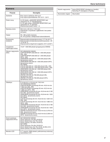 Dane techniczne Kamera Pozycja Szczegóły Zasilanie Przy użyciu zasilacza: DC 5,2 V Przy użyciu akumulatorów: DC 3,5 V - 3,6 V Pobór mocy 2,2 W (kiedy „JASNOŚĆ MONITORA” jest ustawiona na „3” (standardowa)) 2,4 W (gdy opcja „JASNOŚĆ MONITORA” jest ustawiona na „4” (jaśniej)) Znamionowy pobór mocy: 1 A Wymiary (mm) 50,5 mm x 55 mm x 110,5 mm (szerokość x wysokość x głębokość: bez paska uchwytu) Ciężar Ok. 185 g (tylko kamera), ok. 215 g (wraz z dołączonym akumulatorem) Środowisko działania Dopuszczalna temperatura pracy: 0 °C do 40 °C Dopuszczalna temperatura przechowywania: -20 °C do 50 °C Dopuszczalna wilgotność względna: 35 % do 80 % Urządzenie rejestrujące obraz 1/5,8” 1 500 000 pikseli (progresywne CMOS) Obszar nagrywania (film) GZ-HM430/GZ-HM435: (UXP/XP/SP/EP) 630.000 do 1.050.000 pikseli (WŁ. AIS) (UXP/XP/SP/EP) 630.000 do 1.250.000 pikseli (WYŁ. AIS) (SSW/SEW) 340.000 do 1.050.000 pikseli (WŁ. dynamiczny zoom) (SSW/SEW) 630.000 do 1.050.000 pikseli (WYŁ. dynamiczny zoom) GZ-HM30: (LS/LE) 630.000 do 1.050.000 pikseli (WŁ. AIS) (LS/LE) 630.000 do 1.250.000 pikseli (WYŁ. AIS) (SSW/SEW) 340.000 do 1.050.000 pikseli (WŁ. dynamiczny zoom) (SSW/SEW) 630.000 do 1.050.000 pikseli (WYŁ. dynamiczny zoom) (SS/SE) 340.000 do 790.000 pikseli (WŁ. dynamiczny zoom) (SS/SE) 470.000 do 790.000 pikseli (WYŁ. dynamiczny zoom) Obiektyw F1,8 do 6,3, f= 2,9 mm do 116,0 mm GZ-HM430/GZ-HM435: (UXP/XP/SP/EP) konwersja 35 mm: 45,6 mm do 1.824 mm (WŁ. AIS) (UXP/XP/SP/EP) konwersja 35 mm: 42,0 mm do 1.680 mm (WYŁ. AIS) (SSW/SEW) konwersja 35 mm: 45,6 mm do 3.182 mm (WŁ. dynamiczny zoom) (SSW/SEW) konwersja 35 mm: 45,6 mm do 1.824 mm (WYŁ. dynamiczny zoom) GZ-HM30: (LS/LE) konwersja 35 mm: 45,6 mm do 1.824 mm (WŁ. AIS) (LS/LE) konwersja 35 mm: 42,0 mm do 1.680 mm (WYŁ. AIS) (SSW/SEW) konwersja 35 mm: 45,6 mm do 3.182 mm (WŁ. dynamiczny zoom) (SSW/SEW) konwersja 35 mm: 45,6 mm do 1.824 mm (WYŁ. dynamiczny zoom) (SS/SE) konwersja 35 mm: 55,9 mm do 3.376 mm (WŁ. dynamiczny zoom) (SS/SE) konwersja 35 mm: 55,9 mm do 2.236 mm (WYŁ. dynamiczny zoom) Zoom (podczas nagrywania filmu) GZ-HM430/GZ-HM435: Zoom optyczny: Do 40x (16:9/4:3) Zoom dynamiczny: Do 70x (16:9) Zoom cyfrowy: Do 200x (16:9/4:3) GZ-HM30: Zoom optyczny: Do 40x (16:9/4:3) Zoom dynamiczny: Do 70x (16:9), do 60x (4:3) Zoom cyfrowy: Do 200x (16:9/4:3) Monitor LCD 2,7” szeroki, 230K pikseli, polikrzemowy kolorowy wyświetlacz LCD Nośnik nagrywania Karta SDHC/SDXC (dostępna w handlu) Karta Eye-Fi (dostępna w handlu) Akumulator zegara Akumulator 1 Dane techniczne Zasilacz sieciowy (AC-V10E)* Złącza Pozycja Pozycja Szczegóły Szczegóły HDMI Minizłącze HDMI™ Zasilanie AC 110 V do 240 V, 50 Hz/60 Hz Wyjście AV Wyjście wizyjne: 1,0 V (p-p), 75 Ω Wyjście audio: 300 mV (rms), 1 K Ω Wyjście DC 5,2 V, 1 A USB USB mini USB Typu B, zgodne z USB 2.0 Dopuszczalna temperatura pracy 0 °C do 40 °C (10 °C do 35 °C podczas ładowania) Wymiary (mm) 72 mm x 28 mm x 59 mm (szerokość x wysokość x głębokość: bez przewodu i wtyczki na prąd AC) Ciężar Ok. 77 g Film Pozycja Szczegóły Format nagrywania/ odtwarzania AVCHD standardowy Film: AVC/H.264 Dźwięk: Dolby Digital 2ch Rozszerzenie .MTS System sygnału PAL standardowy Jakość obrazu (film) GZ-HM430/GZ-HM435: UXP 1920 x 1080i pikseli Średnio około 24 Mbps XP 1920 x 1080i pikseli Średnio około 17 Mbps SP 1920 x 1080i pikseli Średnio około 12 Mbps EP 1920 x 1080i pikseli Średnio około 4,8 Mbps SSW 720 x 576i pikseli Średnio około 6,2 Mbps SEW 720 x 576i pikseli Średnio około 3 Mbps GZ-HM30: LS 1280 x 720p pikseli Średnio około 11 Mbps LE 1280 x 720p pikseli Średnio około 4,7 Mbps SSW (16:9) 720 x 576i pikseli Średnio około 6,2 Mbps SEW (16:9) 720 x 576i pikseli Średnio około 3 Mbps SS (4:3) 720 x 576i pikseli Średnio około 6,2 Mbps SE (4:3) 720 x 576i pikseli Średnio około 3 Mbps Jakość dźwięku (audio) 2 48 kHz, 256 kbps Akumulator (BN-VG107E) Pozycja Szczegóły Napięcie zasilające 3,5 V - 3,6 V Pojemność 700 mAh Wymiary (mm) 31 mm x 21,5 mm x 43 mm (szerokość x wysokość x głębokość) Ciężar Ok. 26 g UWAGA : 0 W celu udoskonalenia tego produktu jego dane techniczne i wygląd mogą ulec zmianie bez uprzedzenia.