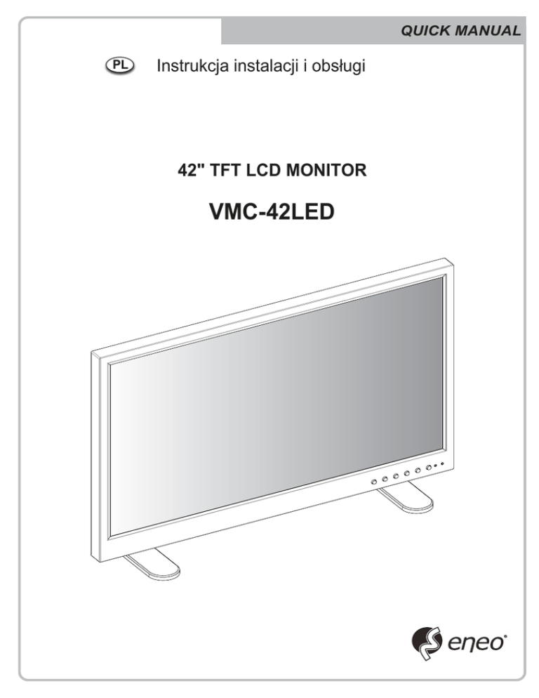 QUICK MANUAL Instrukcja instalacji i obsługi 42" TFT LCD MONITOR VMC-42LED KEY BUTTON Główne przyciski funkcyjne OSD Key Function Włączanie oraz wyłączanie OSD Wybieranie źródła wejścia oraz poruszanie się w menu OSD Automatyczne ustawianie źródła RGB oraz poruszanie się w menu OSD Ustawianie poziomu głośności oraz powrót do poprzedniego menu Zwiększanie poziomu głośności oraz wybór menu OSD Włączanie oraz wyłączanie zasilania. Przed pojawieniem się obrazu może minąć kilka sekund. Dioda LED zasilania (obok przycisku zasilania) świeci się na zielono kiedy monitor jest włączony. Zasilanie można wyłączyć poprzez ponowne naciśnięcie przycisku zasilania. Dioda LED zasilania zapali się wtedy na czerwono. CONNECTION 12 1 2 3 4 5 6 7 8 9 10 11 1 Wejście HDMI1/2 7 Wejście AUDIO(dla VIDEO1/ S-VIDEO) 2 Wejście DVI 8 Wejście /Wyjście S-VIDEO 3 Wejście VGA 9 Wejście /Wyjście VIDEO2 4 Wejście PC AUDIO 10 Wejście /Wyjście VIDEO1 5 Wejście COMPONENT VIDEO/AUDIO 11 Wejście trigger 6 Wejście AUDIO(dla VIDEO2) 12 Wejście AC POWER MODE SETTING INPUT VIDEO1 VIDEO2 S-VIDEO √RGB PC DVI HDMI 1 HDMI 2 COMPONENT ▼/▲:MOVE ▶:ENTER Wejście można wybrać spośród VIDEO1, VIDEO2, S-VIDEO, RGB PC, DVI, HDMI1, HDMI2 oraz COMPONENT PICTURE MENU PICTURE SCREEN SETUP RGB SETUP CYCLE SETUP PICTURE CONTRAST BRIGHTNESS COLOR TINT SHARPNESS PEAKING CONTROL COLOR TEMP RED GREEN BLUE MODE SELECT 60% 50% 50% 50% 50% 50% ◀ MEDIUM ▶ 50% 50% 50% ◀ 1080P ▶ TRIGGER ▼/▲ : MOVE ◀/▶ : ADJUST ▶ : ENTER MENU : EXIT VER : *.* KONTRAST : Regulacja kontrastu monitora JASNOŚĆ : Regulacja jasności kolorów KOLOR : Regulacja wyświetlanych kolorów ekranu ODCIEŃ : Regulacja odcieni kolorów OSTROŚĆ : Regulacja ostrości ekranu TEMPERATURA KOLORÓW : Zmiana temperatury kolorów ekranu WYBÓR TRYBU : Wybór trybu ekranu (tylko tryby DVI i HDMI) SCREEN MENU SCREEN SETUP Tryb skanowania (SCAN MODE) : Wybieranie rozmiaru głównego ekranu PIP : Wybieranie trybu PIP oraz PBP SCREEN PICTURE SCAN MODE PIP PIP INPUT PIP SWAP PIP SIZE PIP R/T ◀ ◀ ◀ ▶ ◀ ◀ FULL OFF VIDEO2 ▶ ▶ ▶ SMALL R/B ▶ ▶ RGB SETUP CYCLE SETUP TRIGGER ▼/▲ : MOVE ◀/▶ : ADJUST ▶ : ENTER MENU : EXIT VER : *.* PIP, PBP – POŁĄCZENIE WEJŚĆ SYGNAŁÓW SUB VIDEO-1 VIDEO-2 VIDEO-1 X O O X X X X VIDEO-2 O X O X X X X S-VIDEO O O X X X X X COMPONENT O O O X X X X VGA O O O X X X X DVI O O O X X X X HDMI O O O X X X X MAIN S-VIDEO COMPONENT VGA DVI HDMI SETUP MENU PICTURE SCREEN SETUP RGB SETUP SETUP INPUT LANGUAGE SOUND MUTE BUTTON LOCK NOISE REDUCTION OSD TIME DEFAULT LINE SHIFT NO OPERATION ◀ ◀ ◀ ◀ ◀ VIDEO1 ENGLISH OFF OFF ON ▶ ▶ ▶ ▶ ▶ ▶ ◀ ◀ ON OFF ▶ ▶ 15s CYCLE SETUP TRIGGER ▼/▲ : MOVE ◀/▶ : ADJUST ▶ : ENTER MENU : EXIT VER : *.* Wejście : Wybierz źródła wejścia Język : Wybierz język OSD spośród następujących Wyciszenie głosu : Wybierz OFF lub ON Blokada klawiszy : Wybierz ‘On’ aby zablokować klawisze Redukcja hałasów : Redukcja hałasów analogowych sygnału video Czas OSD : Wybierz czas wyświetlania OSD Domyślne : Przywrócenie ustawień domyślnych LINE SHIFT : Minimalne przesunięcie chroniące ekran BRAK OPERACJI : Ustawienie trybu braku operacji RGB SETUP MENU PICTURE SCREEN SETUP RGB SETUP RGB SETUP H-POSITION V-POSITION CLOCK PHASE AUTO ADJUST POWER SAVING AUTO REPEAT 100% 0% 0% 0% ▶ ◀ ◀ OFF OFF ▶ ▶ CYCLE SETUP TRIGGER ▼/▲ : MOVE ◀/▶ : ADJUST ▶ : ENTER MENU : EXIT VER : *.* H-POSITION : Regulacja pozycji poziomej ekranu V-POSITION: Regulacja pozycji pionowej ekranu CLOCK : Regulacja zegara monitora PHASE : Regulacja fazy monitora AUTO ADJUST : Autoregulacja pozycji ekranu POWER SAVING : Tryb oszczędzania energii AUTO REPEAT : Ustawienie autopowtarzania monitora CYCLE SETUP MENU PICTURE SCREEN SETUP RGB SETUP CYCLE SETUP CYCLE TIME CYCLE VIDEO1 VIDEO2 S-VIDEO RGB PC DVI HDMI 1 HDMI 2 COMPONENT 10s ◀ ◀ ◀ ◀ ◀ ◀ ◀ ◀ ◀ OFF OFF OFF OFF OFF OFF OFF OFF OFF ▶ ▶ ▶ ▶ ▶ ▶ ▶ ▶ ▶ Czas cyklu : Ustawienie długości wyświetlania na ekranie cyklu Cykl : Jeśli funkcja cyklu jest włączona, wybrane źródło będzie nieustannie zmieniać się po okresie cyklu do czasu, aż funkcja cyklu zostanie wyłączona CYCLE SETUP TRIGGER ▼/▲ : MOVE ◀/▶ : ADJUST ▶ : ENTER MENU : EXIT VER : *.* TRIGGER MENU PICTURE SCREEN TRIGGER MODE : Ustawienie trybu trigger TRIGGER INPUT : Ustawienie źródła wejścia trybu trigger TRIGGER TRIGGER MODE TRIGGER INPUT TRIGGER DWELL ◀ ◀ OFF VIDEO1 ▶ ▶ 10s SETUP RGB SETUP CYCLE SETUP TRIGGER ▼/▲ : MOVE ◀/▶ : ADJUST ▶ : ENTER MENU : EXIT VER : *.* TRIGGER DWELL : Ustawienie czasu wyświetlania trybu trigger eneo® jest zastrzeżonym znakiem handlowym Videor E. Hartig GmbH. Do wyłącznej sprzedaży przez wyspecjalizowane kanały dystrybucji. Videor E. Hartig GmbH Carl-Zeiss-Straße 8 · 63322 Rödermark, Niemcy Tel. +49 (0) 6074 / 888-0 • Fax +49 (0) 6074 / 888-100 www.videor.com www.eneo-security.com Modyfikacje techniczne zastrzeżone. © Copyright by Videor E. Hartig GmbH 03/2013