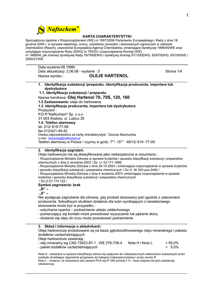 1 KARTA CHARAKTERYSTYKI Sporządzona zgodnie z Rozporządzeniem (WE) nr 1907/2006 Parlamentu Europejskiego i Rady z dnia 18 grudnia 2006 r. w sprawie rejestracji, oceny, udzielania zezwoleń i stosowanych ograniczeń w zakresie chemikaliów (Reach), utworzenia Europejskiej Agencji Chemikaliów, zmieniające dyrektywę 1999/45/WE oraz uchylające rozporządzenie Rady (EWG) nr 793/03 i rozporządzenie Komisji (WE) nr 1488/94, jak również dyrektywę Rady 76/769/EWG i dyrektywy Komisji 91/155/EWG, 93/67/EWG, 93/105/WE i 2000/21/WE _________________________________________________________________________________ Data wydania:08.1999r Data aktualizacji: 2.06.08 - wydanie : 5 Strona 1/4 Nazwa wyrobu : OLEJE HARTENOL _________________________________________________________________________________ 1. Identyfikacja substancji /preparatu. Identyfikacja producenta, importera lub dystrybutora 1.1. Identyfikacja substancji / preparatu Nazwa handlowa: Olej Hartenol 70, 70S, 120, 160 1.2 Zastosowanie: oleje do hartowania 1.3. Identyfikacja producenta, importera lub dystrybutora Producent : P.D-P."Naftochem" Sp. z o.o. 31-503 Kraków, ul. Lubicz 25 1.4. Telefon alarmowy: tel. 012/ 619-77-08 fax 012/421-49-42 Osoba odpowiedzialna za kartę charakterystyki : Danuta Stachurska e-mail : [email protected] Telefon alarmowy w Polsce / czynny w godz. 730- 1530 / : 48/12/ 619 -77-09 _________________________________________________________________________________ 2. Identyfikacja zagrożeń. Oleje hartownicze nie są sklasyfikowane jako niebezpieczne w rozumieniu : - Rozporządzenie Ministra Zdrowia w sprawie kryteriów i sposobu klasyfikacji substancji i preparatów chemicznych z dnia 2 września 2003 / Dz. U. 03.171.1666 - Rozporządzenie Ministra Zdrowia z dnia 29.10.2004 r zmieniające rozporządzenie w sprawie kryteriów i sposobu klasyfikacji substancji i preparatów chemicznych / Dz.U. Nr 243 poz.2440 / - Rozporządzenia Ministra Zdrowia z dnia 4 września 2007r zmieniające rozporządzenie w sprawie kryteriów i sposobu klasyfikacji substancji i preparatów chemicznych / Dz.U.07.174.122 / Symbol zagrożenia: brak „R” – „S” – Nie występuje zagrożenie dla zdrowia, gdy produkt stosowany jest zgodnie z zaleceniami producenta. Szkodliwym skutkiem działania dla ludzi wynikającym z niewłaściwego stosowania może być w przypadku : - wdychania oparów – podrażnienie układu oddechowego - powtarzający się kontakt może powodować wysuszanie lub pękanie skóry - dostanie się oleju do oczu może powodować podrażnienie _________________________________________________________________________________ 3. Skład i informacje o składnikach: Oleje hartownicze produkowane są na bazie gębokorafinowanego oleju mineralnego i pakietu dodatków uszlachetniających Oleje hartownicze zawierają : - olej mineralny wg CAS 72623-87-1 , WE 276-738-4 Nota H i Nota L > 95,0% - pakiet dodatków uszlachetniających < 5,0% Nota H : wskazana w wykazie klasyfikacja odnosi się wyłącznie do niebezpiecznych właściwości wskazanych przez symbole określające zagrożenie przypisane do kategorii niebezpieczeństwa i przez zwroty R Nota L: oznacza, że stosowany olej zawiera PCA wg IP 346 poniżej 3 % - baza olejowa nie jest substancją rakotwórczą. _________________________________________________________________________________ 2 _________________________________________________________________________________ 4. Pierwsza pomoc. Informacje ogólne: zdjąć zanieczyszczoną odzież Inhalacja: wynieść poszkodowanego z obszaru oparów i skonsultować się z lekarzem. Kontakt ze skórą: zmyć skórę wodą z mydłem, a w przypadku podrażnienia skontaktować się z lekarzem. Kontakt z oczami: przemyć oczy bieżącą wodą przez 15 minut, skonsultować się z lekarzem. Spożycie: przepłukać usta wodą, i zapewnić pomoc medyczną, nie wywoływać wymiotów. ________________________________________________________________________________ 5. Postępowanie w przypadku pożaru. Temperatura zapłonu produktu - powyżej 200o C Zalecenia ogólne: zawiadomić otoczenie o pożarze. Usunąć z obszaru zagrożenia osoby nie biorące udziału w likwidowaniu awarii. Wezwać ekipy ratownicze. Zalecane środki gaśnicze: gaśnice pianowe, proszkowe, piasek gaśniczy. Nieodpowiednie środki gaśnicze: woda Zagrożenia związane z uwalnianiem substancji szkodliwych podczas spalania i rozkładu termicznego: tlenki węgla, tlenki siarki oraz inne niezidentyfikowane związki organiczne. _________________________________________________________________________________ 6. Postępowanie w przypadku niezamierzonego uwolnienia do środowiska. Osobiste środki ostrożności: unikać kontaktu ze skórą i oczami i wdychania oparów. Ochrona osobista: okulary, rękawice i odzież ochronną, półmaska z filtrem. Ochrona środowiska: nie dopuścić, aby ciecz przedostała się do kanalizacji, cieków wodnych, rowów odwadniających, wód powierzchniowych, gruntowych i gleby. W przypadku awaryjnego wycieku zebrać mechanicznie rozlaną ciecz. Do wiązania resztek cieczy stosować piasek, ziemię lub trociny. Przenieść do pojemnika, w którym zostanie usunięta zgodnie z obowiązującymi przepisami. Zmyć miejsce wycieku wodą. O większych rozlewach powiadomić odpowiednie służby. Metody oczyszczania: w przypadku uwolnienia niewielkiej ilości cieczy należy zebrać ją mechaniczne. Do wiązania resztek cieczy należy stosować piasek, trociny, które należy zebrać łopatką i umieścić w oznakowanym pojemniku, a następnie poddać utylizacji zgodnie z obowiązującymi przepisami patrz pkt.13. _________________________________________________________________________________ 7. Postępowanie z substancją / preparatem i jej / jego magazynowanie Obsługa: unikać kontaktu oleju ze skórą i oczami. Stosować jedynie zgodnie z zaleceniami producenta. Nie wolno zbiorników lub opakowań metalowych z olejem lub po oleju, spawać, z