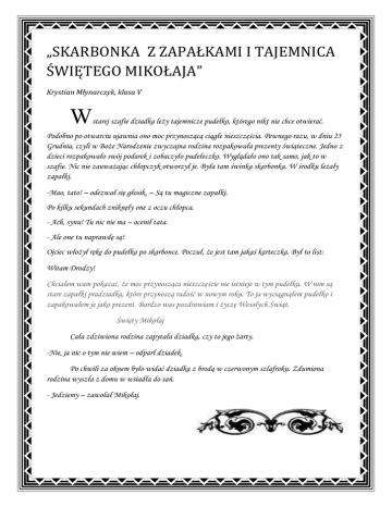 „SKARBONKA Z ZAPAŁKAMI I TAJEMNICA ŚWIĘTEGO MIKOŁAJA” Krystian Młynarczyk, klasa V W starej szafie dziadka leży tajemnicze pudełko, którego nikt nie chce otwierać. Podobno po otwarciu ujawnia ono moc przynoszącą ciągłe nieszczęścia. Pewnego razu, w dniu 25 Grudnia, czyli w Boże Narodzenie zwyczajna rodzina rozpakowała prezenty świąteczne. Jedno z dzieci rozpakowało swój podarek i zobaczyło pudełeczko. Wyglądało ono tak samo, jak to w szafie. Nic nie zauważając chłopczyk otworzył je. Była tam świnka skarbonka. W środku leżały zapałki. -Mao, tato! – odezwał się głosik. – Są tu magiczne zapałki. Po kilku sekundach zniknęły one z oczu chłopca. - Ach, synu! Tu nic nie ma – ocenił tata. - Ale one tu naprawdę są! Ojciec włożył rękę do pudełka po skarbonce. Poczuł, że jest tam jakaś karteczka. Był to list: Witam Drodzy! Chciałem wam pokazać, że moc przynosząca nieszczęście nie istnieje w tym pudełku. W nim są stare zapałki pradziadka, które przynoszą radość w nowym roku. To ja wyciągnąłem pudełko i zapakowałem je jako prezent. Bardzo was pozdrawiam i życzę Wesołych Świąt. Święty Mikołaj Cała zdziwiona rodzina zapytała dziadka, czy to jego żarty. -Nie, ja nic o tym nie wiem – odparł dziadek. Po chwili za oknem było widać dziadka z brodą w czerwonym szlafroku. Zdumiona rodzina wyszła z domu w wsiadła do sań. - Jedziemy – zawołał Mikołaj.