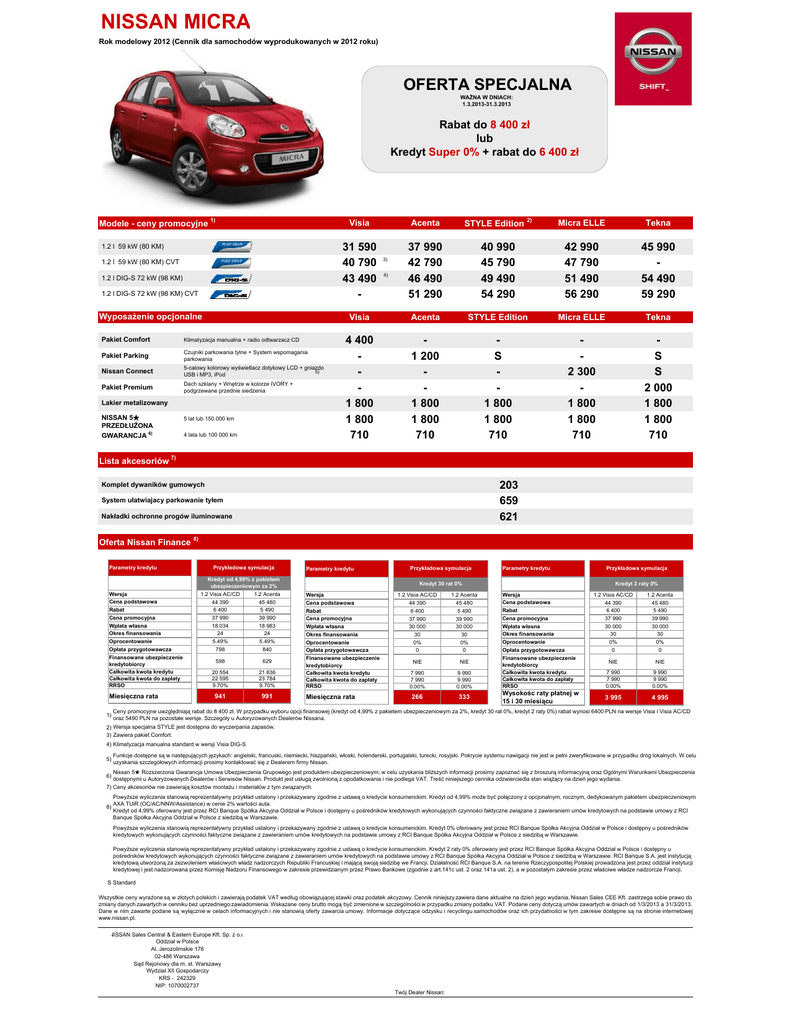 NISSAN MICRA Rok modelowy 2012 (Cennik dla samochodów wyprodukowanych w 2012 roku) OFERTA SPECJALNA WAŻNA W DNIACH: 1.3.2013-31.3.2013 Rabat do 8 400 zł lub Kredyt Super 0% + rabat do 6 400 zł Modele - ceny promocyjne 1) Visia Acenta STYLE Edition 2) Micra ELLE Tekna 1.2 l DIG-S 72 kW (98 KM) CVT 31 590 40 790 43 490 - Wyposażenie opcjonalne Visia Acenta STYLE Edition Micra ELLE Tekna 4 400 1 800 1 800 710 1 200 1 800 1 800 710 S 1 800 1 800 710 2 300 1 800 1 800 710 S S 2 000 1 800 1 800 710 1.2 l 59 kW (80 KM) 1.2 l 59 kW (80 KM) CVT 1.2 l DIG-S 72 kW (98 KM) Pakiet Comfort Klimatyzacja manualna + radio odtwarzacz CD Pakiet Parking Czujniki parkowania tylne + System wspomagania parkowania Nissan Connect 5-calowy kolorowy wyświetlacz dotykowy LCD + gniazdo 5) USB i MP3, iPod Pakiet Premium Dach szklany + Wnętrze w kolorze IVORY + podgrzewane przednie siedzenia Lakier metalizowany NISSAN 5★ PRZEDŁUŻONA 6) GWARANCJA 5 lat lub 150 000 km 4 lata lub 100 000 km 3) 4) 37 990 42 790 46 490 51 290 40 990 45 790 49 490 54 290 42 990 47 790 51 490 56 290 45 990 54 490 59 290 Lista akcesoriów 7) 203 659 621 Komplet dywaników gumowych System ułatwiajacy parkowanie tyłem Nakładki ochronne progów iluminowane Oferta Nissan Finance 8) Parametry kredytu Wersja Cena podstawowa Rabat Cena promocyjna Wpłata własna Okres finansowania Oprocentowanie Opłata przygotowawcza Finansowane ubezpieczenie kredytobiorcy Całkowita kwota kredytu Całkowita kwota do zapłaty RRSO Miesięczna rata 1) Przykładowa symulacja Kredyt od 4,99% z pakietem ubezpieczeniowym za 2% 1.2 Visia AC/CD 1.2 Acenta 44 390 45 480 6 400 5 490 37 990 39 990 18 034 18 983 24 24 5.49% 5.49% 798 840 598 629 20 554 22 595 9.70% 21 636 23 784 9.70% 941 991 Parametry kredytu Przykładowa symulacja Parametry kredytu Wersja Cena podstawowa Rabat Cena promocyjna Wpłata własna Okres finansowania Oprocentowanie Opłata przygotowawcza Finansowane ubezpieczenie kredytobiorcy Całkowita kwota kredytu Całkowita kwota do zapłaty RRSO Miesięczna rata 1.2 Visia AC/CD 44 390 6 400 37 990 30 000 30 0% 0 1.2 Acenta 45 480 5 490 39 990 30 000 30 0% 0 NIE NIE 7 990 7 990 0.00% 9 990 9 990 0.00% 266 333 Przykładowa symulacja Kredyt 2 raty 0% Kredyt 30 rat 0% Wersja Cena podstawowa Rabat Cena promocyjna Wpłata własna Okres finansowania Oprocentowanie Opłata przygotowawcza Finansowane ubezpieczenie kredytobiorcy Całkowita kwota kredytu Całkowita kwota do zapłaty RRSO Wysokośc raty płatnej w 15 i 30 miesiącu 1.2 Visia AC/CD 44 390 6 400 37 990 30 000 30 0% 0 1.2 Acenta 45 480 5 490 39 990 30 000 30 0% 0 NIE NIE 7 990 7 990 0.00% 9 990 9 990 0.00% 3 995 4 995 Ceny promocyjne uwzględniają rabat do 8 400 zł. W przypadku wyboru opcji finansowej (kredyt od 4,99% z pakietem ubezpieczeniowym za 2%, kredyt 30 rat 0%, kredyt 2 raty 0%) rabat wynosi 6400 PLN na wersje Visia i Visia AC/CD oraz 5490 PLN na pozostałe wersje. Szczegóły u Autoryzowanych Dealerów Nissana. 2) Wersja specjalna STYLE jest dostępna do wyczerpania zapasów. 3) Zawiera pakiet Comfort. 4) Klimatyzacja manualna standard w wersji Visia DIG-S 5) Funkcje dostępne są w następujących językach: angielski, francuski, niemiecki, hiszpański, włoski, holenderski, portugalski, turecki, rosyjski. Pokrycie systemu nawigacji nie jest w pełni zweryfikowane w przypadku dróg lokalnych. W celu uzyskania szczegółowych informacji prosimy kontaktować się z Dealerem firmy Nissan. Nissan 5★ Rozszerzona Gwarancja Umowa Ubezpieczenia Grupowego jest produktem ubezpieczeniowym; w celu uzyskania bliższych informacji prosimy zapoznać się z broszurą informacyjną oraz Ogólnymi Warunkami Ubezpieczenia dostępnymi u Autoryzowanych Dealerów i Serwisów Nissan. Produkt jest usługą zwolnioną z opodatkowania i nie podlega VAT. Treść niniejszego cennika odzwierciedla stan wiążący na dzień jego wydania. 7) Ceny akcesoriów nie zawierają kosztów montażu i materiałów z tym związanych. 6) 8) Powyższe wyliczenia stanowią reprezentatywny przykład ustalony i przekazywany zgodnie z ustawą o kredycie konsumenckim. Kredyt od 4,99% może być połączony z opcjonalnym, rocznym, dedykowanym pakietem ubezpieczeniowym AXA TUiR (OC/AC/NNW/Assistance) w cenie 2% wartości auta. Kredyt od 4,99% oferowany jest przez RCI Banque Spółka Akcyjna Oddział w Polsce i dostępny u pośredników kredytowych wykonujących czynności faktyczne związane z zawieraniem umów kredytowych na podstawie umowy z RCI Banque Spółka Akcyjna Oddział w Polsce z siedzibą w Warszawie. Powyższe wyliczenia stanowią reprezentatywny przykład ustalony i przekazywany zgodnie z ustawą o kredycie konsumenckim. Kredyt 0% oferowany jest przez RCI Banque Spółka Akcyjna Oddział w Polsce i dostępny u pośredników kredytowych wykonujących czynności faktyczne związane z zawieraniem umów kredytowych na podstawie umowy z RCI Banque Spółka Akcyjna Oddział w Polsce z siedzibą w Warszawie. Powyższe wyliczenia stanowią reprezentatywny przykład ustalony i przekazywany zgodnie z ustawą o kredycie konsumenckim. Kredyt 2 raty 0% oferowany jest przez RCI Banque Spółka Akcyjna Oddział w Polsce i dostępny u pośredników kredytowych wykonujących czynności faktyczne związane z zawieraniem umów kredytowych na podstawie umowy z RCI Banque Spółka Akcyjna Oddział w Polsce z siedzibą w Warszawie. RCI Banque S.A. jest instytucją kredytową utworzoną za zezwoleniem właściwych władz nadzorczych Republiki Francuskiej i mającą swoją siedzibę we Francji. Działalność RCI Banque S.A. na terenie Rzeczypospolitej Polskiej prowadzona jest przez oddział instytucji kredytowej i jest nadzorowana przez Komisję Nadzoru Finansowego w zakresie przewidzianym przez Prawo Bankowe (zgodnie z art.141c ust. 2 oraz 141a ust. 2), a w pozostałym zakresie przez właściwe władze nadzorcze Francji. S Standard Wszystkie ceny wyrażone są w złotych polskich i zawierają podatek VAT według obowiązującej stawki