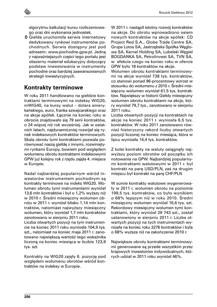 Rocznik Giełdowy 2012 algorytmu kalkulacji kursu rozliczeniowego oraz dni wykonania jednostek. G iełda uruchomiła serwis internetowy dedykowany rynkowi instrumentów pochodnych. Serwis dostępny jest pod adresem: www.pochodne.gpw.pl. Jedną z najważniejszych części tego portalu jest obszerny materiał edukacyjny dotyczący podstaw inwestowania w instrumenty pochodne oraz bardziej zaawansowanych strategii inwestycyjnych. Kontrakty terminowe W roku 2011 handlowano na giełdzie kontraktami terminowymi na indeksy WIG20, mWIG40, na kursy walut – dolara amerykańskiego, euro, franka szwajcarskiego oraz na akcje spółek. Łącznie na koniec roku w obrocie znajdowało się 79 serii kontraktów, o 24 więcej niż rok wcześniej. Jak w ostatnich latach, najdynamiczniej rozwijał się rynek indeksowych kontraktów terminowych. Skala obrotu tymi kontraktami pozwala porównywać naszą giełdę z innymi, rozwiniętymi rynkami Europy, bowiem pod względem wolumenu obrotu kontraktami indeksowymi GPW już kolejny rok z rzędu zajęła 4. miejsce w Europie. Nadal najbardziej popularnym wśród inwestorów instrumentem pochodnym są kontrakty terminowe na indeks WIG20. Wolumen obrotu tymi instrumentami wyniósł 13,6 mln kontraktów i był o 1,2% wyższy niż w 2010 r. Średni miesięczny wolumen obrotu w 2011 r. wyniósł blisko 1,14 mln kontraktów, natomiast najwyższy miesięczny wolumen, który wyniósł 1,7 mln kontraktów zanotowano w sierpniu 2011 roku. Liczba otwartych pozycji na tym instrumencie na koniec 2011 roku wyniosła 104,9 tys. szt., natomiast na koniec maja 2011 r. zanotowano największą wartość tego wskaźnika liczoną na koniec miesiąca w liczbie 123,9 tys. szt. Kontrakty na WIG20 zajęły 6. pozycję pod względem wolumenu obrotów wśród kontraktów na indeksy w Europie. 206 W 2011 r. nastąpił istotny rozwój kontraktów na akcje. Do obrotu wprowadzono osiem nowych kontraktów na akcje spółek: CD Project Red S.A., Globe Trade Centre SA, Grupa Lotos SA, Jastrzębska Spółka Węglowa SA, Kernel Holding SA, Lubelski Węgiel BOGDANKA SA, Petrolinvest SA, TVN SA, w efekcie czego na koniec roku w ofercie GPW było 18 kontraktów na akcje. Wolumen obrotu kontraktami terminowymi na akcje wyniósł 738 tys. kontraktów, co stanowi ponad 96-procentowy wzrost w stosunku do wolumenu z 2010 r. Średni miesięczny wolumen wyniósł 61,5 tys. kontraktów. Największy w historii Giełdy miesięczny wolumen obrotu kontraktami na akcje, który wyniósł 79,7 tys., zanotowano w sierpniu 2011 roku. Liczba otwartych pozycji na kontraktach na akcje na koniec 2011 r. wyniosła 6,5 tys. kontraktów. W roku 2011 zanotowano również historyczny rekord liczby otwartych pozycji liczonej na koniec miesiąca, która w lipcu wyniosła 14,4 tys. kontraktów. Z kolei kontrakty na waluty osiągnęły najwyższy poziom obrotów od początku ich notowania na GPW. Najbardziej popularnymi kontraktami walutowymi w 2011 r. był kontrakt na parę USD/PLN, zaś na drugim miejscu był kontrakt na parę CHF/PLN W sumie kontrakty walutowe wygenerowały w 2011 r. wolumen obrotu na poziomie 199,5 tys. kontraktów, co było wynikiem o 68% lepszym niż w roku 2010. Średni miesięczny wolumen wyniósł 16,6 tys. szt. Rekordowy miesięczny wolumen tymi kontraktami, który wyniósł 29 743 szt., został ustanowiony w sierpniu 2011 r. Liczba otwartych pozycji na tych instrumentach wyniosła na koniec roku 3276 kontraktów i była o 68% wyższa niż na zakończenie 2010 r. Największe obroty kontraktami terminowymi generowane są przede wszystkim przez krajowych inwestorów indywidualnych, których udział w 2011 roku wyniósł 46%. Główny Rynek GPW Wybrane elementy standardu kontraktów terminowych na indeksy Nazwa skrócona kontraktu FXYZkrr, gdzie: F – rodzaj instrumentu XYZ – skrót nazwy instrumentu bazowego (W20, W40) k – kod określający miesiąc wykonania kontraktu (określany przez Giełdę) rr – dwie ostatnie cyfry roku wykonania Mnożnik 10 zł Wartość kontraktu Mnożnik * kurs kontraktu Jednostka notowania Punkty indeksowe Miesiące wykonania kontraktów Dla kontraktów na WIG20 cztery najbliższe miesiące z cyklu marzec, czerwiec, wrzesień, grudzień. Dla kontraktów na mWIG40 trzy najbliższe miesiące z cyklu marzec, czerwiec, wrzesień, grudzień. Ostatni dzień obrotu Dzień sesyjny przypadający w trzeci piątek miesiąca wykonania. Jeżeli w tym dniu nie odbywa się sesja, to wówczas jest to ostatni dzień sesyjny przypadający przed trzecim piątkiem miesiąca wykonania Dzień wygaśnięcia Ten sam dzień co ostatni dzień obrotu Pierwszy dzień obrotu nowej serii Pierwszy dzień sesyjny po dniu wygaśnięcia poprzedniej serii kontraktów Ostateczny kurs rozliczeniowy Ostateczny kurs rozliczeniowy jest określony w dniu wygaśnięcia kontraktu jako średnia arytmetyczna ze wszystkich wartości indeksu (WIG20, mWIG40) w czasie ostatniej godziny notowań ciągłych oraz wartości tego indeksu ustalonej na zamknięcie sesji giełdowej, po odrzuceniu 5 najwyższych i 5 najniższych z tych wartości Dzień rozliczenia Następny dzień roboczy po dniu wygaśnięcia kontraktu (po ostatnim dniu obrotu) Sposób rozliczenia Pieniężne w złotych polskich 207 Rocznik Giełdowy 2012 Wybrane elementy standardu kontraktów terminowych na kursy walut Nazwa skrócona kontraktu FXYZkrr, gdzie: F – rodzaj instrumentu XYZ – oznaczenie waluty, której kurs jest instrumentem bazowym (EUR, USD, CHF) k – kod określający miesiąc wykonania kontraktu (określany przez Giełdę) rr – dwie ostatnie cyfry roku wykonania Jednostka transakcyjna (wielkość kontraktu) 10.000 EUR, 10.000 USD lub 10.000 CHF Miesiące wykonania kontraktów 3 najbliższe miesiące kalendarzowe + 3 kolejne miesiące z marcowego cyklu kwartalnego Ostatni dzień obrotu Dzień sesyjny przypadający w trzeci piątek miesiąca wykonania. Jeżeli w tym dniu nie odbywa się sesja wówczas jest to ostatni dzień sesyjnyprzypadaj