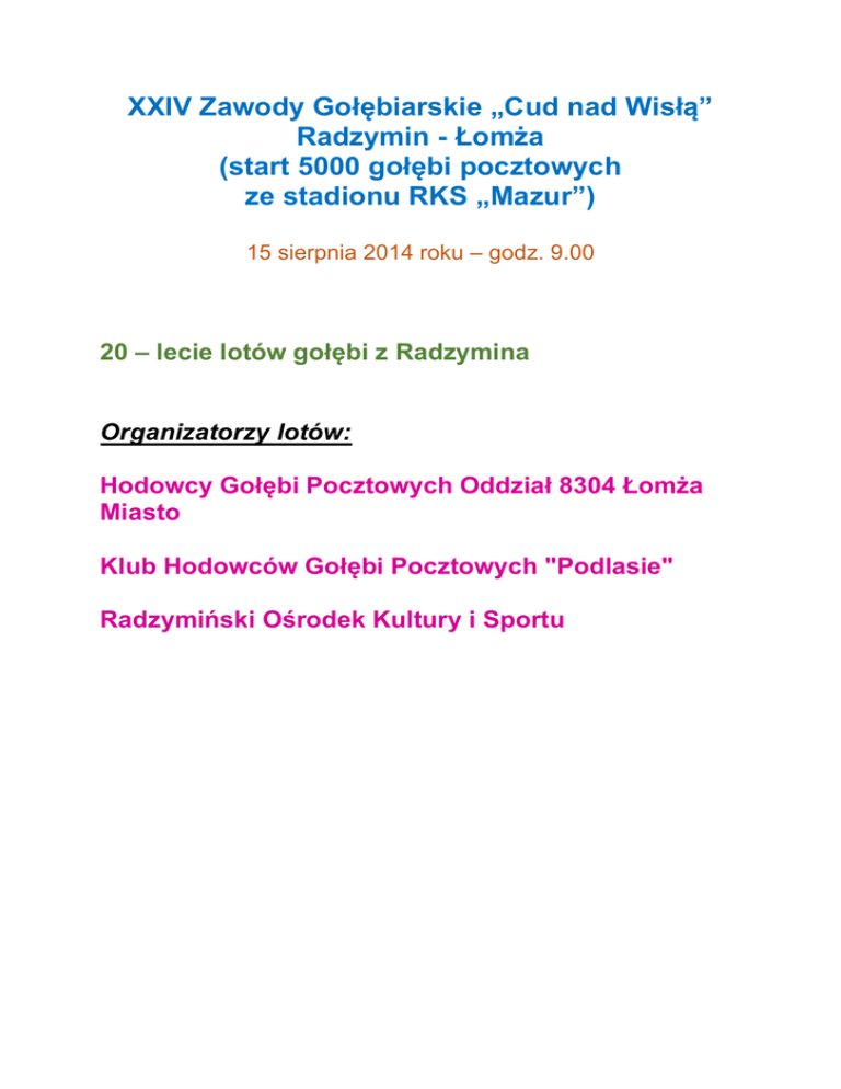 XXIV Zawody Gołębiarskie „Cud nad Wisłą” Radzymin - Łomża (start 5000 gołębi pocztowych ze stadionu RKS „Mazur”) 15 sierpnia 2014 roku – godz. 9.00 20 – lecie lotów gołębi z Radzymina Organizatorzy lotów: Hodowcy Gołębi Pocztowych Oddział 8304 Łomża Miasto Klub Hodowców Gołębi Pocztowych "Podlasie" Radzymiński Ośrodek Kultury i Sportu