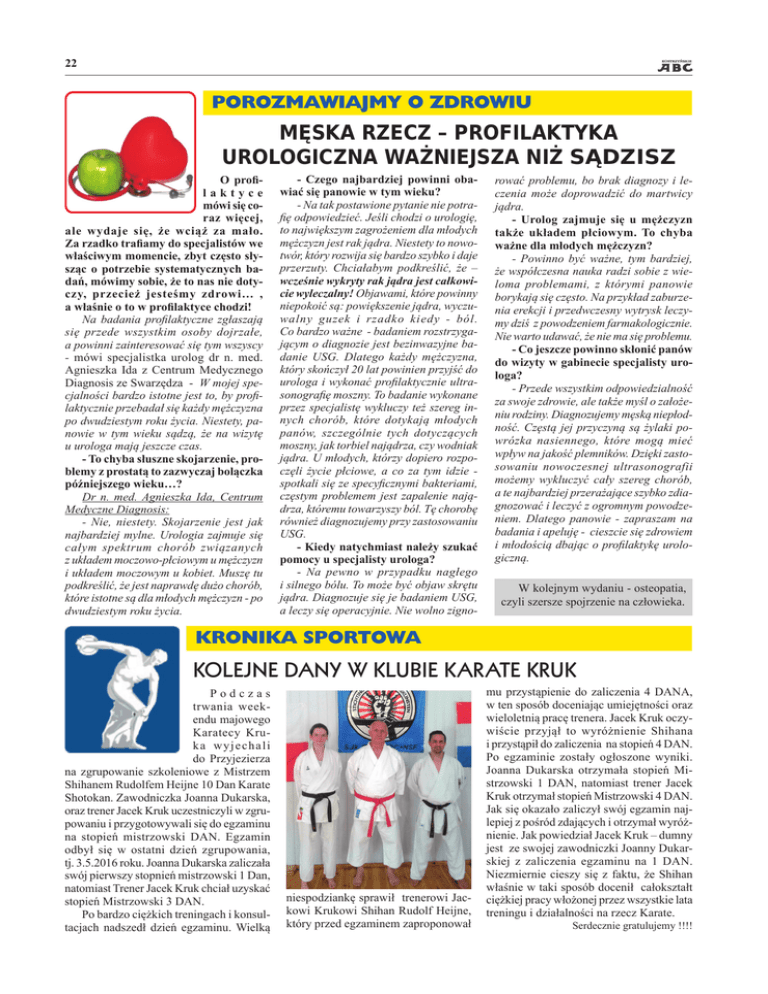 22 POROZMAWIAJMY O ZDROWIU MĘSKA RZECZ – PROFILAKTYKA UROLOGICZNA WAŻNIEJSZA NIŻ SĄDZISZ O profilaktyce mówi się coraz więcej, ale wydaje się, że wciąż za mało. Za rzadko trafiamy do specjalistów we właściwym momencie, zbyt często słysząc o potrzebie systematycznych badań, mówimy sobie, że to nas nie dotyczy, przecież jesteśmy zdrowi… , a właśnie o to w profilaktyce chodzi! Na badania profilaktyczne zgłaszają się przede wszystkim osoby dojrzałe, a powinni zainteresować się tym wszyscy - mówi specjalistka urolog dr n. med. Agnieszka Ida z Centrum Medycznego Diagnosis ze Swarzędza - W mojej specjalności bardzo istotne jest to, by profilaktycznie przebadał się każdy mężczyzna po dwudziestym roku życia. Niestety, panowie w tym wieku sądzą, że na wizytę u urologa mają jeszcze czas. - To chyba słuszne skojarzenie, problemy z prostatą to zazwyczaj bolączka późniejszego wieku…? Dr n. med. Agnieszka Ida, Centrum Medyczne Diagnosis: - Nie, niestety. Skojarzenie jest jak najbardziej mylne. Urologia zajmuje się całym spektrum chorób związanych z układem moczowo-płciowym u mężczyzn i układem moczowym u kobiet. Muszę tu podkreślić, że jest naprawdę dużo chorób, które istotne są dla młodych mężczyzn - po dwudziestym roku życia. - Czego najbardziej powinni obawiać się panowie w tym wieku? - Na tak postawione pytanie nie potrafię odpowiedzieć. Jeśli chodzi o urologię, to największym zagrożeniem dla młodych mężczyzn jest rak jądra. Niestety to nowotwór, który rozwija się bardzo szybko i daje przerzuty. Chciałabym podkreślić, że – wcześnie wykryty rak jądra jest całkowicie wyleczalny! Objawami, które powinny niepokoić są: powiększenie jądra, wyczuwalny guzek i rzadko kiedy - ból. Co bardzo ważne - badaniem rozstrzygającym o diagnozie jest bezinwazyjne badanie USG. Dlatego każdy mężczyzna, który skończył 20 lat powinien przyjść do urologa i wykonać profilaktycznie ultrasonografię moszny. To badanie wykonane przez specjalistę wykluczy też szereg innych chorób, które dotykają młodych panów, szczególnie tych dotyczących moszny, jak torbiel najądrza, czy wodniak jądra. U młodych, którzy dopiero rozpoczęli życie płciowe, a co za tym idzie spotkali się ze specyficznymi bakteriami, częstym problemem jest zapalenie najądrza, któremu towarzyszy ból. Tę chorobę również diagnozujemy przy zastosowaniu USG. - Kiedy natychmiast należy szukać pomocy u specjalisty urologa? - Na pewno w przypadku nagłego i silnego bólu. To może być objaw skrętu jądra. Diagnozuje się je badaniem USG, a leczy się operacyjnie. Nie wolno zigno- rować problemu, bo brak diagnozy i leczenia może doprowadzić do martwicy jądra. - Urolog zajmuje się u mężczyzn także układem płciowym. To chyba ważne dla młodych mężczyzn? - Powinno być ważne, tym bardziej, że współczesna nauka radzi sobie z wieloma problemami, z którymi panowie borykają się często. Na przykład zaburzenia erekcji i przedwczesny wytrysk leczymy dziś z powodzeniem farmakologicznie. Nie warto udawać, że nie ma się problemu. - Co jeszcze powinno skłonić panów do wizyty w gabinecie specjalisty urologa? - Przede wszystkim odpowiedzialność za swoje zdrowie, ale także myśl o założeniu rodziny. Diagnozujemy męską niepłodność. Częstą jej przyczyną są żylaki powrózka nasiennego, które mogą mieć wpływ na jakość plemników. Dzięki zastosowaniu nowoczesnej ultrasonografii możemy wykluczyć cały szereg chorób, a te najbardziej przerażające szybko zdiagnozować i leczyć z ogromnym powodzeniem. Dlatego panowie - zapraszam na badania i apeluję - cieszcie się zdrowiem i młodością dbając o profilaktykę urologiczną. W kolejnym wydaniu - osteopatia, czyli szersze spojrzenie na człowieka. KRONIKA SPORTOWA KOLEJNE DANY W KLUBIE KARATE KRUK Podczas trwania weekendu majowego Karatecy Kruka wyjechali do Przyjezierza na zgrupowanie szkoleniowe z Mistrzem Shihanem Rudolfem Heijne 10 Dan Karate Shotokan. Zawodniczka Joanna Dukarska, oraz trener Jacek Kruk uczestniczyli w zgrupowaniu i przygotowywali się do egzaminu na stopień mistrzowski DAN. Egzamin odbył się w ostatni dzień zgrupowania, tj. 3.5.2016 roku. Joanna Dukarska zaliczała swój pierwszy stopnień mistrzowski 1 Dan, natomiast Trener Jacek Kruk chciał uzyskać stopień Mistrzowski 3 DAN. Po bardzo ciężkich treningach i konsultacjach nadszedł dzień egzaminu. Wielką niespodziankę sprawił trenerowi Jackowi Krukowi Shihan Rudolf Heijne, który przed egzaminem zaproponował mu przystąpienie do zaliczenia 4 DANA, w ten sposób doceniając umiejętności oraz wieloletnią pracę trenera. Jacek Kruk oczywiście przyjął to wyróżnienie Shihana i przystąpił do zaliczenia na stopień 4 DAN. Po egzaminie zostały ogłoszone wyniki. Joanna Dukarska otrzymała stopień Mistrzowski 1 DAN, natomiast trener Jacek Kruk otrzymał stopień Mistrzowski 4 DAN. Jak się okazało zaliczył swój egzamin najlepiej z pośród zdających i otrzymał wyróżnienie. Jak powiedział Jacek Kruk – dumny jest ze swojej zawodniczki Joanny Dukarskiej z zaliczenia egzaminu na 1 DAN. Niezmiernie cieszy się z faktu, że Shihan właśnie w taki sposób docenił całokształt ciężkiej pracy włożonej przez wszystkie lata treningu i działalności na rzecz Karate. Serdecznie gratulujemy !!!!