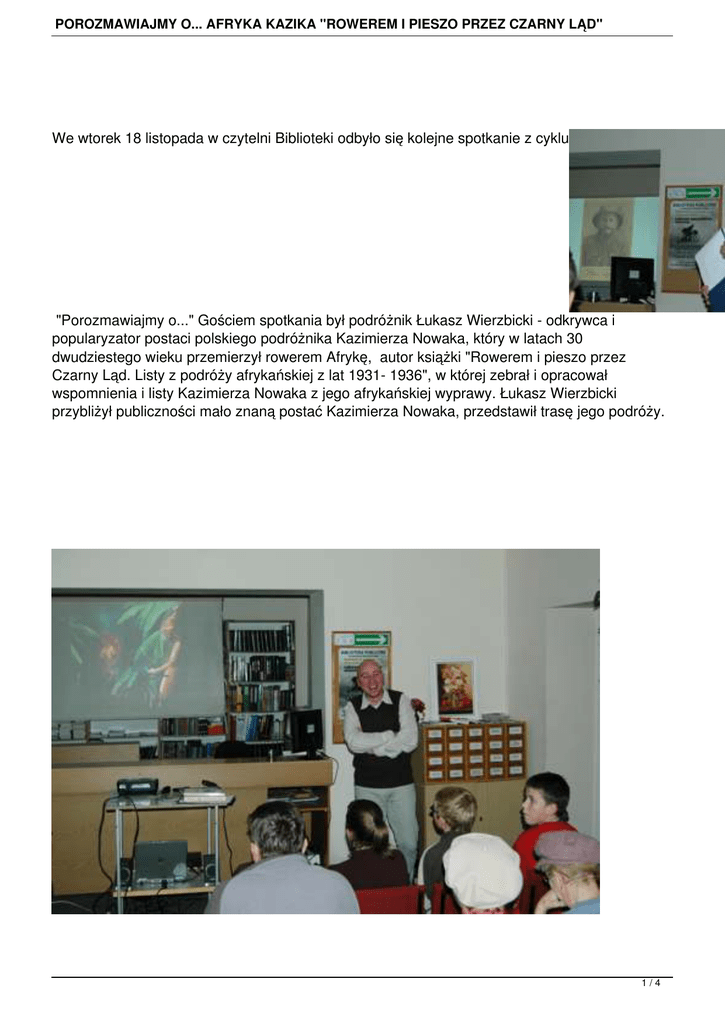 POROZMAWIAJMY O... AFRYKA KAZIKA "ROWEREM I PIESZO PRZEZ CZARNY LĄD" We wtorek 18 listopada w czytelni Biblioteki odbyło się kolejne spotkanie z cyklu "Porozmawiajmy o..." Gościem spotkania był podróżnik Łukasz Wierzbicki - odkrywca i popularyzator postaci polskiego podróżnika Kazimierza Nowaka, który w latach 30 dwudziestego wieku przemierzył rowerem Afrykę, autor książki "Rowerem i pieszo przez Czarny Ląd. Listy z podróży afrykańskiej z lat 1931- 1936", w której zebrał i opracował wspomnienia i listy Kazimierza Nowaka z jego afrykańskiej wyprawy. Łukasz Wierzbicki przybliżył publiczności mało znaną postać Kazimierza Nowaka, przedstawił trasę jego podróży. 1/4 POROZMAWIAJMY O... AFRYKA KAZIKA "ROWEREM I PIESZO PRZEZ CZARNY LĄD" 2/4 POROZMAWIAJMY O... AFRYKA KAZIKA "ROWEREM I PIESZO PRZEZ CZARNY LĄD" 3/4 POROZMAWIAJMY O... AFRYKA KAZIKA "ROWEREM I PIESZO PRZEZ CZARNY LĄD" 4/4