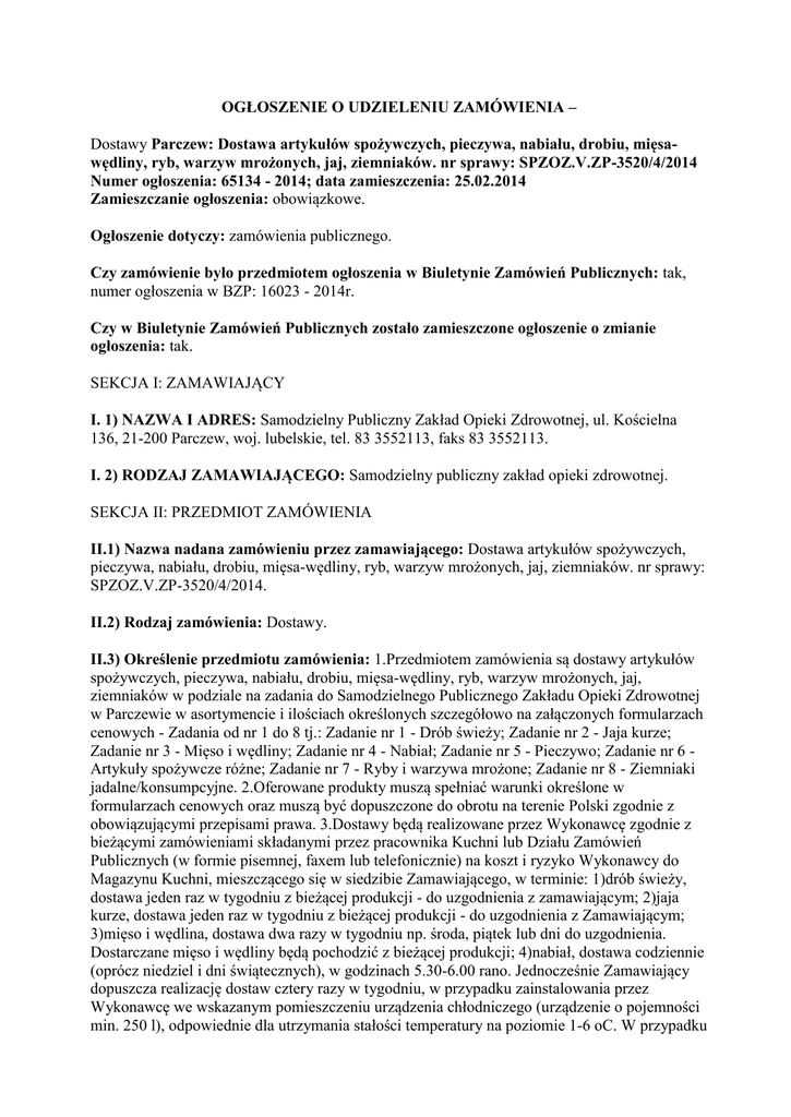 OGŁOSZENIE O UDZIELENIU ZAMÓWIENIA – Dostawy Parczew: Dostawa artykułów spożywczych, pieczywa, nabiału, drobiu, mięsawędliny, ryb, warzyw mrożonych, jaj, ziemniaków. nr sprawy: SPZOZ.V.ZP-3520/4/2014 Numer ogłoszenia: 65134 - 2014; data zamieszczenia: 25.02.2014 Zamieszczanie ogłoszenia: obowiązkowe. Ogłoszenie dotyczy: zamówienia publicznego. Czy zamówienie było przedmiotem ogłoszenia w Biuletynie Zamówień Publicznych: tak, numer ogłoszenia w BZP: 16023 - 2014r. Czy w Biuletynie Zamówień Publicznych zostało zamieszczone ogłoszenie o zmianie ogłoszenia: tak. SEKCJA I: ZAMAWIAJĄCY I. 1) NAZWA I ADRES: Samodzielny Publiczny Zakład Opieki Zdrowotnej, ul. Kościelna 136, 21-200 Parczew, woj. lubelskie, tel. 83 3552113, faks 83 3552113. I. 2) RODZAJ ZAMAWIAJĄCEGO: Samodzielny publiczny zakład opieki zdrowotnej. SEKCJA II: PRZEDMIOT ZAMÓWIENIA II.1) Nazwa nadana zamówieniu przez zamawiającego: Dostawa artykułów spożywczych, pieczywa, nabiału, drobiu, mięsa-wędliny, ryb, warzyw mrożonych, jaj, ziemniaków. nr sprawy: SPZOZ.V.ZP-3520/4/2014. II.2) Rodzaj zamówienia: Dostawy. II.3) Określenie przedmiotu zamówienia: 1.Przedmiotem zamówienia są dostawy artykułów spożywczych, pieczywa, nabiału, drobiu, mięsa-wędliny, ryb, warzyw mrożonych, jaj, ziemniaków w podziale na zadania do Samodzielnego Publicznego Zakładu Opieki Zdrowotnej w Parczewie w asortymencie i ilościach określonych szczegółowo na załączonych formularzach cenowych - Zadania od nr 1 do 8 tj.: Zadanie nr 1 - Drób świeży; Zadanie nr 2 - Jaja kurze; Zadanie nr 3 - Mięso i wędliny; Zadanie nr 4 - Nabiał; Zadanie nr 5 - Pieczywo; Zadanie nr 6 Artykuły spożywcze różne; Zadanie nr 7 - Ryby i warzywa mrożone; Zadanie nr 8 - Ziemniaki jadalne/konsumpcyjne. 2.Oferowane produkty muszą spełniać warunki określone w formularzach cenowych oraz muszą być dopuszczone do obrotu na terenie Polski zgodnie z obowiązującymi przepisami prawa. 3.Dostawy będą realizowane przez Wykonawcę zgodnie z bieżącymi zamówieniami składanymi przez pracownika Kuchni lub Działu Zamówień Publicznych (w formie pisemnej, faxem lub telefonicznie) na koszt i ryzyko Wykonawcy do Magazynu Kuchni, mieszczącego się w siedzibie Zamawiającego, w terminie: 1)drób świeży, dostawa jeden raz w tygodniu z bieżącej produkcji - do uzgodnienia z zamawiającym; 2)jaja kurze, dostawa jeden raz w tygodniu z bieżącej produkcji - do uzgodnienia z Zamawiającym; 3)mięso i wędlina, dostawa dwa razy w tygodniu np. środa, piątek lub dni do uzgodnienia. Dostarczane mięso i wędliny będą pochodzić z bieżącej produkcji; 4)nabiał, dostawa codziennie (oprócz niedziel i dni świątecznych), w godzinach 5.30-6.00 rano. Jednocześnie Zamawiający dopuszcza realizację dostaw cztery razy w tygodniu, w przypadku zainstalowania przez Wykonawcę we wskazanym pomieszczeniu urządzenia chłodniczego (urządzenie o pojemności min. 250 l), odpowiednie dla utrzymania stałości temperatury na poziomie 1-6 oC. W przypadku zainstalowania urządzenia chłodniczego, dostawy będą realizowane w poniedziałek, środę, piątek i sobotę do godziny 9.30 z zastrzeżeniem, że Wykonawca może zrealizować sobotnią dostawę w poniedziałek, w godzinach 5.30-6.00. Urządzenie chłodnicze na okres obowiązywania umowy zostaje oddane Zamawiającemu w użyczenie; 5)pieczywo, dostawy codziennie za wyjątkiem niedziel i dni świątecznych od godz. 6.30 do godz. 7.00 rano; 6)artykuły spożywcze różne, dostawa jeden raz w tygodniu - do uzgodnienia z Zamawiającym; 7)ryby mrożone i śledzie, warzywa mrożone - dostawa jeden raz w tygodniu - do uzgodnienia z Zamawiającym; 8)ziemniaki w typie jadalnym/ konsumpcyjnym ogólnoużytkowym, kształtne, duże owalne, np.: odmiany: Tajfun, Vineta, Triada, Tokaj, Zeus. Dostawa jeden raz w tygodniu w okresie: jesiennym, zimowym i wiosennym. W okresie letnim dwa razy w tygodniu (ziemniaki wczesne) - terminy dostaw do uzgodnienia z Zamawiającym. Ziemniaki powinny spełniać odpowiednie wymogi jakościowe dla żywienia w warunkach żywienia zbiorowego. Termin przydatności do spożycia artykułów spożywczych powinien być nie krótszy niż 1/2 okresu przydatności podanego na opakowaniu produktu. II.4) Wspólny Słownik Zamówień (CPV): 15.11.21.00-7, 03.14.25.00-3, 15.10.00.00-9, 15.50.00.00-3, 15.81.10.00-6, 15.89.00.00-3, 15.22.00.00-6, 15.33.00.00-0, 03.21.00.00-6. SEKCJA III: PROCEDURA III.1) TRYB UDZIELENIA ZAMÓWIENIA: Przetarg nieograniczony III.2) INFORMACJE ADMINISTRACYJNE Zamówienie dotyczy projektu/programu finansowanego ze środków Unii Europejskiej: nie SEKCJA IV: UDZIELENIE ZAMÓWIENIA Część NR: 1 Nazwa: Zadanie nr 1 - Drób świeży IV.1) DATA UDZIELENIA ZAMÓWIENIA: 20.02.2014. IV.2) LICZBA OTRZYMANYCH OFERT: 3. IV.3) LICZBA ODRZUCONYCH OFERT: 0. IV.4) NAZWA I ADRES WYKONAWCY, KTÓREMU UDZIELONO ZAMÓWIENIA: Przedsiębiorstwo Handlowe MILO Wojdakowski Robert i Joanna Spółka Jawna,, ul. Aleje Jana Pawła II 194, 21-500 Biała Podlaska, kraj/woj. lubelskie. IV.5) Szacunkowa wartość zamówienia (bez VAT): 15160,00 PLN. IV.6) INFORMACJA O CENIE WYBRANEJ OFERTY ORAZ O OFERTACH Z NAJNIŻSZĄ I NAJWYŻSZĄ CENĄ Cena wybranej oferty: 15306,90 Oferta z najniższą ceną: 15306,90 / Oferta z najwyższą ceną: 16537,50 Waluta: PLN. Część NR: 2 Nazwa: Zadanie nr 2 - Jaja kurze IV.1) DATA UDZIELENIA ZAMÓWIENIA: 20.02.2014. IV.2) LICZBA OTRZYMANYCH OFERT: 7. IV.3) LICZBA ODRZUCONYCH OFERT: 0. IV.4) NAZWA I ADRES WYKONAWCY, KTÓREMU UDZIELONO ZAMÓWIENIA: Produkcja Jaj Konsumpcyjnych Genowefa Kowieska, Żelków Kol., ul. Siedlecka 35, 08110 Siedlce, kraj/woj. mazowieckie. IV.5) Szacunkowa wartość zamówienia (bez VAT): 10476,19 PLN. IV.6) INFORMACJA O CENIE WYBRANEJ OFERTY ORAZ O OFERTACH Z NAJNIŻSZĄ I NAJWYŻSZĄ CENĄ Cena wybranej oferty: 6562,50 Oferta z najniższą ceną: 6562,50 / Oferta z najwyższą ceną: 11025,00 Waluta: PLN. Część NR: 3 Nazwa: 
