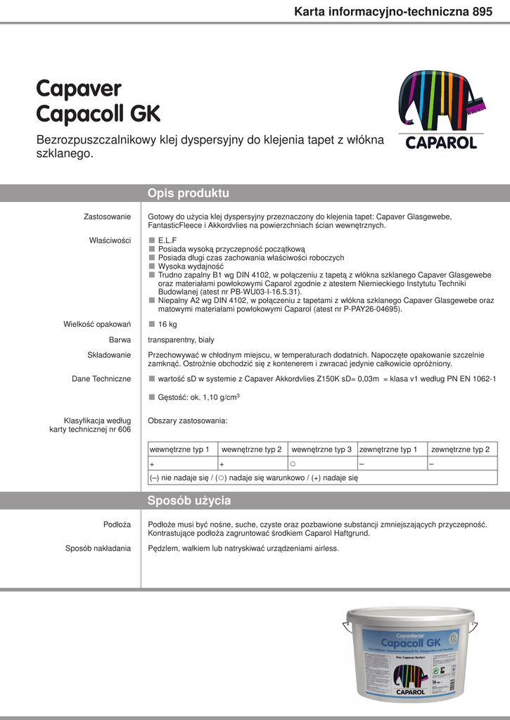 Karta informacyjno-techniczna 895 Capaver Capacoll GK Bezrozpuszczalnikowy klej dyspersyjny do klejenia tapet z włókna szklanego. Opis produktu Zastosowanie Właściwości Wielkość opakowań Barwa Składowanie Dane Techniczne Gotowy do użycia klej dyspersyjny przeznaczony do klejenia tapet: Capaver Glasgewebe, FantasticFleece i Akkordvlies na powierzchniach ścian wewnętrznych. ■ ■ ■ ■ ■ E.L.F Posiada wysoką przyczepność początkową Posiada długi czas zachowania właściwości roboczych Wysoka wydajność Trudno zapalny B1 wg DIN 4102, w połączeniu z tapetą z włókna szklanego Capaver Glasgewebe oraz materiałami powłokowymi Caparol zgodnie z atestem Niemieckiego Instytutu Techniki Budowlanej (atest nr PB-WU03-I-16.5.31). ■ Niepalny A2 wg DIN 4102, w połączeniu z tapetami z włókna szklanego Capaver Glasgewebe oraz matowymi materiałami powłokowymi Caparol (atest nr P-PAY26-04695). ■ 16 kg transparentny, biały Przechowywać w chłodnym miejscu, w temperaturach dodatnich. Napoczęte opakowanie szczelnie zamknąć. Ostrożnie obchodzić się z kontenerem i zwracać jedynie całkowicie opróżniony. ■ wartość sD w systemie z Capaver Akkordvlies Z150K sD= 0,03m = klasa v1 według PN EN 1062-1 ■ Gęstość: ok. 1,10 g/cm3 Klasyfikacja według karty technicznej nr 606 Obszary zastosowania: wewnętrzne typ 1 wewnętrzne typ 2 wewnętrzne typ 3 zewnętrzne typ 1 zewnętrzne typ 2 + + ○ – – (–) nie nadaje się / (○) nadaje się warunkowo / (+) nadaje się Sposób użycia Podłoża Sposób nakładania Podłoże musi być nośne, suche, czyste oraz pozbawione substancji zmniejszających przyczepność. Kontrastujące podłoża zagruntować środkiem Caparol Haftgrund. Pędzlem, wałkiem lub natryskiwać urządzeniami airless. Karta informacyjno-techniczna 895 Natrysk Airless: Kat natrysku: 40–50° Dysza: 0,017–0,019" Ciśnienie: 180–200 bar W wypadku opakowań standardowych ustawić konsystencję roboczą do natrysku airless dodając ok. 10-15% wody. Klejenie: Klej Capacoll GK nakładać obficie i równomiernie wałkiem z runa jagnięcego lub natryskiwać urządzeniami airless na szerokość 1-3 brytów. Od razu przykładać tapetę, docisnąć szpachlą plastikową usuwając pęcherze powietrza. Na podłożach słabo chłonnych, przy niskiej temperaturze lub wysokiej wilgotności powietrza przed klejeniem gęsto tkanych tapet klej po nałożeniu „odpowietrzyć” . Układ warstw Zużycie Sposób użycia: Przed przyklejeniem tapet do podłoża należy koniecznie zapoznać się z informacjami technicznymi dotyczącymi składników systemu! Tapeta z włókna szklanego Glasgewebe: drobna faktura: ok. 150 g/m2 średnia faktura: ok. 150–250 g/m2 gruba faktura: ok. 250–300 g/m2 Dokładne wartości zużycia można ustalić poprzez wykonanie próby na obiekcie. Warunki obróbki Czas schnięcia Minimalna temperatura użycia: +5°C dla podłoża, otoczenia i materiału. W temp. +20°C i względnej wilgotności powietrza 65% warstwa jest powierzchniowo sucha i nadaje się do powtórnego malowania po 6 - 12 godz. Powłoka jest całkowicie sucha i w pełni wytrzymała po ok. 3 dniach. W niższych temperaturach i przy wyższej wilgotności powietrza czasy te ulegają wydłużeniu. Karta informacyjno-techniczna 895 Wskazówka Do klejenia tapet o zwartych fakturach jak: K 1100, VB 1100 stosować wyłącznie Capacoll GK rozcieńczony ok. 20% wody. Rozcieńczyć klej z opakowań standardowych i nakładać wałkiem o krótkim włosiu. Tapetę przykładać po odpowiednim „odpowietrzeniu” kleju. Przy klejeniu tapet FantasicFleece oraz Capaver AkkordVliese, może dojść do zwiększonego zużycia materiału. Zaleca się zastosowanie Capacoll VK. W przypadku obróbki mas szpachlowych zawierających gips, może dojść w wyniku długotrwałego oddziaływania wilgoci do pęcznienia, powstania pęcherzy i odspojeń. Aby tego uniknąć należy zapewnić szybkie wysychanie poprzez odpowiednią temperaturę i wietrzenie. Wskazówki Uwaga (stan na dzień wydania) Utylizacja Dopuszczalna zawartośc LZO Giscode Deklarowany skład produktu Doradztwo techniczne Infolinia Chronić przed dziećmi. Zapewnić odpowiednie wietrzenie w czasie pracy i w czasie wysychania. Nie jeść, nie pić i nie palić tytoniu w trakcie pracy. W przypadku kontaktu z oczami natychmiast przemyć je obficie wodą. Przy natryskiwaniu nie wdychać oparów. Zapobiegać przedostaniu się kleju do kanalizacji. Unikać zrzutów do środowiska. Bliższe informacje, patrz karta charakterystyki wyrobu. Do recycling oddawać wyłącznie opróżnione opakowania. Pozostałe resztki materiału utylizować jak odpady komunalne lub budowlane. < 1 g/l LZO D1 Żywice polioctanu winylu, woda, dodatki, konserwanty (metyloizotiazolon, benzoizotiazolon). W karcie niniejszej niemożliwe jest opisanie sposobów przygotowania wszystkich występujących w praktyce podłoży. W przypadkach, które nie zostały opisane powyżej, pomocnym może okazać się kontakt z naszym Działem technicznym. Chętnie udzielimy Państwu szczegółowych informacji związanych z konkretnym obiektem. Doradztwo techniczne: Tel. (22) 544 20 40 Fax (22) 544 20 41 [email protected] Karta informacyjno-techniczna895, stan na marzec 2017 Niniejsza karta informacyjna została sporządzona na bazie najnowszych osiągnięć techniki i naszych doświadczeń. Ze względu na różnorodność możliwych podłoży i warunków wykonawstwa każdorazowy Kupujący / Użytkownik jest zobowiązany sprawdzić na własną odpowiedzialność przydatność naszych produktów do zamierzonego celu przy każdorazowym uwzględnieniu warunków obiektowych wykonawstwa oraz wymogów i zasad sztuki i rzemiosła. Po ukazaniu się następnej wersji niniejsza karta traci swoją ważność. Caparol Polska Sp. z o. o. · ul. Puławska 393 · PL – 02-801 Warszawa · tel. 022 544 20 40, faks 022 544 20 41 · internet: www.caparol.pl Caparol Farben Lacke Bautenschutz GmbH