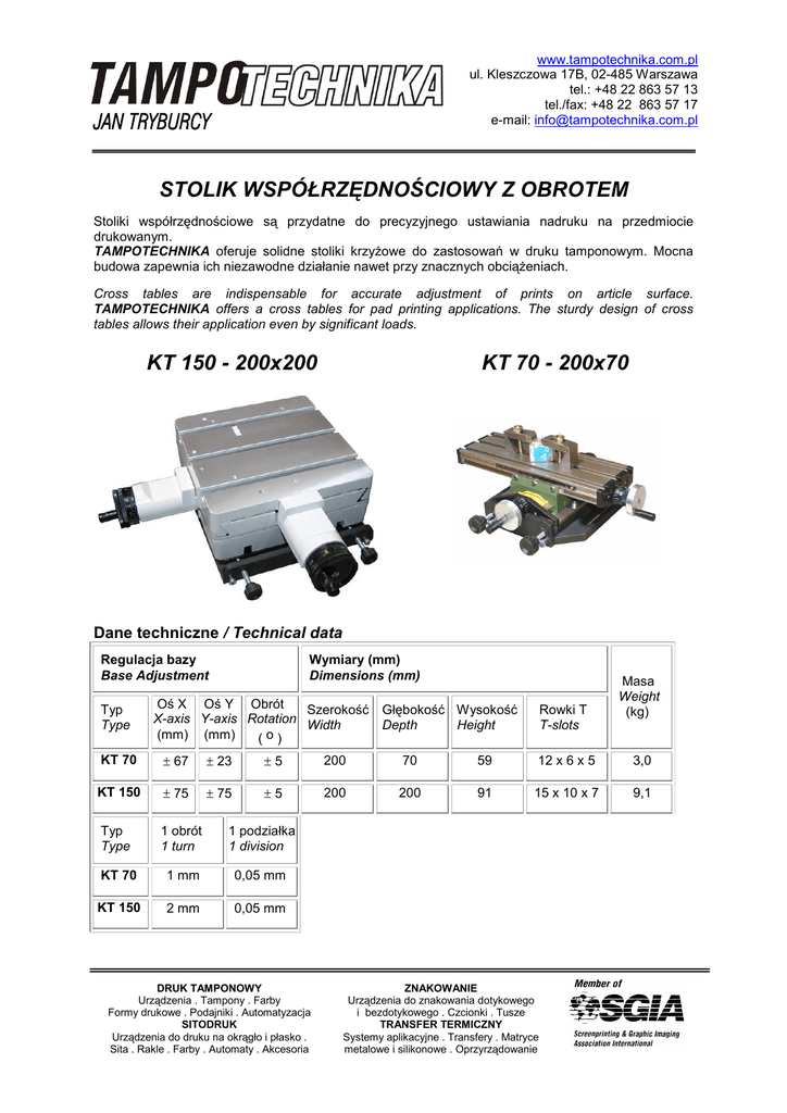1 www.tampotechnika.com.pl ul. Kleszczowa 17B, 02-485 Warszawa tel.: +48 22 863 57 13 tel./fax: +48 22 863 57 17 e-mail: [email protected] JAN TRYBURCY STOLIK WSPÓŁRZĘDNOŚCIOWY Z OBROTEM Stoliki współrzędnościowe są przydatne do precyzyjnego ustawiania nadruku na przedmiocie drukowanym. TAMPOTECHNIKA oferuje solidne stoliki krzyŜowe do zastosowań w druku tamponowym. Mocna budowa zapewnia ich niezawodne działanie nawet przy znacznych obciąŜeniach. Cross tables are indispensable for accurate adjustment of prints on article surface. TAMPOTECHNIKA offers a cross tables for pad printing applications. The sturdy design of cross tables allows their application even by significant loads. KT 150 - 200x200 KT 70 - 200x70 Dane techniczne / Technical data Regulacja bazy Base Adjustment Typ Type Wymiary (mm) Dimensions (mm) Oś X Oś Y Obrót Szerokość X-axis Y-axis Rotation Width (mm) (mm) (o) Głębokość Wysokość Depth Height Rowki T T-slots Masa Weight (kg) KT 70 ± 67 ± 23 ±5 200 70 59 12 x 6 x 5 3,0 KT 150 ± 75 ± 75 ±5 200 200 91 15 x 10 x 7 9,1 Typ Type 1 obrót 1 turn 1 podziałka 1 division KT 70 1 mm 0,05 mm KT 150 2 mm 0,05 mm DRUK TAMPONOWY Urządzenia . Tampony . Farby Formy drukowe . Podajniki . Automatyzacja SITODRUK Urządzenia do druku na okrągło i płasko . Sita . Rakle . Farby . Automaty . Akcesoria ZNAKOWANIE Urządzenia do znakowania dotykowego i bezdotykowego . Czcionki . Tusze TRANSFER TERMICZNY Systemy aplikacyjne . Transfery . Matryce metalowe i silikonowe . Oprzyrządowanie