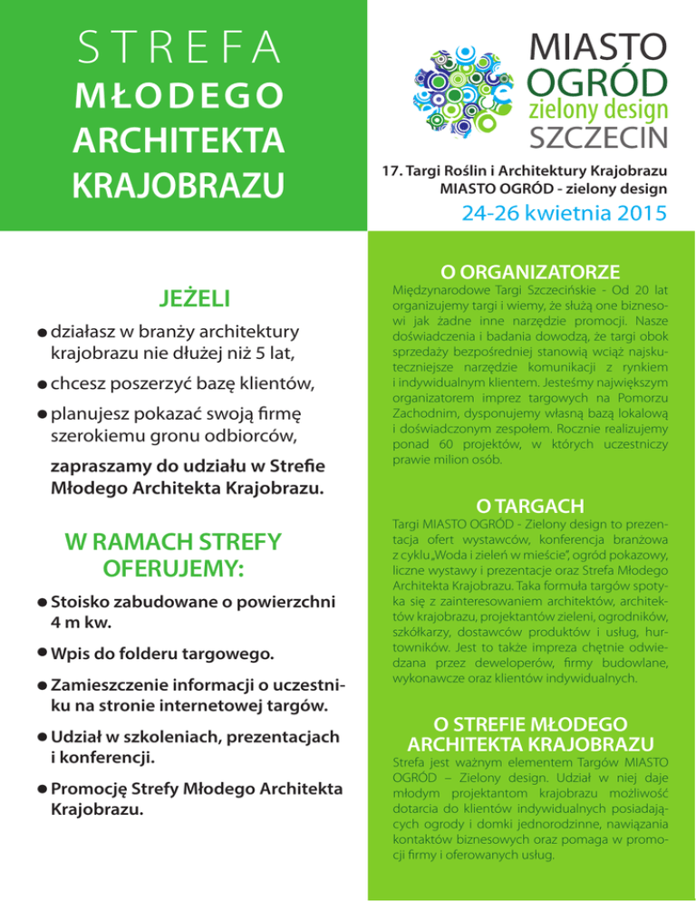 S T R E FA M ŁO D E G O ARCHITEKTA KRAJOBRAZU 17. Targi Roślin i Architektury Krajobrazu MIASTO OGRÓD - zielony design 24-26 kwietnia 2015 O ORGANIZATORZE JEŻELI działasz w branży architektury krajobrazu nie dłużej niż 5 lat, chcesz poszerzyć bazę klientów, planujesz pokazać swoją firmę szerokiemu gronu odbiorców, zapraszamy do udziału w Strefie Młodego Architekta Krajobrazu. Międzynarodowe Targi Szczecińskie - Od 20 lat organizujemy targi i wiemy, że służą one biznesowi jak żadne inne narzędzie promocji. Nasze doświadczenia i badania dowodzą, że targi obok sprzedaży bezpośredniej stanowią wciąż najskuteczniejsze narzędzie komunikacji z rynkiem i indywidualnym klientem. Jesteśmy największym organizatorem imprez targowych na Pomorzu Zachodnim, dysponujemy własną bazą lokalową i doświadczonym zespołem. Rocznie realizujemy ponad 60 projektów, w których uczestniczy prawie milion osób. O TARGACH W RAMACH STREFY OFERUJEMY: Stoisko zabudowane o powierzchni 4 m kw. Wpis do folderu targowego. Zamieszczenie informacji o uczestniku na stronie internetowej targów. Udział w szkoleniach, prezentacjach i konferencji. Promocję Strefy Młodego Architekta Krajobrazu. Targi MIASTO OGRÓD - Zielony design to prezentacja ofert wystawców, konferencja branżowa z cyklu „Woda i zieleń w mieście”, ogród pokazowy, liczne wystawy i prezentacje oraz Strefa Młodego Architekta Krajobrazu. Taka formuła targów spotyka się z zainteresowaniem architektów, architektów krajobrazu, projektantów zieleni, ogrodników, szkółkarzy, dostawców produktów i usług, hurtowników. Jest to także impreza chętnie odwiedzana przez deweloperów, firmy budowlane, wykonawcze oraz klientów indywidualnych. O STREFIE MŁODEGO ARCHITEKTA KRAJOBRAZU Strefa jest ważnym elementem Targów MIASTO OGRÓD – Zielony design. Udział w niej daje młodym projektantom krajobrazu możliwość dotarcia do klientów indywidualnych posiadających ogrody i domki jednorodzinne, nawiązania kontaktów biznesowych oraz pomaga w promocji firmy i oferowanych usług. KORZYŚCI DLA UCZESTNIKA STREFY: Dotarcie do konkretnej grupy odbiorców z „zielonej” branży z województwa zachodniopomorskiego. Kontakt bezpośredni z konsumentem – dzięki obecności na stoisku targowym możemy poznać oczekiwania i opinie naszych klientów, przekonać ich do naszej oferty. Przez 3 dni pojawia się ponad 6 000 potencjalnych klientów. Zwiększenie rozpoznawalności firmy i własnej oferty Wzbudzenie zaufania wśród klientów jak powszechnie wiadomo, firmy i organizacje muszą komunikować się z potencjalnym klientem, aby wskazać mu, w jaki sposób ich produkt będzie zaspakajał ich potrzeby. Targi są do tego idealnym miejscem. CAŁKOWITY KOSZT UDZIAŁU W STREFIE MŁODEGO ARCHITEKTA KRAJOBRAZU WYNOSI 280 ZŁ. NETTO ZGŁOSZENIA I INFORMACJE: Lidia Kuszyk tel. 91 464 44 65, 91 464 44 01 w 114 [email protected] www.mts.pl