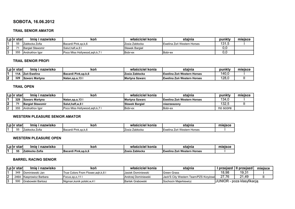 SOBOTA, 16.06.2012 TRAIL SENIOR AMATOR Lpnr start Imię i nazwisko 55 Zabłocka Zofia 1 71 Bargieł Sławomir 2 355 3 Andrukhov Igor koń właściciel konia Bacardi Pink,sp,k,6 Zosia Zabłocka Salut,hafl,w,8 l Sławek Bargieł Poco Miss Hollywood,aqh,k,7 l Bobr-ex stajnia Ewelina Zoń Western Horses Bobr-ex punkty 131,5 0,0 0,0 miejsce I punkty 140,0 128,0 miejsce I II punkty 134,0 132,5 no score miejsce I II TRAIL SENIOR PROFI Lpnr start Imię i nazwisko 11A Zoń Ewelina 1 329 Szwarc Martyna 2 koń właściciel konia stajnia Bacardi Pink,sp,k,6 Zosia Zabłocka Ewelina Zoń Western Horses Natan,sp,o,13 l Martyna Szwarc Ewelina Zoń Western Horses TRAIL OPEN Lpnr start Imię i nazwisko 329 Szwarc Martyna 1 71 Bargieł Sławomir 2 355 Andrukhov Igor 2 koń właściciel konia stajnia Natan,sp,o,13 l Martyna Szwarc Ewelina Zoń Western Horses Salut,hafl,w,8 l Sławek Bargieł niezrzeszony Poco Miss Hollywood,aqh,k,7 l Bobr-ex Bobr-ex WESTERN PLEASURE SENIOR AMATOR Lpnr start Imię i nazwisko 55 Zabłocka Zofia 1 koń właściciel konia Zosia Zabłocka Bacardi Pink,sp,k,6 stajnia Ewelina Zoń Western Horses miejsce I WESTERN PLEASURE OPEN Lpnr start Imię i nazwisko 55 Zabłocka Zofia 1 koń właściciel konia Zosia Zabłocka Bacardi Pink,sp,k,6 stajnia Ewelina Zoń Western Horses miejsce I BARREL RACING SENIOR Lpnr start Imię i nazwisko 349 Dominiewski Jan 1 246A Kasprowicz Barbara 2 500 Grabowski Bartosz 3 koń właściciel konia True Colors From Flower,aqh,k,6 l Jasiek Dominiewski Focus,sp,o,11 l Andrzej Dominiewski Nigman,konik polski,w,4 l Bartek Grabowski stajnia I przejazd II przejazd miejsce 18,98 19,31 I Jack'S City Western Team/PZS Krzyżowice 27,76 21,49 II Sochocin Majerkiewicz JUNIOR - poza klasyfikacją Green Grass POLE BENDING SENIOR Lpnr start Imię i nazwisko 349 Dominiewski Jan 1 246A Kasprowicz Barbara 2 500 Grabowski Bartosz 3 koń właściciel konia True Colors From Flower,aqh,k,6 l Jasiek Dominiewski Focus,sp,o,11 l Andrzej Dominiewski Nigman,konik polski,w,4 l Bartek Grabowski stajnia I przejazd II przejazd miejsce 27,68 33,65 I Jack'S City Western Team/PZS Krzyżowice 33,48 31,87 II Sochocin Majerkiewicz JUNIOR - poza klasyfikacją Green Grass REINING SENIOR PROFI Lpnr start Imię i nazwisko 60A Żarnawski Michał 1 60 Żarnawski Michał 2 11 Zoń Ewelina 3 koń właściciel konia stajnia punkty 132,0 131,5 0,0 miejsce I II stajnia punkty 133,0 133,0 129,5 120,0 0,0 dogrywka 138,0 136,0 stajnia punkty 17,0 14,0 10,0 miejsce I II III Jacs Golden Slide,aqh,w,6 l Iza Żarnawska WRC Bronco Top C Golden Mr Right,aqh,w,10 l Adam Pyskło WRC Bronco Ferdek,nn,o,4 l Borys Pardus Ewelina Zoń Western Horses REINING OPEN Lpnr start Imię i nazwisko 383 Ciok Andrzej 1 60 Żarnawski Michał 2 60A Żarnawski Michał 3 400 Sulich Piotr 4 355 Andrukhov Igor 5 koń właściciel konia Frozen Slide,aqh,k,8 l Andrzej Ciok Ranch 4 you Top C Golden Mr Right,aqh,w,10 l Adam Pyskło WRC Bronco Jacs Golden Slide,aqh,w,6 l Iza Żarnawska WRC Bronco Miss Bronco Bardell,aqh,k,5 l Piotr Sulich Parmex Ranch Poco Miss Hollywood,aqh,k,7 l Bobr-ex Bobr-ex KING HORSE WESTERN FREESTYLE Lp 1 2 3 Imię i nazwisko koń właściciel konia Zabłocka Zofia Bacardi Pink,sp,k,6 Zosia Zabłocka Polikarpow Magdalena Hesa Tough Peppy,aqh,w,7 l Magda Polikarpow Sikorski Piotr Bacardi Pink,sp,k,6 Zosia Zabłocka Ewelina Zoń Western Horses Ewelina Zoń Western Horses miejsce I II III