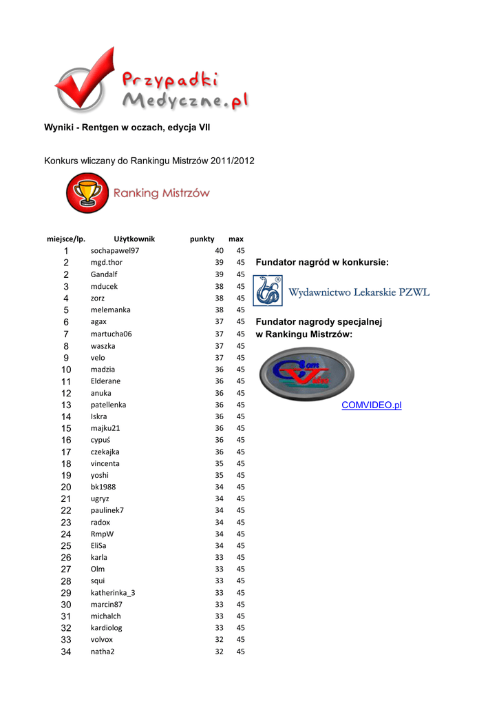 Wyniki - Rentgen w oczach, edycja VII Konkurs wliczany do Rankingu Mistrzów 2011/2012 miejsce/lp. 1 2 2 3 4 5 6 7 8 9 10 11 12 13 14 15 16 17 18 19 20 21 22 23 24 25 26 27 28 29 30 31 32 33 34 Użytkownik sochapawel97 mgd.thor Gandalf mducek zorz melemanka agax martucha06 waszka velo madzia Elderane anuka patellenka Iskra majku21 cypuś czekajka vincenta yoshi bk1988 ugryz paulinek7 radox RmpW EliSa karla Olm squi katherinka_3 marcin87 michalch kardiolog volvox natha2 punkty 40 39 39 38 38 38 37 37 37 37 36 36 36 36 36 36 36 36 35 35 34 34 34 34 34 34 33 33 33 33 33 33 33 32 32 max 45 45 45 45 45 45 45 45 45 45 45 45 45 45 45 45 45 45 45 45 45 45 45 45 45 45 45 45 45 45 45 45 45 45 45 Fundator nagród w konkursie: Fundator nagrody specjalnej w Rankingu Mistrzów: COMVIDEO.pl 35 36 37 38 39 40 41 42 43 44 45 46 47 48 49 50 51 52 53 54 55 56 57 58 59 60 61 62 63 64 65 66 67 68 69 70 71 72 73 74 75 76 77 78 79 80 81 82 83 84 85 86 apomiano pcogito eakz gabiha acane Brązowa beansi MarWoz em_ilka maciejk delancey Sabi deesys Kuksonia lolek_wol kamlusz Asik zuczkam rask235 milkowicz olka_strepto wiosna Kamil babel113 frenczu Alexx izulkka edyta ollizz kuciur Neuromania ewelinajasic Nienor magdalenna sasquacz yarglet musculus4 kobziarz meomartino sterno Langusta Scurto evelyn88 drdreyfus brzydal mmaja parradoxx omega bakelit bulik Jarko monifly 32 32 32 32 31 31 31 31 31 31 31 31 31 30 30 30 30 30 30 30 30 30 29 29 29 29 29 29 29 28 28 28 28 28 28 27 27 27 27 27 27 27 27 27 27 27 26 26 26 26 26 26 45 45 45 45 45 45 45 45 45 45 45 45 45 45 45 45 45 45 45 45 45 45 45 45 45 45 45 45 45 45 45 45 45 45 45 45 45 45 45 45 45 45 45 45 45 45 45 45 45 45 45 45 87 88 89 90 91 92 93 94 95 96 97 98 99 100 101 102 103 104 105 106 107 108 109 110 111 112 113 114 115 116 117 118 119 120 121 122 123 124 125 126 127 128 129 130 131 132 133 134 135 136 137 138 el.mariaci adak monia_ania anatom biala17a anitex AJU13 olexis LukaszMD zochowskam Batigol eva durchli Sza Ewik medic antonio alert-cooperative Tomek_29 gpszkit P.aula ines87 Mnichu AniaD303 sloma18 doktorek89 kalina_85 dirka ignas1 pazdro Katruszka wiewiorka Leptospira lands pielęgniarz ciucia3 zrobmikawe Tinkerbell mat_tiz Luk dezerter jabbuk mp999 hellfire kietli A_Piekarska michalh MartaM czajka Nakeli panoramix zozi88 26 25 25 25 25 25 25 25 25 24 24 24 24 24 24 24 24 24 23 23 23 23 23 23 23 23 22 22 22 22 22 22 22 22 22 22 21 21 21 21 21 21 21 20 20 20 20 20 20 20 20 19 45 45 45 45 45 45 45 45 45 45 45 45 45 45 45 45 45 45 45 45 45 45 45 45 45 45 45 45 45 45 45 45 45 45 45 45 45 45 45 45 45 45 45 45 45 45 45 45 45 45 45 45 139 140 141 142 143 144 145 146 147 148 149 150 151 152 153 154 155 156 157 158 159 160 161 162 163 164 165 166 167 168 169 170 171 172 173 174 175 176 177 178 179 180 181 182 183 184 185 186 187 188 189 190 catty abakow malwa11 hagda merigold2 Medico czupakabra Madziolek christostan dorska LeoVoussen dudbar wuj sama Marrta alioko esdo czlowiecz micho1990 mart fiolasrpk thomson kwolus Aszyn d.biesiada junior gremlin signet madzik888 libertador Nagareboshi lekinspe ratowniczka mala89 ciasteczkowy Slayer1990 marcysienka gibki_palec czornydanio90 mmp rybka7722 Diaphragma MagdaLenak dorcik Zych wolverine Alex MartaWojciechowska panda0000 hinimo Magda solupred-oro moscati 19 19 19 19 19 19 18 18 18 18 18 18 18 17 17 17 17 17 16 16 16 15 15 15 15 15 15 14 14 14 14 14 13 13 13 12 12 11 11 11 10 9 9 9 9 9 9 8 8 8 7 7 45 45 45 45 45 45 45 45 45 45 45 45 45 45 45 45 45 45 45 45 45 45 45 45 45 45 45 45 45 45 45 45 45 45 45 45 45 45 45 45 45 45 45 45 45 45 45 45 45 45 45 45 191 192 193 mali195 KOSSA monikaw993 6 2 0 45 45 45