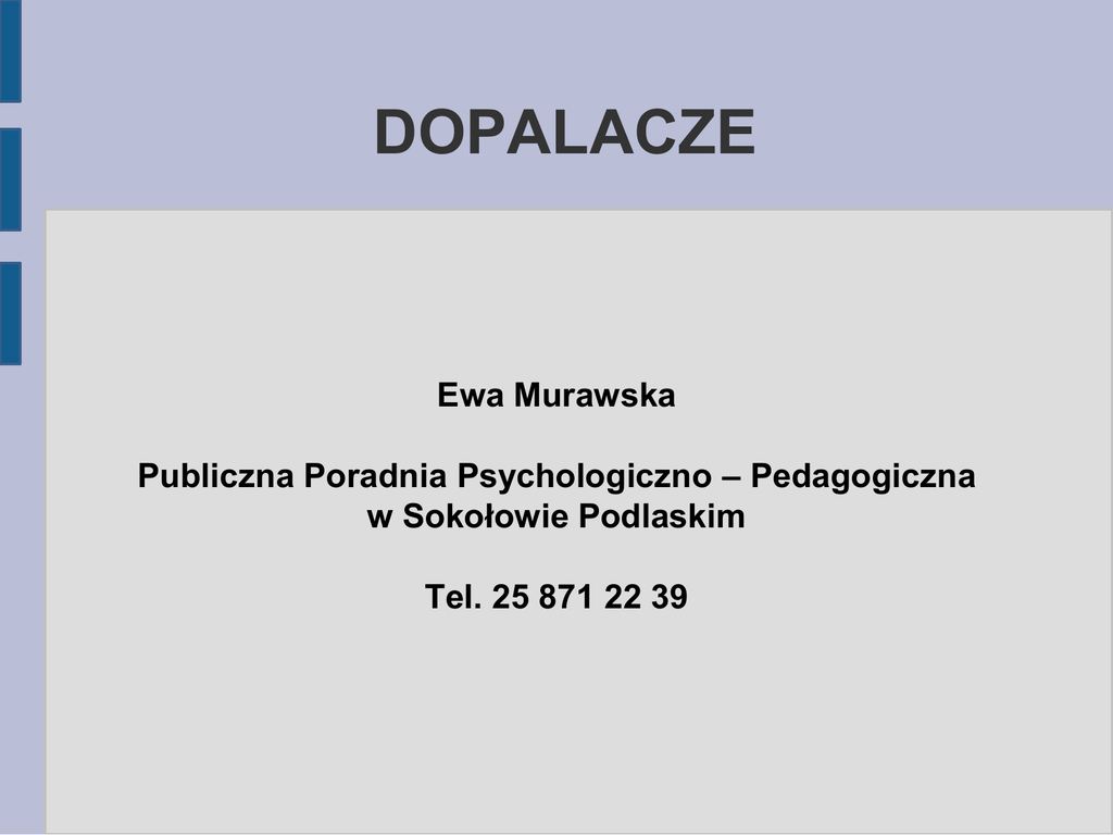 DOPALACZE Ewa Murawska Publiczna Poradnia Psychologiczno – Pedagogiczna w Sokołowie Podlaskim Tel. 25 871 22 39 Dopalacze „dopalacze” -ang. smarts, legal highs, smart drugs, designer drugs – środki, które zastępują i naśladują narkotyki, które są narkotykami ●Termin nieposiadający charakteru naukowego, używany potocznie ● Nowe narkotyki proszki tabletki kapsułki papierosy skręty kadzidełka aerozole żywice mieszanki ziołowe Nowe narkotyki Dopalacze to nowe narkotyki, których użycie stanowi bezpośrednie zagrożenie dla zdrowia lub życia. W 2014 i 2015 roku w Polsce dramatycznie wzrosła liczba zatruć i zgonów po ich użyciu. Nawet jednokrotne użycie może doprowadzić do nieodwracalnych skutków zdrowotnych, a nawet śmierci Nowe narkotyki Nowe narkotyki, choć sprzedawane jako ten sam produkt, za każdym razem mogą mieć inny skład. Charakteryzują się one wysoką toksycznością. Ich użycie łatwo może doprowadzić do trwałego uszkodzenia organów wewnętrznych i mózgu. Nowe narkotyki Działanie halucynogenne, ● agresja ● wzrost ciśnienia, przyspieszony puls, ● trudności w oddychaniu, ● sztywność mięśni, ● uszkodzenie nerek, ● silne pobudzenie psychoruchowe, ● niepokój, bezsenność, lęk, panikę, ● utratę kontroli nad własnym zachowaniem, ● próby samobójcze ● zatrzymanie akcji serca ● Inne zagrożenia Nieznany skład ●Nieznane pochodzenie ●Nieprzebadane substancje ●Zanieczyszczenia: ołów, mangan, rtęć, pestycydy, brud ● Inne zagrożenia Konflikt z prawem W każdym przypadku popełnienia czynu karalnego przez ucznia, który nie ukończył 17 lat należy zawiadomić policję lub sąd rodzinny, a w przypadku popełnienia przestępstwa przez ucznia, który ukończył 17 rok życia prokuratora lub policję (art. 4 Upn i art. 304 Kpk ● Publikacja w Internecie ● Kim jest nastolatek podatny na uzależnienie? Model wychowawczy oparty na systemie kar lub tzw. „bezstresowe wychowanie” ●Brak umiejętności rozwiązywania problemów ●Poniżanie ●Poczucie beznadziei ●Słaba kontrola rodzicielska ●Wzmocnienie społeczne ●Historia zażywania w rodzinie ●Zaburzony kontakt z przynajmniej z jednym z rodziców ● Jaki jest nastolatek podatny na uzależnienie? Cierpi psychicznie i nie jest zdolny do poradzenia sobie z tym ●Ma chroniczne poczucie porażki ●Ma silną potrzebę niezależności ●Ma niską kontrolę impulsów ●Skłonność do przygód, buntowniczość ●Odrzucanie tradycyjnych wartości ● Co chroni ? Silna pozytywna więź z rodzicami, dobrymi nauczycielami ●Sukcesy w nauce lub sporcie ●Religia ●Konstruktywna grupa rówieśnicza ● DOBRY KONTAKT ● ● ● Rozmowa jest podstawą dobrych kontaktów z dzieckiem, a podstawą rozmowy jest uważne słuchanie. Staraj się zawsze znaleźć czas na rozmowę, gdy dziecko ma problem. Rozmowa pomaga pozbyć się przykrych uczuć. Gdy czuje się bezradne i skrzywdzone, pozwól mu się wygadać, wypłakać i wyzłościć. Postaraj się je zrozumieć i mądrze mu doradzić. W żadnym wypadku nie bagatelizuj jego problemów. Znajdź też czas, gdy chce się podzielić radością, sukcesem. Okaż swoje zadowolenie, pochwal, spytaj o szczegóły wydarzenia. Nie umniejszaj wagi sukcesu, powiedz, jaki jesteś z niego dumny. To mu dodaje wiary w siebie i jest zachętą do osiągania dalszych sukcesów. ZASADY ● ● ● ● ● Bądź przykładem. Postępuj tak, by być wiarygodnym. Dzieci są dobrymi obserwatorami i łatwo zauważą, gdy nie robisz tak, jak mówisz Wymagaj, ale stawiaj dziecku warunki możliwe do spełnienia Bądź konsekwentny, aby dziecko liczyło się z tobą i wiedziało, że ustalone przez ciebie normy w ważnych sprawach muszą być respektowane. Poznaj przyjaciół i znajomych dziecka. Pamiętaj, że w tym wieku koledzy odgrywają ważną rolę i często mają duży wpływ. Szanuj prawo dziecka do własnych wyborów, opinii, dysponowania swoim wolnym czasem. Doradzaj, ale nie narzucaj swojej woli. ZASADY cd. ● ● ● Pozwól dziecku zdobywać doświadczenia; ono uczy się życia przede wszystkim robiąc nowe rzeczy, sprawdzając. Czasem popełnia przy tym błędy, bądź zatem czujny i w porę reaguj. Określ jasno zasady dotyczące zakazu stosowania środków odurzających i innych używek, ale sam też unikaj nadużywania leków, papierosów i alkoholu. Ucz jak przezwyciężać trudności i radzić sobie w trudnych sytuacjach. Dotyczy to także sytuacji, gdy ktoś proponuje narkotyki. Czego nie powinni rodzice • Akceptować upijania się, odurzania, palenia, • Częstować alkoholem lub papierosami dzieci, które nie są dojrzałe, • Pozwalać na imprezy bez ich obecności lub dozoru dorosłych, • Wpadać w panikę i przeprowadzać zasadniczych rozmów z dzieckiem, gdy jest ono pod wpływem środka odurzającego, • Udawać, że to nie prawda, odrzucać przedstawiane fakty, • bezgranicznie ufać dziecku, • Grozić, krzyczeć, histeryzować, • Usprawiedliwiać dziecka, szukając winy w sobie lub np. złym towarzystwie, • Liczyć, że policja, sąd, szkoła, poradnia wychowają dziecko, • Wierzyć zapewnieniom dziecka, że ma kontrolę nad narkotykami i że samo sobie poradzi z tym problemem, • Nadmiernie ochraniać dziecka przed konsekwencjami używania • narkotyków, np. nie pisać usprawiedliwień nieobecności w szkole, • nie spłacać długów dziecka, • Uznać dziecko za stracone. Dziękuję za uwagę Ewa Murawska Publiczna Poradnia Psychologiczno - Pedagogiczna W Sokołowie Podlaskim Tel. 25 781 22 39