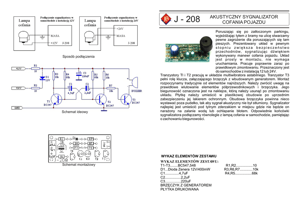 JABEL Sposób pod³¹czenia Schemat ideowy Schemat monta¿owy ® J - 208 AKUSTYCZNY SYGNALIZATOR COFANIA POJAZDU Poruszaj¹c siê po zat³oczonym parkingu, wyje¿d¿aj¹c ty³em z bramy na ulicê stwarzamy pewne zagro¿enie dla poruszaj¹cych siê tam pieszych. Prezentowany uk³ad w pewnym stopniu zwiêksza bezpieczeñstwo przechodniów, sygnalizuj¹c dŸwiêkiem wykonywany manewr cofania pojazdu. Uk³ad jest prosty w monta¿u, nie wymaga uruchamiania. Pracuje poprawnie zaraz po prawid³owym zmontowaniu. Przeznaczony jest do samochodów z instalacj¹ 12 lub 24V. Tranzystory Tl i T2 pracuj¹ w uk³adzie multiwibratora astabilnego. Tranzystor T3 pe³ni rolê klucza, za³¹czaj¹cego brzêczyk z wbudowanym generatorem. Monta¿ rozpoczynamy tradycyjnie od elementów najni¿szych. Nale¿y zwróciæ uwagê na prawid³owe wlutowanie elementów pó³przewodnikowych i brzêczyka. Jego biegunowoœæ oznaczona jest na naklejce, któr¹ nale¿y usun¹æ po zmontowaniu uk³adu. P³ytkê nale¿y umieœciæ w plastikowej obudowie po uprzednim zabezpieczeniu jej lakierem ochronnym. Obudowa brzêczyka powinna nieco wystawaæ poza pude³ko, tak aby sygna³ akustyczny nie by³ st³umiony. Sygnalizator najlepiej jest umieœciæ pod tylnym zderzakiem w miejscu gdzie nie bêdzie on nara¿ony na zalanie wod¹ lub ochlapanie b³otem. Odpowiednie koñcówki sygnalizatora pod³¹czamy równolegle z lamp¹ cofania w samochodzie, pamiêtaj¹c o zachowaniu biegunowoœci. WYKAZ ELEMENTÓW ZESTAWU WYKAZ ELEMENTÓW ZESTAWU: T1-T3........BC547,548 D1...Dioda Zenera 12V/400mW C1..............4,7uF C2................2,2uF C3................220uF BRZÊCZYK Z GENERATOREM P£YTKA DRUKOWANA R1,R2.................10 R3,R6,R7.............10k R4,R5.................68k