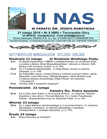 U NAS W PARAFII ŚW. JÓZEFA ROBOTNIKA 21 lutego 2016 Nr 8 (889) Tarnowskie Góry tel. 384 66 85 www.jtg.deum.pl e-mail: [email protected] Konto bankowe: PEKAO S.A. nr r-ku: 47124013431111000023681554 Kancelaria parafialna – ul. Pomorska 24 czynna: pon. i środa 9.00÷11.00, czw. 15.00÷16.30; 18.30÷19.30 Niedziela 21 lutego 8.30 10.00 11.30 15.00 II Niedziela Wielkiego Postu Do Bożej Opatrzności i MBNP z podziękowaniem za otrzymane łaski z prośbą o dalsze, Boże Błogosławieństwo i zdrowie w intencji Zofii Stolka w 60 rocznicę urodzin. (z ul. KR) Za † Czesława Niedźwiadek , † córkę Marię i dusze w czyśćcu cierpiące. (z ul. GR) Do Dzieciątka Jezus i Anioła Stróża w intencji rocznych dzieci: Jakub Matuszek, Lena Rita Nycz, Mikołaj Mrugacz, Jakub Brytner oraz w intencji dziecka chrzcielnego Kingi Polusik ich rodziców i chrzestnych. Gorzkie Żale z kazaniem pasyjnym. Poniedziałek 22 lutego Katedry Św. Piotra Apostoła 18.00 Za † brata Jana Żuber w 18 rocznicę śmierci, †† rodziców, teściów, dziadków z obu stron, † Dorotę Matonia, †† z rodzin Pawełoszek, Kubiak , Rozwandowicz oraz ks. Edwarda Polak. (z ul. PA) Wtorek 23 lutego 18.00 Za † męża Mariana Jakubowskiego w 4 rocznicę śmierci, †† rodziców Stanisławę i Czesława, †† teściów Stanisławę i Czesława Drożdżynskich, † szwagra Ryszarda. (z ul. PO) Środa 24 lutego 8.00 Msza zbiorowa za zmarłych. Czwartek 25 lutego 17.00 1. Do Bożej Opatrzności i MBNP z podziękowaniem za otrzymane łaski z prośbą o dalsze, Boże Błogosławieństwo i zdrowie w intencji Danuty i Andrzeja Wowro okazji 40 rocznicy ślubu oraz z o Boże Błogosławieństwo dla całej rodziny. (z ul. MŁ) 2. Za † Janusza Ćwiok – od sąsiadów. Piątek 26 lutego 17.15 18.00 Droga Krzyżowa. Za † dziadka Antoniego Ciekot oraz †† z rodziny Ciekot i Trzepizur. Sobota 27 lutego 16.30 17.00 Adoracja Najświętszego Sakramentu. Za †† Marlenę Marczak i Marię Napierała w 2 rocznicę śmierci, †† z rodzin Napierała i Marczak. Niedziela 28 lutego 8.30 10.00 11.30 15.00 III Niedziela Wielkiego Postu Za † Czesławę Dżugaj, jej † męża Józefa - od sąsiadów z ul. Młodzieżowej, Gruzełki i Zachodniej. Za † męża Antoniego Kania, †† z rodziny, Wincentego i Annę Kania, †† Edwarda, Otylię Motyl, † Bolesława Motyl i † Krystynę Haładus. Do Bożej Opatrzności i MBNP z podziękowaniem za otrzymane łaski z prośbą o dalsze, Boże Błogosławieństwo i zdrowie w intencji Barbary i Jana Wrona z okazji 40 rocznicy ślubu. (z ul.CB) Gorzkie Żale z kazaniem pasyjnym. Co roku w drugą niedzielę okresu paschalnego przygotowania rozważamy ewangelijną perykopę o przemienieniu Chrystusa na wysokiej górze. Tak jak wybranym uczniom, tak i nam Pan Jezus pragnie ukazać blask swojego bóstwa i pokazać, kim jest, by umacniać nas w wierze i na drogach życiowego powołania. Nie bójmy się Jemu zaufać, pozwólmy Mu działać w nas i przez nas. W Wielkim Poście wzbudźmy w sobie szczere pragnienie oczyszczenia serca w zdroju Bożego miłosierdzia, które jest otwarte dla wszystkich i którego doświadczamy szczególnie w spowiedzi świętej. Okazja do spowiedzi świętej przed i podczas każdej Mszy Świętej. Niech również wielkopostne rekolekcje, które rozpoczniemy pomogą nam w podejmowaniu wysiłku przemiany życia i dobrego przygotowania się do przeżycia świąt Zmartwychwstania Pańskiego. Szczegółowy program rekolekcji został umieszczony w gablotce przy wyjściu z kościoła, na specjalnym plakacie oraz w parafialnym biuletynie i internetowe stronie parafii. Znajdziemy tam również program szkolnych rekolekcji dla dzieci i młodzieży. Dzisiejsza niedziela nazywana jest niedzielą Ad gentes i jest poświęcona modlitwie za misje i misjonarzy. Przy wyjściu ze świątyni będzie można wesprzeć dzieło misyjne Kościoła – do specjalnych puszek można wrzucać ofiary na ten cel. Jutro przypada święto Katedry Świętego Piotra Apostoła. Przyjdźmy w tym dniu na Mszę Świętą, a przede wszystkim pamiętajmy w modlitwie za następcę Świętego Piotra, który nie przestaje prosić o to wsparcie. Dzisiaj o godz. 15.00 Gorzkie Żale z kazaniem pasyjnym. W Wielkim Poście zapraszam do udziału w nabożeństwach pasyjnych Droga Krzyżowa w każdy piątek o godz.17.15. i Gorzkie Żale w niedziele o godz,.15.00. Można składać intencje na Msze św. zbiorowe za zmarłych - od Środy popielcowej rozpoczął się nowy cykl tych mszy św. Kolekta dzisiejsza na potrzeby naszej parafii, także przed kościołem zbiórka na dzieci w Afryce, w następną niedzielę na potrzeby naszej parafii. Za wszystkie ofiary Bóg Zapłać. Zapraszamy na jednodniowe nauki przedmałżeńskie obejmujące katechezy ogólne, które odbędą się w sobotę 12 marca 2016 r. w godz. od 10.00 do 18.00 w parafii św. Marii Magdaleny w Kuźni Raciborskiej. Program został ustalony zgodnie z nowymi wytycznymi w naszej diecezji i jest umieszczony na parafialnej stronie internetowej: www.parafiakuznia.pl Nauki nie obejmują trzech spotkań w Poradni Życia Rodzinnego. Koszt 30 zł. od osoby + 5 zł. od pary na materiały. Prosimy o wcześniejsze zgłoszenia: 32 419 13 54. Kurs dla Fotografów Kuria Diecezjalna w Gliwicach organizuje kurs dla fotografów i operatorów sprzętu audiowizualnego, który odbędzie się w Centrum Edukacyjnym św. Jana Pawła II w Gliwicach, ul. Jana Pawła II 5 A (obok katedry). Kurs obejmuje dwa spotkania 10 marca (czwartek) oraz 17 marca 2016 r. (czwartek), w godzinach 15.00 - 19.30. Zgłoszenia do dnia 7 marca 2016 r. Organizatorzy proszą uczestników o punktualne przybycie. Kurs dla Fotografów oraz Realizatorów nagrań z ceremonii Liturgicznych ADRESACI KURSU: Fotografowie zawodowi lub amatorzy, którzy osobiście realizują filmy lub wykonują zdjęcia podczas jakichkolwiek nabożeństw liturgicznych w kościołach lub kaplicach rzymskokatolickich na ter