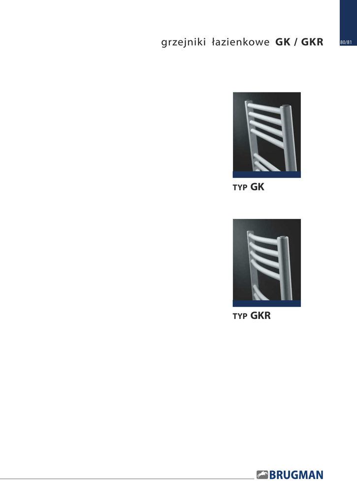 grzejniki łazienkowe GK / GKR TYP GK TYP GKR 80/81 grzejniki łazienkowe GK / GKR Klasyczny grzejnik drabinkowy. Dostępny w wersji prostej - GK i lekko wygiętej - GKR. 82/83 G r z e j n i k i Ł A Z I E N KO W E G K / G K R moc grzewcza [W] typ podłączenia boczne GK GKR podłączenia centralne GK GKR Typ szerokość L mm wysokość H mm pojemność l ilość rurek 450 450 450 450 450 727 952 1312 1672 1897 4,70 6,80 9,18 11,55 13,05 2,65 3,60 4,98 6,35 7,00 12 17 23 29 32 500 500 500 500 500 1,22 1,24 1,25 1,25 1,23 5,05 7,33 9,90 12,46 14,03 2,84 3,86 5,28 6,71 7,49 12 17 23 29 32 204 271 369 464 524 1,22 1,24 1,24 1,24 1,23 5,75 8,40 11,34 14,28 15,98 3,23 4,38 5,90 7,43 8,48 12 17 23 29 32 376 504 687 864 969 246 328 448 563 629 1,22 1,23 1,23 1,23 1,24 6,80 10,00 13,50 17,00 18,90 3,80 5,15 6,83 8,50 9,95 12 17 23 29 32 373 503 688 865 967 246 328 447 562 633 161 213 289 364 412 1,21 1,24 1,25 1,25 1,23 4,70 6,80 9,18 11,55 13,05 2,65 3,60 4,98 6,35 7,00 12 17 23 29 32 326 438 598 752 845 407 549 751 944 1057 267 358 488 614 692 175 232 316 397 451 1,22 1,24 1,25 1,25 1,23 5,05 7,33 9,90 12,46 14,03 2,84 3,86 5,28 6,71 7,49 12 17 23 29 32 727 952 1312 1672 1897 381 510 696 875 983 476 639 873 1097 1230 312 417 569 715 805 204 271 369 464 524 1,22 1,24 1,24 1,24 1,23 5,75 8,40 11,34 14,28 15,98 3,23 4,38 5,90 7,43 8,48 12 17 23 29 32 727 952 1312 1672 1897 459 615 839 1055 1185 573 770 1050 1320 1486 376 504 687 864 969 246 328 448 563 629 1,22 1,23 1,23 1,23 1,24 6,80 10,00 13,50 17,00 18,90 3,80 5,15 6,83 8,50 9,95 12 17 23 29 32 o 70/55/20oC 55/45/20oC 299 401 548 689 773 373 503 688 865 967 246 328 447 562 633 161 213 289 364 412 1,21 1,24 1,25 1,25 1,23 727 952 1312 1672 1897 326 438 598 752 845 407 549 751 944 1057 267 358 488 614 692 175 232 316 397 451 600 600 600 600 600 727 952 1312 1672 1897 381 510 696 875 983 476 639 873 1097 1230 312 417 569 715 805 750 750 750 750 750 727 952 1312 1672 1897 459 615 839 1055 1185 573 770 1050 1320 1486 450 450 450 450 450 727 952 1312 1672 1897 299 401 548 689 773 500 500 500 500 500 727 952 1312 1672 1897 600 600 600 600 600 750 750 750 750 750 Kolektory Wykonanie Możliwości montażowe Zawiesia Kolor Inne informacje Ciśnienie robocze Przyłącza Do wykorzystania Gwarancja ciężar kg drabinka prosta GK/ drabinka wygięta GKR 4 Rurki wykładnik n 90/70/20oC 75/65/20 C 5 4 5 poziome okrągłe, Ø 22mm Typy podłączeń pionowe, profil D 34 X 34mm spawanie laserowe (niewidoczne spoiny); podkład anaforetyczny, farba proszkowa epoksydowo-poliestrowa naścienny 1 8 0018 zawiesia ścienne w kolorze grzejnika biały RAL 9016 1 mm 1188 8 450/500/600/750 450/500/600/750 możliwość montażu grzałki elektrycznej 10 bar grzejniki łazienkowe GK/ GKR są produkowane z zestawem przyłączy 1/2” i mogą być przyłączane od dołu lub od góry; punkty zasilania 450/500/600/750 i powrotu zależą od zastosowanych zaworów przyłącze boczne lub centralne 10 lat na szczelność i malowanie proszkowe 450/500/600/750 H=727 450/500/600/750 GK 416/466/566/716 416/466/566/716 416/466/566/716 416/466/566/716 416/466/566/716 412/461/561/711 +/-2 412/461/561/711 +/-2 412/461/561/711 +/-2 412/461/561/711 +/-2 412/461/561/711 +/-2 446/495/595/745 +/-2 446/495/595/745 +/-2 446/495/595/745 +/-2 446/495/595/745 +/-2 446/495/595/745 +/-2 GKR 10 JAAR YEAR JAHRE ANS LAT 12 EN EURONORM 442 13 zgodnie z EN 442-1