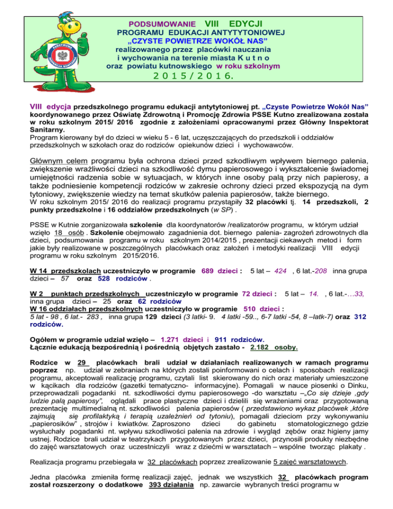 PODSUMOWANIE VIII EDYCJI PROGRAMU EDUKACJI ANTYTYTONIOWEJ „CZYSTE POWIETRZE WOKÓŁ NAS” realizowanego przez placówki nauczania i wychowania na terenie miasta K u t n o oraz powiatu kutnowskiego w roku szkolnym 2 0 1 5 / 2 0 1 6. VIII edycja przedszkolnego programu edukacji antytytoniowej pt. „Czyste Powietrze Wokół Nas” koordynowanego przez Oświatę Zdrowotną i Promocję Zdrowia PSSE Kutno zrealizowana została w roku szkolnym 2015/ 2016 zgodnie z założeniami opracowanymi przez Główny Inspektorat Sanitarny. Program kierowany był do dzieci w wieku 5 - 6 lat, uczęszczających do przedszkoli i oddziałów przedszkolnych w szkołach oraz do rodziców opiekunów dzieci i wychowawców. Głównym celem programu była ochrona dzieci przed szkodliwym wpływem biernego palenia, zwiększenie wrażliwości dzieci na szkodliwość dymu papierosowego i wykształcenie świadomej umiejętności radzenia sobie w sytuacjach, w których inne osoby palą przy nich papierosy, a także podniesienie kompetencji rodziców w zakresie ochrony dzieci przed ekspozycją na dym tytoniowy, zwiększenie wiedzy na temat skutków palenia papierosów, także biernego. W roku szkolnym 2015/ 2016 do realizacji programu przystąpiły 32 placówki tj. 14 przedszkoli, 2 punkty przedszkolne i 16 oddziałów przedszkolnych (w SP) . PSSE w Kutnie zorganizowała szkolenie dla koordynatorów /realizatorów programu, w którym udział wzięło 18 osób . Szkolenie obejmowało zagadnienia dot. biernego palenia- zagrożeń zdrowotnych dla dzieci, podsumowania programu w roku szkolnym 2014/2015 , prezentacji ciekawych metod i form jakie były realizowane w poszczególnych placówkach oraz założeń i metodyki realizacji VIII edycji programu w roku szkolnym 2015/2016. W 14 przedszkolach uczestniczyło w programie 689 dzieci : dzieci – 57 oraz 528 rodziców . 5 lat – 424 , 6 lat.-208 inna grupa W 2 punktach przedszkolnych uczestniczyło w programie 72 dzieci : 5 lat – 14. , 6 lat.-…33, inna grupa dzieci – 25 oraz 62 rodziców W 16 oddziałach przedszkolnych uczestniczyło w programie 510 dzieci : 5 lat - 98 , 6 lat.- 283 , inna grupa 129 dzieci (3 latki- 9. 4 latki -59.., 6-7 latki -54, 8 –latk-7) oraz 312 rodziców. Ogółem w programie udział wzięło – 1.271 dzieci i 911 rodziców. Łącznie edukacją bezpośrednią i pośrednią objętych zastało - 2.182 osoby. Rodzice w 29 placówkach brali udział w działaniach realizowanych w ramach programu poprzez np. udział w zebraniach na których zostali poinformowani o celach i sposobach realizacji programu, akceptowali realizację programu, czytali list skierowany do nich oraz materiały umieszczone w kącikach dla rodziców (gazetki tematyczno- informacyjne). Pomagali w nauce piosenki o Dinku, przeprowadzali pogadanki nt. szkodliwości dymu papierosowego -do warsztatu –„Co się dzieje ,gdy ludzie palą papierosy”, oglądali prace plastyczne dzieci i dzielili się wrażeniami oraz przygotowaną prezentację multimedialną nt. szkodliwości palenia papierosów ( przedstawiono wykaz placówek ,które zajmują się profilaktyką i terapią uzależnień od tytoniu), pomagali dzieciom przy wykonywaniu „papierosików” , strojów i kwiatków. Zaproszono dzieci do gabinetu stomatologicznego gdzie wysłuchały pogadanki nt. wpływu szkodliwości palenia na zdrowie i wygląd zębów oraz higieny jamy ustnej. Rodzice brali udział w teatrzykach przygotowanych przez dzieci, przynosili produkty niezbędne do zajęć warsztatowych oraz uczestniczyli wraz z dziećmi w warsztatach – wspólne tworząc plakaty . Realizacja programu przebiegała w 32 placówkach poprzez zrealizowanie 5 zajęć warsztatowych. Jedna placówka zmieniła formę realizacji zajęć, jednak we wszystkich 32 placówkach program został rozszerzony o dodatkowe 393 działania np. zawarcie wybranych treści programu w pytaniach konkursowych przedszkolnego Turnieju Wiedzy „Ekologią na Ty”, sadzenie drzewek, spacer połączony z segregacją odpadów- zabawa dydaktyczna ”Moje ciało tańczy”, wykonywanie stroi ekologicznych na Dzień Ziemi , tablic edukacyjnych dla rodziców, pogadanek przeprowadzanych wyłącznie przez koordynatorów i realizatorów programu, spotkania z rodzicami (przed ,w trakcie i po realizacji programu), pokaz ilustracji przedstawiających skutki palenia tytoniu , wycieczka do Ośrodka Zdrowia , wykonywanie „papierosików ” dużych i wielkoformatowych, zabawy badawcze „Szukamy powietrza”- umieszczenie informacji oraz zdjęć z realizacji programu na stronie internetowej przedszkola, wykonanie postaci Dinka z odcisku dłoni w farbie oraz z masy solnej, wykonywanie soków, surówek , kompotu i kanapek, organizacja akcji „Mikołaje nie palą”, wycieczka do Straży Pożarnej, lepienie Dinusiów z plasteliny, wykonywanie prac plastycznych farbami i wydzierankami, warsztaty mydlarskie oraz udział w Dniu Wiosny , wykonywanie znaczków i dyplomów dla rodziców, zajęcia kulinarne: „Zamiast papierosa Dinek proponuje…”, „Zdrowy tryb życia”, wycinanie i naklejanie na papierowy talerzyk pokarmów mających wartości odżywcze dla organizmu, „Recyklingowa orkiestra”wygrywanie rytmów na pojemnikach z plastiku, papieru i puszkach, wykonywanie ekologicznych strojów oraz organizacja pokazu mody ekologicznej. W ramach realizacji programu powiatowy koordynator przeprowadziła 1 pogadankę oraz przekazała 28 informacji ( wraz ze zdjęciami) do lokalnych mass- mediów. Opublikowano na stronach internetowych – 15 artykułów, które czytało ok. 1.720 osób. Podsumowanie programu i wnioski : Wg opinii szkolnych i przedszkolnych koordynatorów program „Czyste powietrze wokół nas” cieszył się ogromnym zainteresowaniem wśród dzieci, które chętnie uczestniczyły w zajęciach, łatwo i szybko przyswajały informacje nt. problemu dymu tytoniowego oraz jak unikać przebywania w pomieszczeniach zadymionych . Program spełniał ważną rolę w 