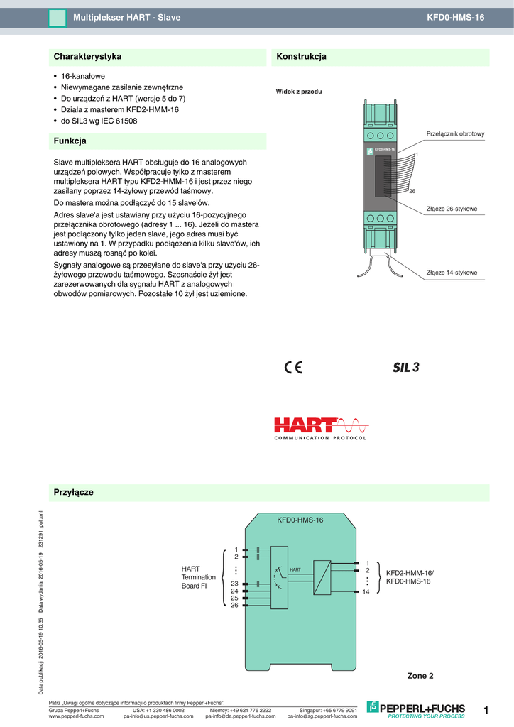 Multiplekser HART - Slave KFD0-HMS-16 Konstrukcja Charakterystyka • • • • • 16-kanałowe Niewymagane zasilanie zewnętrzne Do urządzeń z HART (wersje 5 do 7) Działa z masterem KFD2-HMM-16 do SIL3 wg IEC 61508 Widok z przodu Przełącznik obrotowy Funkcja KFD0-HMS-16 Slave multipleksera HART obsługuje do 16 analogowych urządzeń polowych. Współpracuje tylko z masterem multipleksera HART typu KFD2-HMM-16 i jest przez niego zasilany poprzez 14-żyłowy przewód taśmowy. Do mastera można podłączyć do 15 slave'ów. Złącze 26-stykowe Adres slave'a jest ustawiany przy użyciu 16-pozycyjnego przełącznika obrotowego (adresy 1 ... 16). Jeżeli do mastera jest podłączony tylko jeden slave, jego adres musi być ustawiony na 1. W przypadku podłączenia kilku slave'ów, ich adresy muszą rosnąć po kolei. Sygnały analogowe są przesyłane do slave'a przy użyciu 26żyłowego przewodu taśmowego. Szesnaście żył jest zarezerwowanych dla sygnału HART z analogowych obwodów pomiarowych. Pozostałe 10 żył jest uziemione. Złącze 14-stykowe 3 KFD0-HMS-16 1 2 HART 1 2 ... ... 23 24 25 26 KFD2-HMM-16/ KFD0-HMS-16 14 Data publikacji 2016-05-19 10:35 HART Termination Board FI ... Data wydania 2016-05-19 231291_pol.xml Przyłącze Zone 2 Patrz „Uwagi ogólne dotyczące informacji o produktach firmy Pepperl+Fuchs”. Grupa Pepperl+Fuchs USA: +1 330 486 0002 Niemcy: +49 621 776 2222 www.pepperl-fuchs.com [email protected] [email protected] Singapur: +65 6779 9091 [email protected] 1 Dane techniczne KFD0-HMS-16 Zasilanie Przyłącze 14-żyłowym przewodem taśmowym z mastera KFD2-HMM-16 Kanały sygnału HART (nieiskrobezpieczne) Zgodnożć Wejście urządzeń polowych HART (wersje od 5 do 7) Przyłącze 26-żyłowy kabel płaski do połączeń analogowych 14-żyłowy kabel płaski do połączenia master/slave pomiędzy KFD2-HMM-16 i KFD0-HMS-16 Prąd upływowy < 3 µA przy -20 ... +85°C (-4 ... 185 °F) Rezystor terminujący zewnętrzny 230 ... 500 Ω standardowo (nawet do 1000 Ω) Napięcie wyjżciowe ≥ 400 mV ss (z podaną wyżej opornością obciążającą) Opornożć wyjżciowa 100 Ω lub mniejsze, połączone pojemnościowo impedancja wejściowa zgodnie z konwencją HART zakres napięcia wejściowego 0,08 ... 4 V ss ; typ. ± 5,2 V lokalnie Zgodność z dyrektywami Kompatybilność elektromagnetyczna Dyrektywa 2014/30/UE EN 61326-1:2013 (lokalizacja ośrodków przemysłowych) Zgodnożć Stopień ochrony IEC 60529:2001 Warunki otoczenia Temperatura otoczenia -20 ... 60 °C (-4 ... 140 °F) Specyfikacja mechaniczna Stopień ochrony IP 20 Masa ok. 100 g Wymiary 20 x 93 x 115 mm (0,8 x 3,7 x 4,5 cala) , typ obudowy B1 Montaż montaż na szynie znormalizowanej 35 mm wg EN 60715:2001 Dane dotyczące stosowania w obszarach Ex Deklaracja zgodności PF 07 CERT 1143 X Grupa, kategoria, typ ochrony, klasa temperaturowa ¬ II 3G Ex nA IIC T4 Gc Zgodność z dyrektywami Dyrektywa 2014/34/UE EN 60079-0:2012+A11:2013 , EN 60079-15:2010 Informacje ogólne Informacja uzupełniająca Stosownie do wymagań należy przestrzegać informacji na temat zgodności, deklaracji zgodności, atestów zgodności i instrukcji. Aby uzyskać więcej informacji, zob. www.pepperl-fuchs.com. Wymiary Wysuwane zatrzaski Data publikacji 2016-05-19 10:35 Data wydania 2016-05-19 231291_pol.xml Adres podrzędny Patrz „Uwagi ogólne dotyczące informacji o produktach firmy Pepperl+Fuchs”. Grupa Pepperl+Fuchs USA: +1 330 486 0002 Niemcy: +49 621 776 2222 www.pepperl-fuchs.com [email protected] [email protected] Singapur: +65 6779 9091 [email protected] 2 Dane techniczne KFD0-HMS-16 Akcesoria Kabel połączeniowy K-HM14 K-HM26 Kabel połączeniowy modułu master multipleksera z modułem slave multipleksera, długość standardowa (0,45 m) lub niestandardowa (do 8 m) Kabel połączeniowy modułu master multipleksera lub modułu slave multipleksera z płytą bazową, długość standardowa (1 m) lub niestandardowa (do 8 m) Płyta bazowa Płyta połączeniowa do multipleksera HART systemu K, 16 kanałów, interfejs do połączeń szeregowych, zintegrowany, przełączany rezystor 220 Ω Data publikacji 2016-05-19 10:35 Data wydania 2016-05-19 231291_pol.xml FI-PFH-NS0137-R Patrz „Uwagi ogólne dotyczące informacji o produktach firmy Pepperl+Fuchs”. Grupa Pepperl+Fuchs USA: +1 330 486 0002 Niemcy: +49 621 776 2222 www.pepperl-fuchs.com [email protected] [email protected] Singapur: +65 6779 9091 [email protected] 3