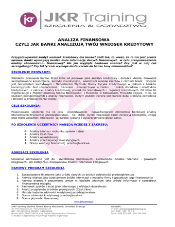 ANALIZA FINANSOWA CZYLI JAK BANKI ANALIZUJĄ TWÓJ WNIOSEK KREDYTOWY Przygotowywałeś kiedyś wniosek kredytowy dla banku? Jeśli tak, to wiesz, że to nie jest prosta sprawa. Banki wymagają bardzo dużo informacji, danych finansowych w celu przeprowadzenia analizy ekonomiczno- finansowej? Ale jak wygląda bankowa analiza? Czy jest w niej coś szczególnego? Czy faktycznie wymaga dostarczenia do banku tony dokumentów? SZKOLENIE PROWADZI: Wieloletni pracownik banku. Przez kilka lat pracował jako analityk kredytowy i doradca klienta. Prowadził skomplikowane konsorcjalne kredyty inwestycyjne, analizował wnioski klientów z różnych branż . Obecnie jest decydentem kredytowym i Menedżerem Wydziału Oceny Ryzyka Kredytowego w jednym z banków komercyjnych. Jest równocześnie trenerem wewnętrznym w banku i szkoli doradców i analityków kredytowych z zakresu analizy kredytowej, produktów kredytowych i regulacji kredytowych. Od kilku lat współpracuje z Międzynarodową Szkoła Bankowości i Finansów w Katowicach. Prowadzi zajęcia m.in. na studiach podyplomowych z analizy finansowej. Dużym atutem trenera jest bardzo duża praktyka zawodowa i łatwość w przekazywaniu wiedzy. CELE SZKOLENIA: Proponowane szkolenie ma na celu przedstawienie najważniejszych elementów bankowej analizy ekonomiczno-finansowej przedsiębiorstwa, na które wyniki finansowe banki zwracają szczególną uwagę oraz które wskaźniki finansowe są bardzo lubiane i wykorzystywane przez banki. PO SZKOLENIU UCZESTNICY NABĘDĄ WIEDZĘ Z ZAKRESU: Analizy bilansu i rachunku zysków i strat Analizy Cash flow Analizy wskaźnikowej Analizy przedsięwzięć inwestycyjnych Oceny kondycji finansowej przedsiębiorstwa. ADRESACI SZKOLENIA Szkolenie adresowane jest do dyrektorów finansowych, kierowników działów finansów , głównych księgowych i ich zastępców, pracowników działów finansowo-księgowych RAMOWY PROGRAM SZKOLENIA 1. Sprawozdanie finansowe jako źródło danych do analizy działalności przedsiębiorstwa 2. Aktywa bilansu jako podstawowe źródło informacji o majątku firmy i sposobach jego finansowania 3. Pasywa bilansu i zestawienie zmian w kapitale własnym jako źródła informacji o sposobach finansowania majątku 4. Rachunek zysków i strat jako informacje o efektach działalności 5. Analiz przepływów środków pieniężnych (Cash Flow) 6. Metody badania zdolności kredytowej przedsiębiorstwa 7. Ocena zdolności kredytowej przedsiębiorstwa 8. Ocena płynności finansowej www.jkrtraining.pl JKR Training Spółka Jawna Iwona Mazelanik, Jarosław Drzazga 40-750 Katowice, ul. Pierwiosnków 24 NIP: 6312572040, REGON: 241019056 Numer KRS: 0000314432 przy Sądzie Rejonowym w Gliwicach X Wydział Gospodarczy Krajowego Rejestru Sądowego Kontakt: e-mail: [email protected] fax: 032/ 380 71 13 kom.: 608 052 658, 602 296 887 9. Analiza struktury majątkowej i źródeł finansowania 10. Analiza zadłużenia i zdolności firmy do spłaty długu 11. Analiza wskaźnikowa 12. Ocena sprawności zarządzania kapitałem obrotowym 13. Ocena przyszłych przedsięwzięć inwestycyjnych 14. Ocena sytuacji ekonomiczno – finansowej 15. Ocena ryzyka branżowego przedsiębiorstwa 16. Czynniki makro kształtujące ocenę przedsiębiorstwa METODY SZKOLENIOWE: Wykład, pogadanka, warsztaty MIEJSCE SZKOLENIA: Do uzgodnienia TERMIN SZKOLENIA: Do uzgodnienia CENA SZKOLENIA : 590 zł netto / os. Dla szkoleń zamkniętych – Do uzgodnienia Cena obejmuje: uczestnictwo w zajęciach, materiały szkoleniowe, przerwy kawowe, zaświadczenie ukończenia szkolenia, konsultacje po szkoleniu. Warunki uczestnictwa Podstawą wzięcia udziału w szkoleniu jest przesłanie skanu karty zgłoszenia na adres mailowy: [email protected] lub faksem na nr: 032/ 380 71 13 oraz dokonanie wpłaty nie później niż 7 dni przed rozpoczęciem szkolenia przelewem na konto bankowe: Credit Agricole 97 1940 1076 3085 3463 0000 0000 Prosimy o dokonywanie wpłat dopiero po otrzymaniu potwierdzenia uczestnictwa. Informacja o zakwalifikowaniu na szkolenie zostanie przekazana drogą elektroniczną lub telefonicznie. Warunki rezygnacji Rezygnacja ze szkolenia w terminie krótszym niż 7 dni roboczych przed terminem rozpoczęcia szkolenia, wiąże się z koniecznością pokrycia kosztów organizacyjnych w wysokości 100%. Nieobecność na szkoleniu nie zwalnia z konieczności dokonania opłaty za udział. www.jkrtraining.pl JKR Training Spółka Jawna Iwona Mazelanik, Jarosław Drzazga 40-750 Katowice, ul. Pierwiosnków 24 NIP: 6312572040, REGON: 241019056 Numer KRS: 0000314432 przy Sądzie Rejonowym w Gliwicach X Wydział Gospodarczy Krajowego Rejestru Sądowego Kontakt: e-mail: [email protected] fax: 032/ 380 71 13 kom.: 608 052 658, 602 296 887