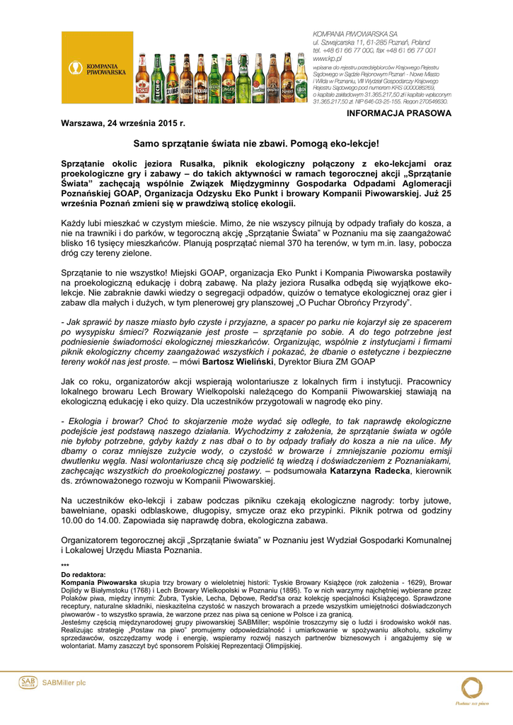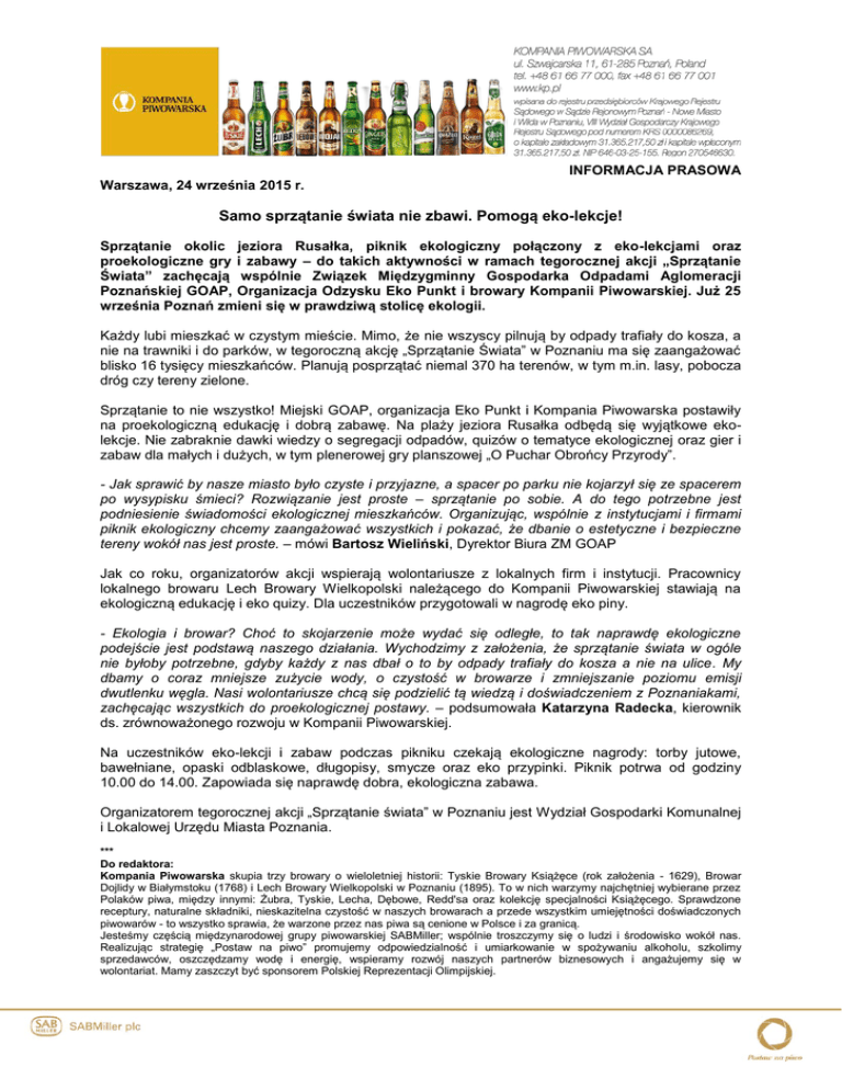 INFORMACJA PRASOWA Warszawa, 24 września 2015 r. Samo sprzątanie świata nie zbawi. Pomogą eko-lekcje! Sprzątanie okolic jeziora Rusałka, piknik ekologiczny połączony z eko-lekcjami oraz proekologiczne gry i zabawy – do takich aktywności w ramach tegorocznej akcji „Sprzątanie Świata” zachęcają wspólnie Związek Międzygminny Gospodarka Odpadami Aglomeracji Poznańskiej GOAP, Organizacja Odzysku Eko Punkt i browary Kompanii Piwowarskiej. Już 25 września Poznań zmieni się w prawdziwą stolicę ekologii. Każdy lubi mieszkać w czystym mieście. Mimo, że nie wszyscy pilnują by odpady trafiały do kosza, a nie na trawniki i do parków, w tegoroczną akcję „Sprzątanie Świata” w Poznaniu ma się zaangażować blisko 16 tysięcy mieszkańców. Planują posprzątać niemal 370 ha terenów, w tym m.in. lasy, pobocza dróg czy tereny zielone. Sprzątanie to nie wszystko! Miejski GOAP, organizacja Eko Punkt i Kompania Piwowarska postawiły na proekologiczną edukację i dobrą zabawę. Na plaży jeziora Rusałka odbędą się wyjątkowe ekolekcje. Nie zabraknie dawki wiedzy o segregacji odpadów, quizów o tematyce ekologicznej oraz gier i zabaw dla małych i dużych, w tym plenerowej gry planszowej „O Puchar Obrońcy Przyrody”. - Jak sprawić by nasze miasto było czyste i przyjazne, a spacer po parku nie kojarzył się ze spacerem po wysypisku śmieci? Rozwiązanie jest proste – sprzątanie po sobie. A do tego potrzebne jest podniesienie świadomości ekologicznej mieszkańców. Organizując, wspólnie z instytucjami i firmami piknik ekologiczny chcemy zaangażować wszystkich i pokazać, że dbanie o estetyczne i bezpieczne tereny wokół nas jest proste. – mówi Bartosz Wieliński, Dyrektor Biura ZM GOAP Jak co roku, organizatorów akcji wspierają wolontariusze z lokalnych firm i instytucji. Pracownicy lokalnego browaru Lech Browary Wielkopolski należącego do Kompanii Piwowarskiej stawiają na ekologiczną edukację i eko quizy. Dla uczestników przygotowali w nagrodę eko piny. - Ekologia i browar? Choć to skojarzenie może wydać się odległe, to tak naprawdę ekologiczne podejście jest podstawą naszego działania. Wychodzimy z założenia, że sprzątanie świata w ogóle nie byłoby potrzebne, gdyby każdy z nas dbał o to by odpady trafiały do kosza a nie na ulice. My dbamy o coraz mniejsze zużycie wody, o czystość w browarze i zmniejszanie poziomu emisji dwutlenku węgla. Nasi wolontariusze chcą się podzielić tą wiedzą i doświadczeniem z Poznaniakami, zachęcając wszystkich do proekologicznej postawy. – podsumowała Katarzyna Radecka, kierownik ds. zrównoważonego rozwoju w Kompanii Piwowarskiej. Na uczestników eko-lekcji i zabaw podczas pikniku czekają ekologiczne nagrody: torby jutowe, bawełniane, opaski odblaskowe, długopisy, smycze oraz eko przypinki. Piknik potrwa od godziny 10.00 do 14.00. Zapowiada się naprawdę dobra, ekologiczna zabawa. Organizatorem tegorocznej akcji „Sprzątanie świata” w Poznaniu jest Wydział Gospodarki Komunalnej i Lokalowej Urzędu Miasta Poznania. *** Do redaktora: Kompania Piwowarska skupia trzy browary o wieloletniej historii: Tyskie Browary Książęce (rok założenia - 1629), Browar Dojlidy w Białymstoku (1768) i Lech Browary Wielkopolski w Poznaniu (1895). To w nich warzymy najchętniej wybierane przez Polaków piwa, między innymi: Żubra, Tyskie, Lecha, Dębowe, Redd'sa oraz kolekcję specjalności Książęcego. Sprawdzone receptury, naturalne składniki, nieskazitelna czystość w naszych browarach a przede wszystkim umiejętności doświadczonych piwowarów - to wszystko sprawia, że warzone przez nas piwa są cenione w Polsce i za granicą. Jesteśmy częścią międzynarodowej grupy piwowarskiej SABMiller; wspólnie troszczymy się o ludzi i środowisko wokół nas. Realizując strategię „Postaw na piwo” promujemy odpowiedzialność i umiarkowanie w spożywaniu alkoholu, szkolimy sprzedawców, oszczędzamy wodę i energię, wspieramy rozwój naszych partnerów biznesowych i angażujemy się w wolontariat. Mamy zaszczyt być sponsorem Polskiej Reprezentacji Olimpijskiej. Dodatkowych informacji udzielają: Joanna Kwiatkowska Media Relations Manager Kompania Piwowarska ul. Emilii Plater 53, 00-113 Warszawa tel. kom. + 48 695 797 890 [email protected] Marta Andreasik Specjalista ds. Public Relations Kompania Piwowarska ul. Emilii Plater 53, 00-113 Warszawa tel. kom. + 48 695 850 168 [email protected]