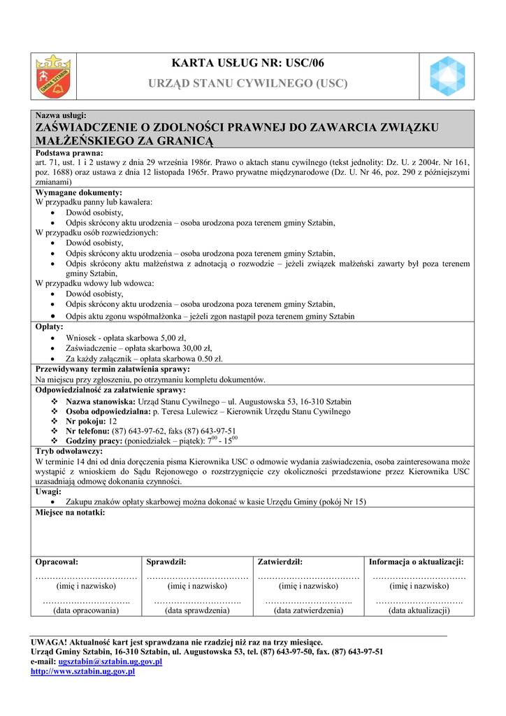 KARTA USŁUG NR: USC/06 URZĄD STANU CYWILNEGO (USC) Nazwa usługi: ZAŚWIADCZENIE O ZDOLNOŚCI PRAWNEJ DO ZAWARCIA ZWIĄZKU MAŁŻEŃSKIEGO ZA GRANICĄ Podstawa prawna: art. 71, ust. 1 i 2 ustawy z dnia 29 września 1986r. Prawo o aktach stanu cywilnego (tekst jednolity: Dz. U. z 2004r. Nr 161, poz. 1688) oraz ustawa z dnia 12 listopada 1965r. Prawo prywatne międzynarodowe (Dz. U. Nr 46, poz. 290 z późniejszymi zmianami) Wymagane dokumenty: W przypadku panny lub kawalera: • Dowód osobisty, • Odpis skrócony aktu urodzenia – osoba urodzona poza terenem gminy Sztabin, W przypadku osób rozwiedzionych: • Dowód osobisty, • Odpis skrócony aktu urodzenia – osoba urodzona poza terenem gminy Sztabin, • Odpis skrócony aktu małżeństwa z adnotacją o rozwodzie – jeżeli związek małżeński zawarty był poza terenem gminy Sztabin, W przypadku wdowy lub wdowca: • Dowód osobisty, • Odpis skrócony aktu urodzenia – osoba urodzona poza terenem gminy Sztabin, • Odpis aktu zgonu współmałżonka – jeżeli zgon nastąpił poza terenem gminy Sztabin Opłaty: • Wniosek - opłata skarbowa 5,00 zł, • Zaświadczenie – opłata skarbowa 30,00 zł, • Za każdy załącznik – opłata skarbowa 0.50 zł. Przewidywany termin załatwienia sprawy: Na miejscu przy zgłoszeniu, po otrzymaniu kompletu dokumentów. Odpowiedzialność za załatwienie sprawy: v Nazwa stanowiska: Urząd Stanu Cywilnego – ul. Augustowska 53, 16-310 Sztabin v Osoba odpowiedzialna: p. Teresa Lulewicz – Kierownik Urzędu Stanu Cywilnego v Nr pokoju: 12 v Nr telefonu: (87) 643-97-62, faks (87) 643-97-51 v Godziny pracy: (poniedziałek – piątek): 700 - 1500 Tryb odwoławczy: W terminie 14 dni od dnia doręczenia pisma Kierownika USC o odmowie wydania zaświadczenia, osoba zainteresowana może wystąpić z wnioskiem do Sądu Rejonowego o rozstrzygnięcie czy okoliczności przedstawione przez Kierownika USC uzasadniają odmowę dokonania czynności. Uwagi: • Zakupu znaków opłaty skarbowej można dokonać w kasie Urzędu Gminy (pokój Nr 15) Miejsce na notatki: Opracował: Sprawdził: Zatwierdził: ……………………………… (imię i nazwisko) ……………………………… (imię i nazwisko) ……………………………… (imię i nazwisko) …………………………… (imię i nazwisko) …………………………. (data opracowania) …………………………. (data sprawdzenia) …………………………. (data zatwierdzenia) …………………………. (data aktualizacji) Informacja o aktualizacji: UWAGA! Aktualność kart jest sprawdzana nie rzadziej niż raz na trzy miesiące. Urząd Gminy Sztabin, 16-310 Sztabin, ul. Augustowska 53, tel. (87) 643-97-50, fax. (87) 643-97-51 e-mail: [email protected] http://www.sztabin.ug.gov.pl