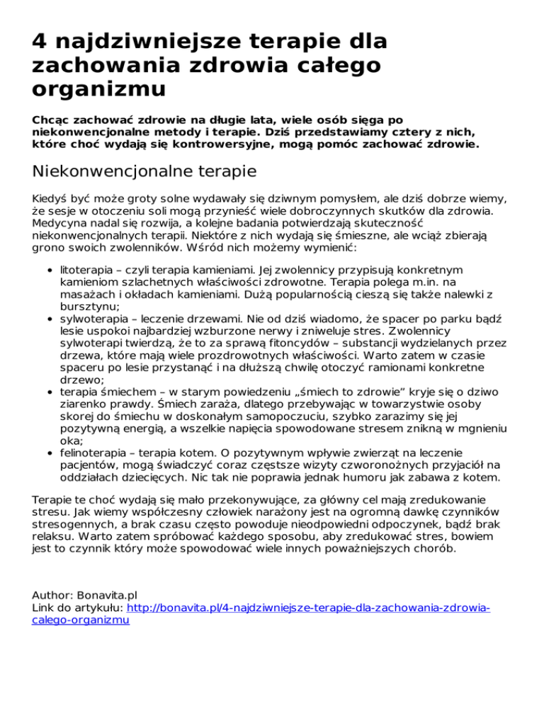 4 najdziwniejsze terapie dla zachowania zdrowia całego organizmu Chcąc zachować zdrowie na długie lata, wiele osób sięga po niekonwencjonalne metody i terapie. Dziś przedstawiamy cztery z nich, które choć wydają się kontrowersyjne, mogą pomóc zachować zdrowie. Niekonwencjonalne terapie Kiedyś być może groty solne wydawały się dziwnym pomysłem, ale dziś dobrze wiemy, że sesje w otoczeniu soli mogą przynieść wiele dobroczynnych skutków dla zdrowia. Medycyna nadal się rozwija, a kolejne badania potwierdzają skuteczność niekonwencjonalnych terapii. Niektóre z nich wydają się śmieszne, ale wciąż zbierają grono swoich zwolenników. Wśród nich możemy wymienić: litoterapia – czyli terapia kamieniami. Jej zwolennicy przypisują konkretnym kamieniom szlachetnych właściwości zdrowotne. Terapia polega m.in. na masażach i okładach kamieniami. Dużą popularnością cieszą się także nalewki z bursztynu; sylwoterapia – leczenie drzewami. Nie od dziś wiadomo, że spacer po parku bądź lesie uspokoi najbardziej wzburzone nerwy i zniweluje stres. Zwolennicy sylwoterapi twierdzą, że to za sprawą fitoncydów – substancji wydzielanych przez drzewa, które mają wiele prozdrowotnych właściwości. Warto zatem w czasie spaceru po lesie przystanąć i na dłuższą chwilę otoczyć ramionami konkretne drzewo; terapia śmiechem – w starym powiedzeniu „śmiech to zdrowie” kryje się o dziwo ziarenko prawdy. Śmiech zaraża, dlatego przebywając w towarzystwie osoby skorej do śmiechu w doskonałym samopoczuciu, szybko zarazimy się jej pozytywną energią, a wszelkie napięcia spowodowane stresem znikną w mgnieniu oka; felinoterapia – terapia kotem. O pozytywnym wpływie zwierząt na leczenie pacjentów, mogą świadczyć coraz częstsze wizyty czworonożnych przyjaciół na oddziałach dziecięcych. Nic tak nie poprawia jednak humoru jak zabawa z kotem. Terapie te choć wydają się mało przekonywujące, za główny cel mają zredukowanie stresu. Jak wiemy współczesny człowiek narażony jest na ogromną dawkę czynników stresogennych, a brak czasu często powoduje nieodpowiedni odpoczynek, bądź brak relaksu. Warto zatem spróbować każdego sposobu, aby zredukować stres, bowiem jest to czynnik który może spowodować wiele innych poważniejszych chorób. Author: Bonavita.pl Link do artykułu: http://bonavita.pl/4-najdziwniejsze-terapie-dla-zachowania-zdrowiacalego-organizmu