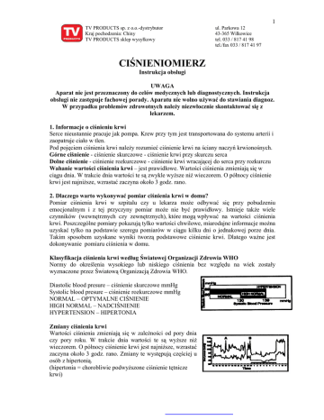 1 TV PRODUCTS sp. z o.o.-dystrybutor Kraj pochodzenia: Chiny TV PRODUCTS sklep wysyłkowy ul. Parkowa 12 43-365 Wilkowice tel. 033 / 817 41 98 tel./fax 033 / 817 41 97 CIŚNIENIOMIERZ Instrukcja obsługi UWAGA Aparat nie jest przeznaczony do celów medycznych lub diagnostycznych. Instrukcja obsługi nie zastępuje fachowej porady. Aparatu nie wolno używać do stawiania diagnoz. W przypadku problemów zdrowotnych należy niezwłocznie skontaktować się z lekarzem. 1. Informacje o ciśnieniu krwi Serce nieustannie pracuje jak pompa. Krew przy tym jest transportowana do systemu arterii i zaopatruje ciało w tlen. Pod pojęciem ciśnienia krwi należy rozumieć ciśnienie krwi na ściany naczyń krwionośnych. Górne ciśnienie - ciśnienie skurczowe - ciśnienie krwi przy skurczu serca Dolne ciśnienie - ciśnienie rozkurczowe - ciśnienie krwi wracającej do serca przy rozkurczu Wahanie wartości ciśnienia krwi – jest prawidłowe. Wartości ciśnienia zmieniają się w ciągu dnia. W trakcie dnia wartości te są zwykle wyższe niż wieczorem. O północy ciśnienie krwi jest najniższe, wzrastać zaczyna około 3 godz. rano. 2. Dlaczego warto wykonywać pomiar ciśnienia krwi w domu? Pomiar ciśnienia krwi w szpitalu czy u lekarza może odbywać się przy pobudzeniu emocjonalnym i z tej przyczyny pomiar może nie być prawidłowy. Istnieje także wiele czynników (wewnętrznych czy zewnętrznych), które mogą wpływać na wartości ciśnienia krwi. Poszczególne pomiary pokazują tylko wartości chwilowe, miarodajne informacje można uzyskać tylko na podstawie szeregu pomiarów w ciągu kilku dni o jednakowej porze dnia. Takim sposobem uzyskane wyniki tworzą podstawowe ciśnienie krwi. Dlatego ważne jest dokonywanie pomiaru ciśnienia w domu. Klasyfikacja ciśnienia krwi według Światowej Organizacji Zdrowia WHO Normy do określenia wysokiego lub niskiego ciśnienia bez względu na wiek zostały wyznaczone przez Światową Organizacją Zdrowia WHO. Diastolic blood presure – ciśnienie skurczowe mmHg Systolic blood presure – ciśnienie rozkurczowe mmHg NORMAL – OPTYMALNE CIŚNIENIE HIGH NORMAL – NADCIŚNIENIE HYPERTENSION – HIPERTONIA Zmiany ciśnienia krwi Wartości ciśnienia zmieniają się w zależności od pory dnia czy pory roku. W trakcie dnia wartości te są wyższe niż wieczorem. O północy ciśnienie krwi jest najniższe, wzrastać zaczyna około 3 godz. rano. Zmiany te występują częściej u osób z hipertonią. (hipertonia = chorobliwie podwyższone ciśnienie tętnicze krwi) Model HL888AA 2 Poniższy wykres przedstawia wahanie wartości ciśnienia krwi w przeciągu całego dnia. Pomiary są wykonywane co 5 minut. Gruba linia oznacza sen, podwyższenie ciśnienia krwi o 4 godzinie po południu (punkt A) i o 12 godzinie po południu (punkt B) odpowiada zwiększonemu wysiłkowi. Blood pressure mmHg – Ciśnienie krwi mmHg Time – czas 3. Ważne uwagi przed uruchomieniem aparatu • 5-10 minut przed pomiarem ciśnienia zrelaksować się. • Usiąść i podczas procesu mierzenia nie poruszać się i nie rozmawiać. • Mankiet umocować na rękę na poziomie serca. Model HL-168 • Jeśli nie można podczas mierzenia siedzieć, położyć się na plecach i ułożyć rękę dłonią do góry. Mankiet umocować na poziomie serca. • Wartości pomiarów nieustannie się zmieniają. Nieznaczne zmiany warunków wewnętrznych czy zewnętrznych (jedzenie, picie, rozmawianie, podniecenie, przyśpieszony oddech, warunki klimatyczne itd.) prowadzą do kołysania ciśnienia krwi. • Mierzenie powinno się wykonywać zawsze na tej samej ręce (zazwyczaj lewej). Różnica ciśnienia w prawej i lewej ręce może wynosić nawet 40 mmHg. • • • • W przerwie między pomiarami powinno się odczekać co najmniej 3 minuty, w przeciwnym razie wartości pomiarów mogą być niedokładne. Wybór odpowiedniej wielkości mankietu jest bardzo ważny dla uzyskania bezbłędnych wyników pomiaru. Mankiet, który jest wyposażeniem urządzenia, jest przeznaczony dla osób dorosłych. Aparat nie jest odpowiedni dla osób cierpiących na zaburzenia rytmu serca (arytmia). Aparatu nie powinno się używać w pobliżu silnego pola elektromagnetycznego (telefon komórkowy, kuchenka mikrofalowa itd.). Obr. 4 3 • Jeśli aparatu nie używa się przez dłuższy okres czasu należy wyjąć baterie. 4. Opis aparatu (Obr. 3) 1. WYŚWIETLACZ LCD 2. KONEKTOR 3. MANKIET 4. GNIAZDKO 5. START/STOP 6. RECALL – WYWOŁANIE PAMIĘCI 7. SET– REGULACJA 8. MODE – WYBÓR FUNKCJI 9. BATERIE (nie wchodzą w skład kompletu) 10. PRZENOŚNE PUDEŁKO 5. Wymiana baterii • Otworzyć pokrywę komory na baterie w spodzie aparatu i przesunąć ją w kierunku wskazanym strzałką. • Włożyć 4 sztuki baterii 1,5 V wielkości AA. Sprawdzić biegunowość. • Założyć pokrywę. Jeżeli na wyświetlaczu pojawi się symbol baterii należy baterie natychmiast wymienić na nowe. Akumulatory 1,2 V są niewskazane z powodu niskiego napięcia. Przy niszczeniu zużytych baterii lub całego aparatu, postępować według obowiązujących przepisów dot. neutralizacji tego typu odpadów. Model HL888AA Model HL-168 6. Założenie mankietu ciśnieniomierza • Założyć mankiet na rękę. Dolna krawędź mankietu powinna znajdować się 1-2 cm powyżej łokcia. • Rękę położyć dłonią do góry na stole razem z gumowym wężem. • Pomiaru dokonywać zawsze na tej samej ręce. • Pomiaru dokonywać na gołej ręce, podniesiony rękaw nie powinien zatrzymywać krążenia krwi (nie może być ciasny). • W przypadku pobrudzenia mankietu, należy odłączyć go od aparatu, wyprać ręcznie w wodzie z dodatkiem mydła o pH neutralnym, wypłukać w zimnej wodzie i zostawić aż do całkowitego wyschnięcia. Dbać o to, by do węża nie dostała się woda. Mankietu nigdy nie prasować. • Ramię powinno być ciasno objęte mankietem. • Mankietu nie nakładać zbyt ciasno lub zbyt luźno, przy prawidłow