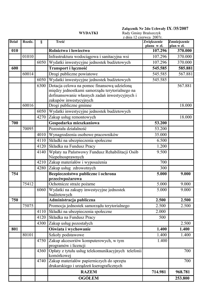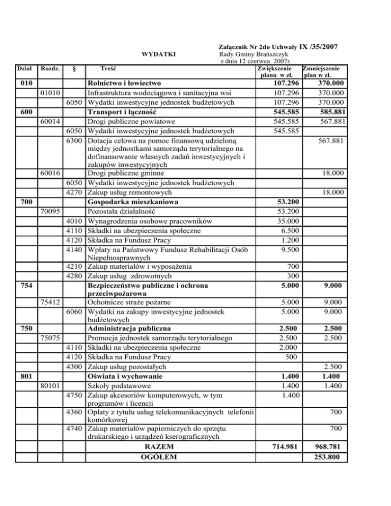 WYDATKI Dział Rozdz. § 010 01010 6050 600 60014 6050 6300 60016 6050 4270 700 70095 4010 4110 4120 4140 4210 4280 754 75412 6060 750 75075 4110 4120 4300 801 80101 4750 4360 4740 Treść Załącznik Nr 2do Uchwały IX /35/2007 Rady Gminy Brańszczyk z dnia 12 czerwca 2007r. Zwiększenie Zmniejszenie planu w zł. plan w zł. Rolnictwo i łowiectwo Infrastruktura wodociągowa i sanitacyjna wsi Wydatki inwestycyjne jednostek budżetowych Transport i łączność Drogi publiczne powiatowe Wydatki inwestycyjne jednostek budżetowych Dotacja celowa na pomoc finansową udzieloną między jednostkami samorządu terytorialnego na dofinansowanie własnych zadań inwestycyjnych i zakupów inwestycyjnych Drogi publiczne gminne Wydatki inwestycyjne jednostek budżetowych Zakup usług remontowych Gospodarka mieszkaniowa Pozostała działalność Wynagrodzenia osobowe pracowników Składki na ubezpieczenia społeczne Składka na Fundusz Pracy Wpłaty na Państwowy Fundusz Rehabilitacji Osób Niepełnosprawnych Zakup materiałów i wyposażenia Zakup usług zdrowotnych Bezpieczeństwo publiczne i ochrona przeciwpożarowa Ochotnicze straże pożarne Wydatki na zakupy inwestycyjne jednostek budżetowych Administracja publiczna Promocja jednostek samorządu terytorialnego Składki na ubezpieczenia społeczne Składka na Fundusz Pracy Zakup usług pozostałych Oświata i wychowanie Szkoły podstawowe Zakup akcesoriów komputerowych, w tym programów i licencji Opłaty z tytułu usług telekomunikacyjnych telefonii komórkowej Zakup materiałów papierniczych do sprzętu drukarskiego i urządzeń kserograficznych RAZEM OGÓŁEM 107.296 107.296 107.296 545.585 545.585 545.585 370.000 370.000 370.000 585.881 567.881 567.881 18.000 18.000 53.200 53.200 35.000 6.500 1.200 9.500 700 300 5.000 9.000 5.000 5.000 9.000 9.000 2.500 2.500 2.000 500 2.500 2.500 1.400 1.400 1.400 2.500 1.400 1.400 700 700 714.981 968.781 253.800 Uzasadnienie: Dział 010 Rolnictwo i łowiectwo Wydatki inwestycyjne Modernizacja Stacji Uzdatniania Wody w miejscowości Trzcianka Zwiększenie planu środki własne kwota 88.296zł. Plan po zmianach 470.000zł. Zmniejszenie planu dot. pożyczki z WFOŚ i GW w Warszawie 370.000zł. Plan po zmianach 800.000zł. Modernizacja Stacji Uzdatniania Wody -Poręba we wsi Poręba Średnia gm.Brańszczyk zwiększenie planu kwota 19.000zł. Dział 600 transport i łączność Rozdz.60014 Drogi publiczne powiatowe-zwiększenie planu wydatków inwestycyjnych Wydatki inwestycyjne ,,Budowa kanalizacji deszczowej w miejscowości Brańszczyk ul.Jana Pawła II i ul.Chopina -przy drodze powiatowej Nr 4403 w miejscowości Brańszczyk o planowanej długości 800mb. Kwota 545.585zł. Wydatki w zakresie modernizacji i odnowy dróg powiatowych paragraf 6300 Zmniejszenie planu o kwotę 567.881zł. Plan po zmianach 258.119zł. w tym: odcinek drogi powiatowej oznaczonej nr 4403 Brańszczyk -Niemiry-Knurowiec o planowanej długości 1.400mb. kwota 96.740zł. odcinek drogi powiatowej oznaczonej nr 4405 Poręba Kocęby -Udrzynek-Tuchlin o planowanej długości 2.200mb. kwota 161.379zł. Rozdz.60016 Drogi publiczne gminne Zmniejszenie w paragrafie 4270 kwota 18.000zł. Dział 700 Gospodarka mieszkaniowa -wydatki związane z zatrudnieniem pracowników na robotach publicznych w tym: Wynagrodzenia osobowe, pochodne od wynagrodzeń oraz wpłaty na PFRON kwota -52.200zł. § 4210Zakup odzieży roboczej -kwota 700zł. § 4280 -zakup usług zdrowotnych- kwota 300zł. Dział 754 Bezpieczeństwo publiczne i ochrona przeciwpożarowa Wydatki inwestycyjne Wykonanie zabudowy średniego samochodu ratowniczo-gaśniczego na podwoziu samochodu Star 266 dla potrzeb Ochotniczej Straży Pożarnej w Trzciance Zwiększenie planu środki własne kwota 5.000zł. Plan po zmianach 18.000zł. Zmniejszenie planu dot. pożyczki z WFOŚ i GW w Warszawie 9.000zł. Plan po zmianach 48.000zł. Dział 750 Administracja publiczna rozdz.75075 zwiększenie planu w paragrafach w tym: 4110 kwota 2.000zł. 4120 zł. kwota 500zł.-pochodne od umów zlecenia. Zmniejszenie w paragrafie 4300 zakup usług pozostałych kwota 2.500zł. Dział 801 Oświata i wychowanie przeniesienia w paragrafach w tym: zmniejszenie planu w §4360 kwota 700zł.i w § 4740 kwota 700zł. zwiększenie planu w § 4750 -Zakup materiałów papierniczych do sprzętu drukarskiego i urządzeń kserograficznych kwota 1.400zł. PSP w Trzciance